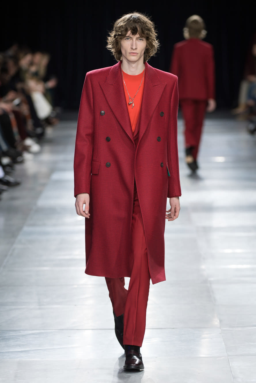 オープニングは和装で登場。前半戦で着用していたグリーンのベロア素材のジャケットも印象的でしたね。後半戦では「ポール・スミス(Paul Smith)」の2018-19年秋冬コレクションのコートを着用。白のパンツと合わせて"紅白感"のあるコーディネートです。