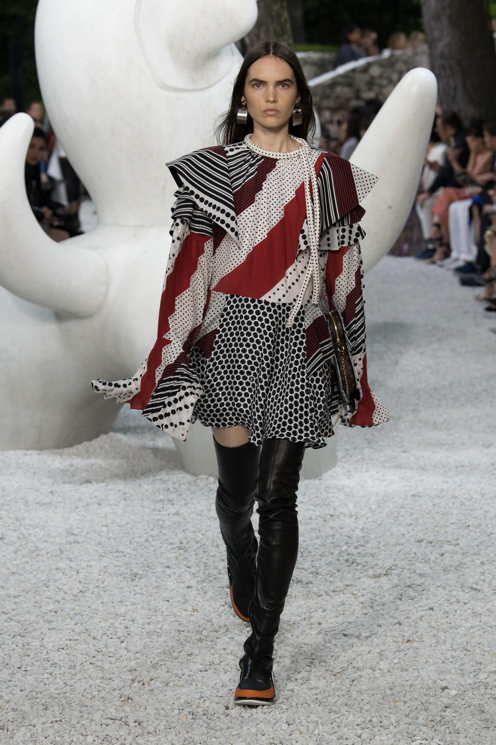 紅組司会に抜擢された女優の広瀬すずさん。オープニングは艶やかな和装で登場しました。続いて「ルイ・ヴィトン(LOUIS VUITTON)」の2019年クルーズコレクションのワンピースとアンクルブーツを着用。ガーリーな雰囲気が広瀬さんにぴったりですね。