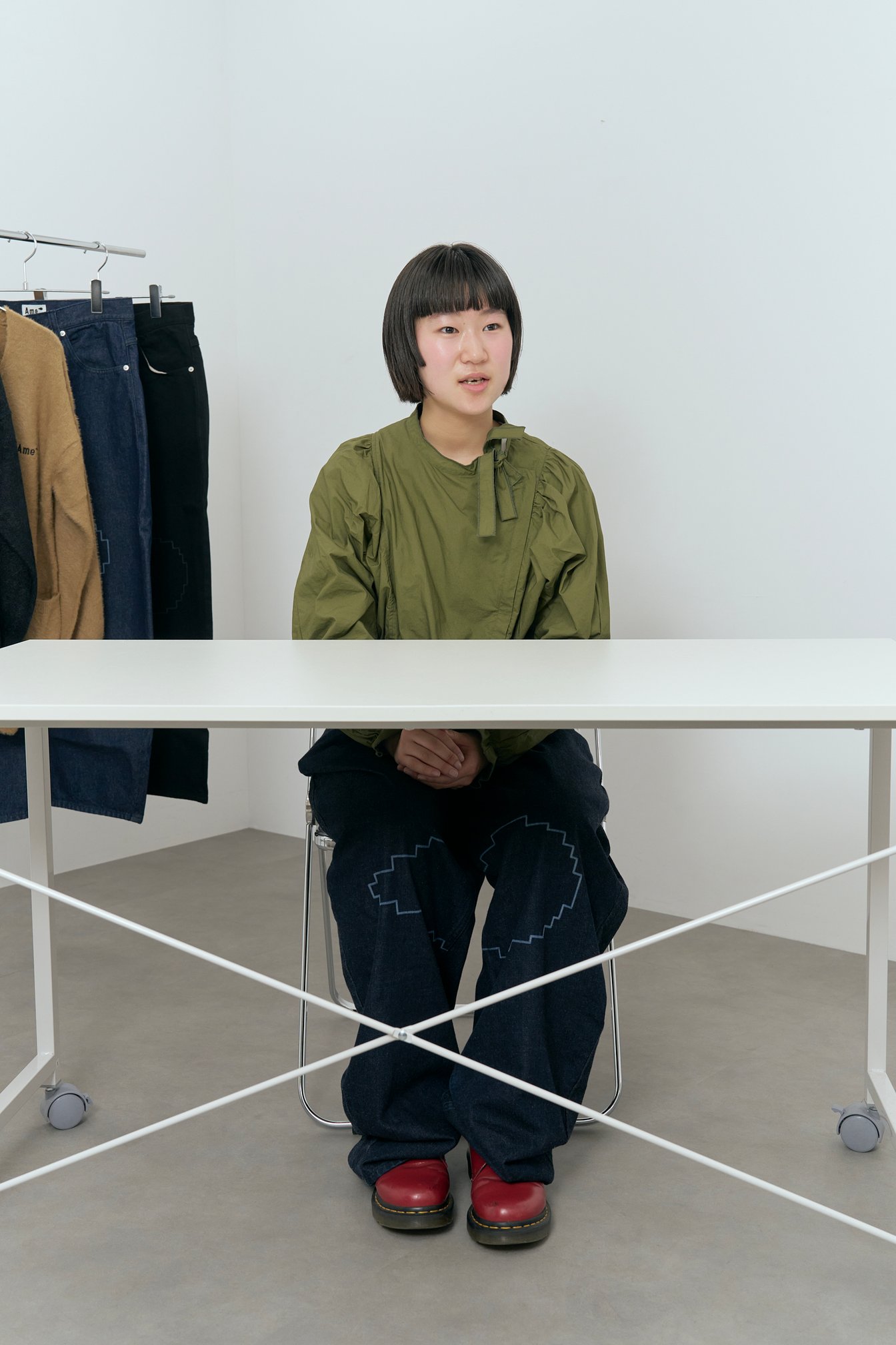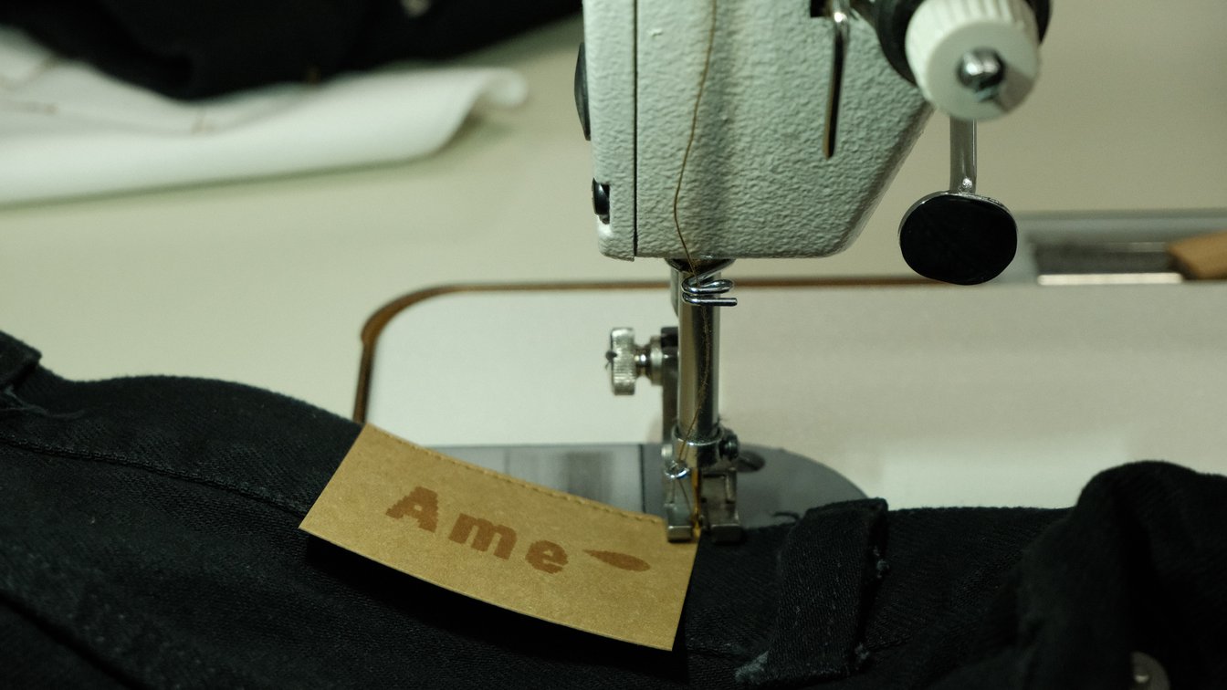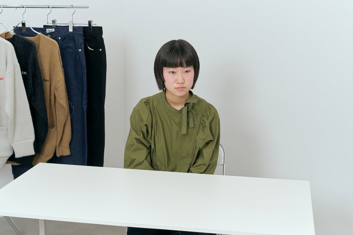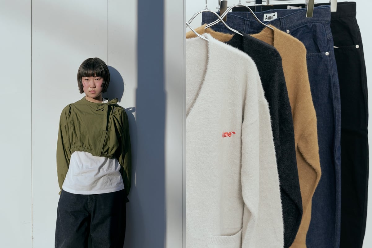 14歳で“ポジティブな不登校”を選択し、オンラインの高校とクリエイションスクール「GAKU」や「ここのがっこう(coconogacco)」に通いながら独学で服作りを学ぶ彼女は、17歳で自身のブランド「アメ(Ame)」を設立。サステナブルなジーンズを作るために自ら岡山・児島の工場に飛び込み、現場で手を動かしながら服作りとその背景を学ぶその視点は、等身大の純粋さとまっすぐさに貫かれつつも、冷静で鋭く本質を突いてもいる。ピュアな行動力と想像力をもって模索し世に問いかける、若きデザイナーの挑戦とその背景を訊ねた。