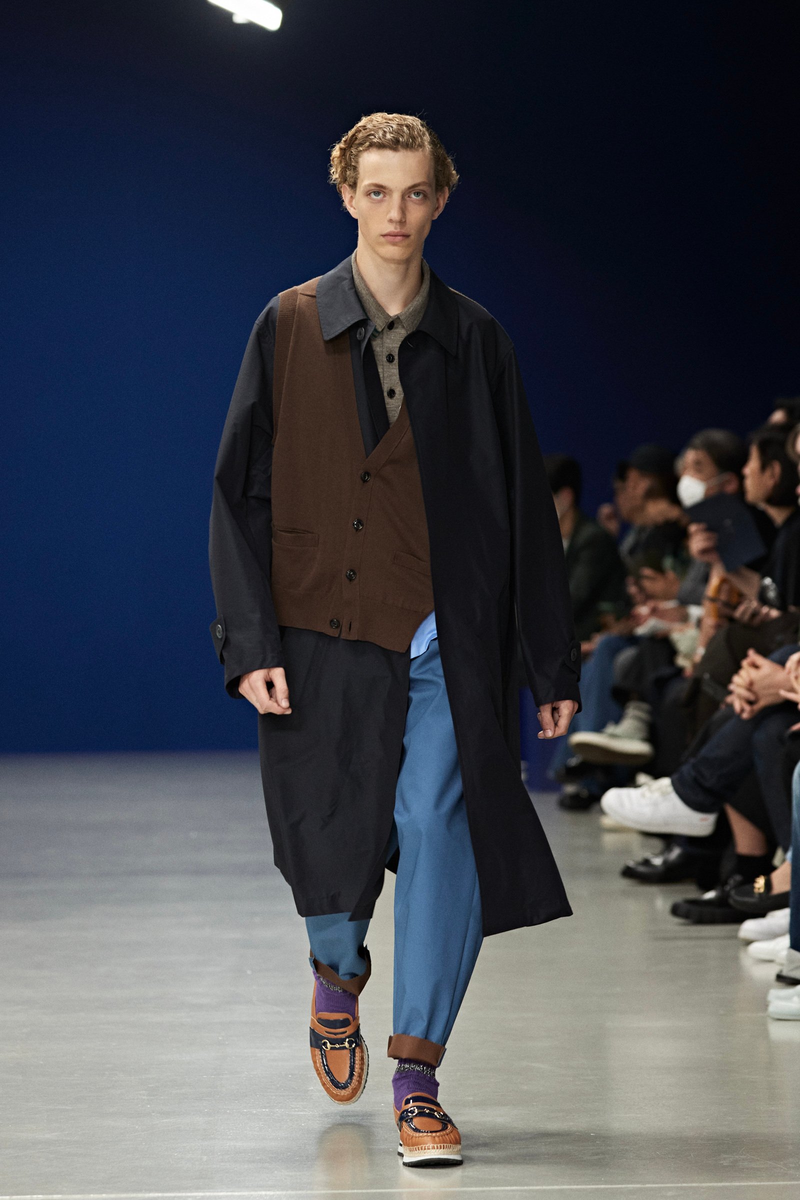ファーストルックは、スリーブレスコートをレイヤードしたウィメンズ。素材・色・ディテールのミックスから、カラーならではのバランス感覚が見て取れる。続くメンズルックは「世界一薄い」という3レイヤーの素材をベースとしたアウターに、メッシュの半袖ブルゾンが絡み合うようにドッキング。モデルのウォーキングによってふわりと軽やかになびき、軽快なBGMとともに余韻を残す。