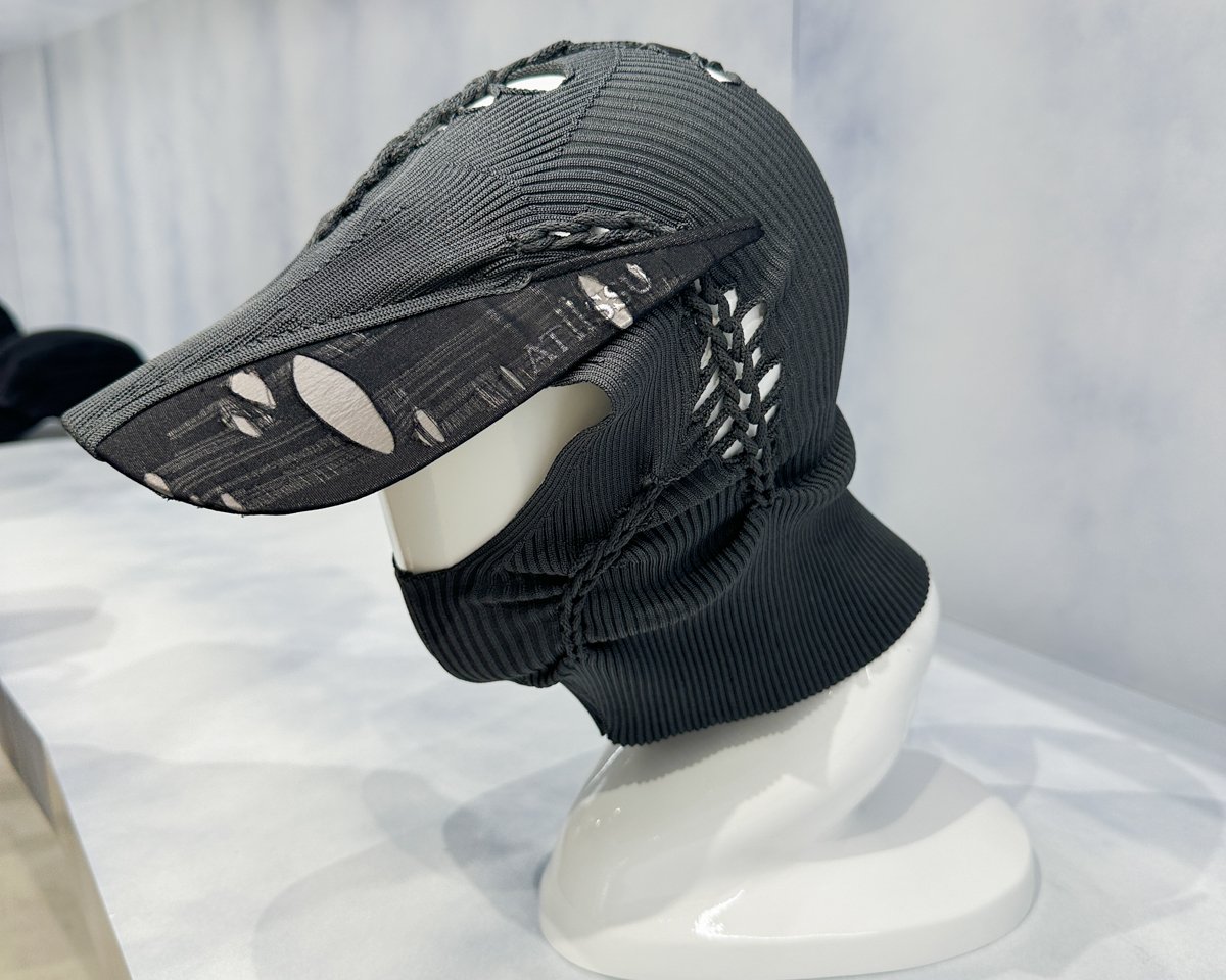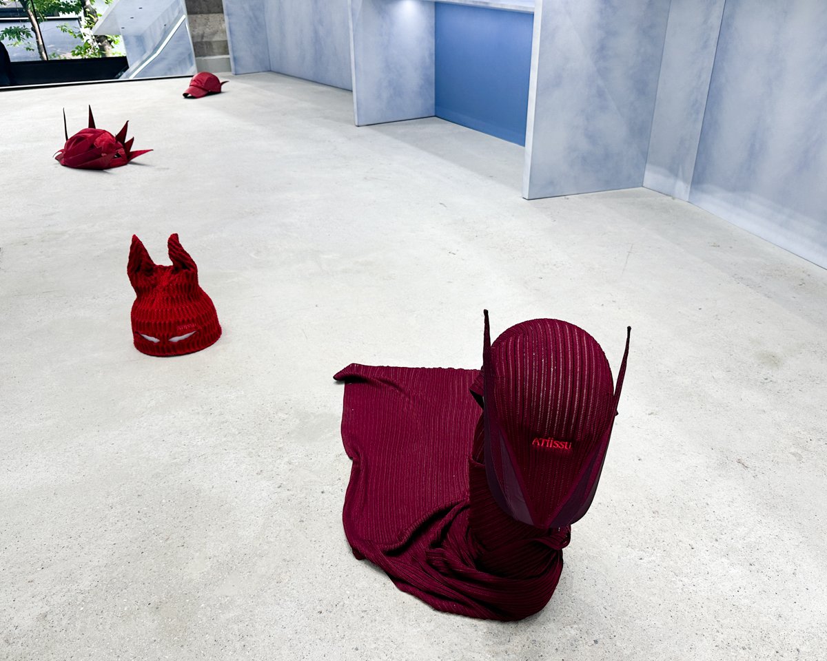 旗艦店は2階建てで、剥き出しの建築資材が特徴的なコンセプチュアルな空間を演出。店内にはさまざまなオブジェやキーヴィジュアル、非売品のディスプレイピースといった、ブランドの世界観に浸れるような要素が至る所に。店舗では100点以上のヘッドウェアを販売中。広々とした空間で、大型の姿見鏡がいくつもあるため、自由に試着できます。