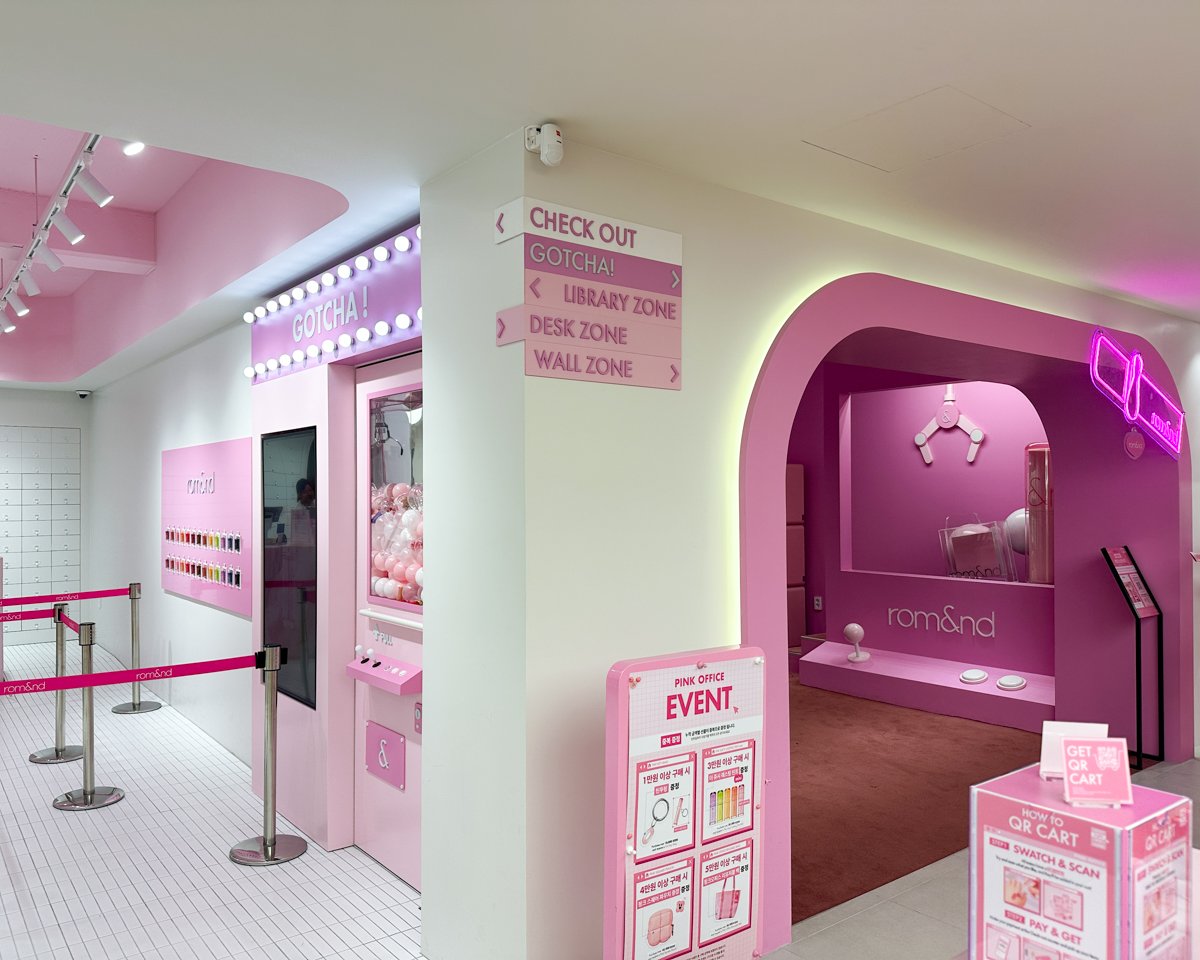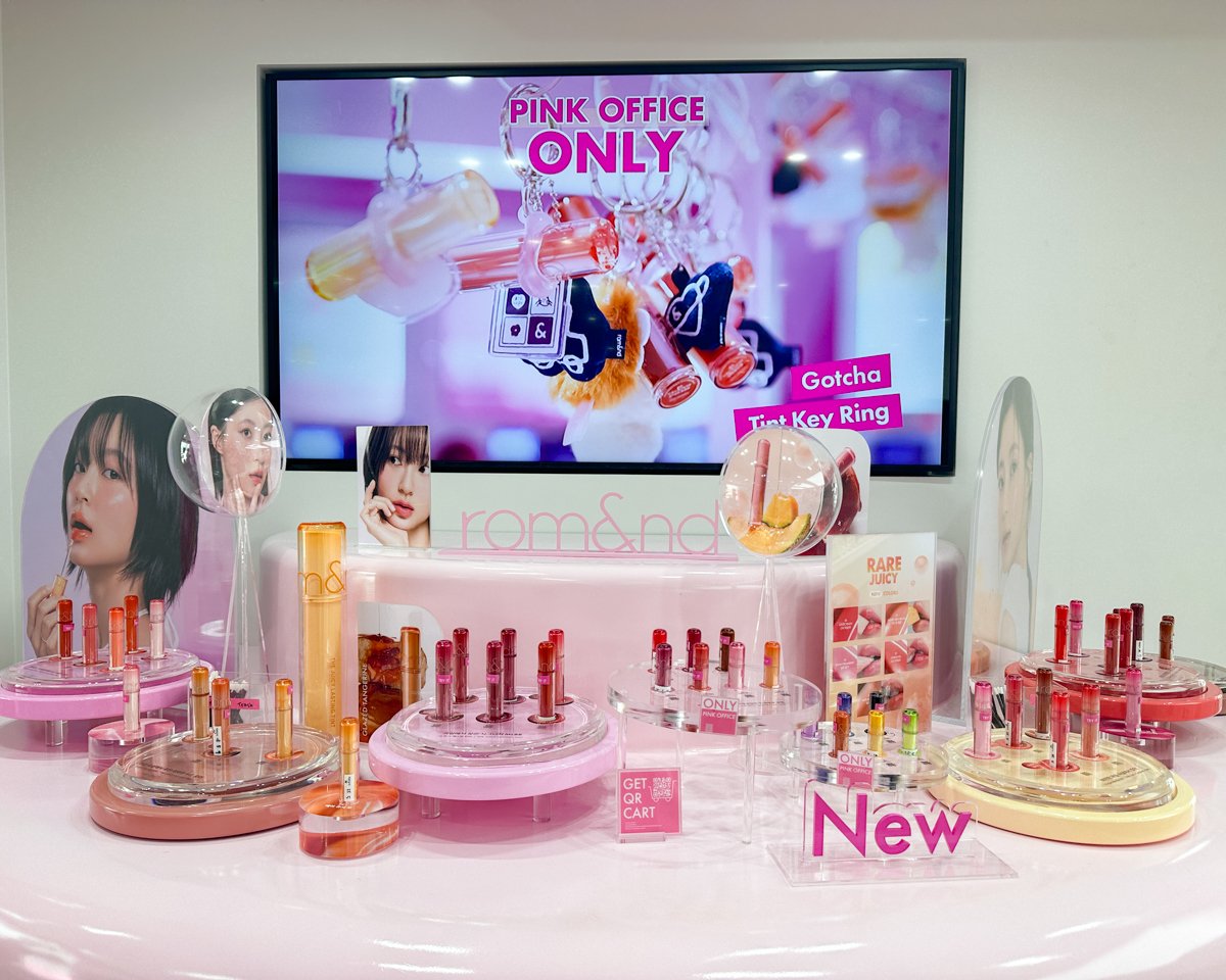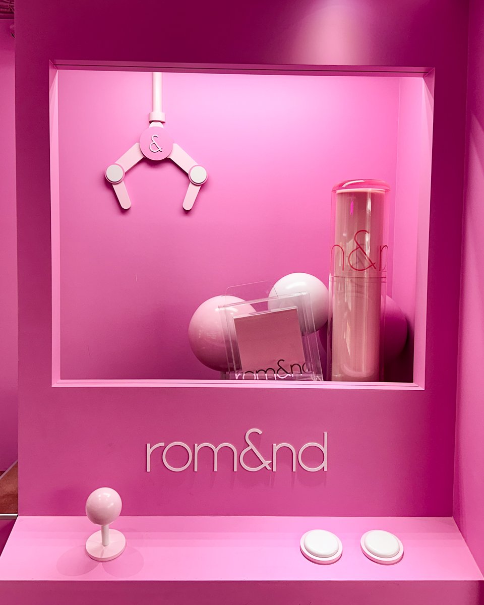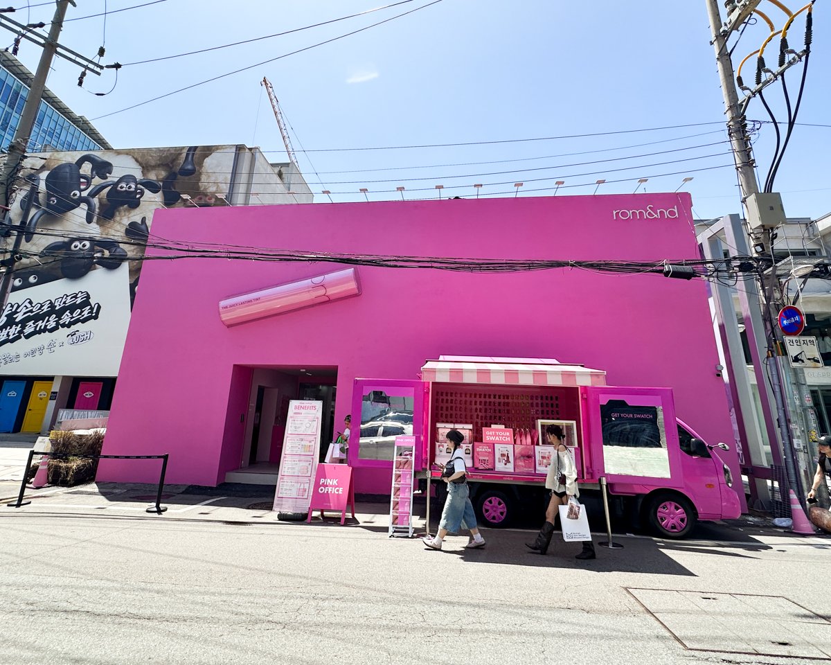 アモーレ聖水から10分弱で、2025年5月にできたばかりの「ロムアンド(rom&nd)」初のフラッグシップストア「ピンクオフィス」に到着。店舗前のキッチンカーが目印!200種類以上のロムアンド製品が揃えられ、日本未上陸のアイテムも多く、どこよりも早く自由に試すことができます。専門スタッフによるパーソナルカラーに合わせたコスメ選びや、リップ作り体験といった独自コンテンツを用意。