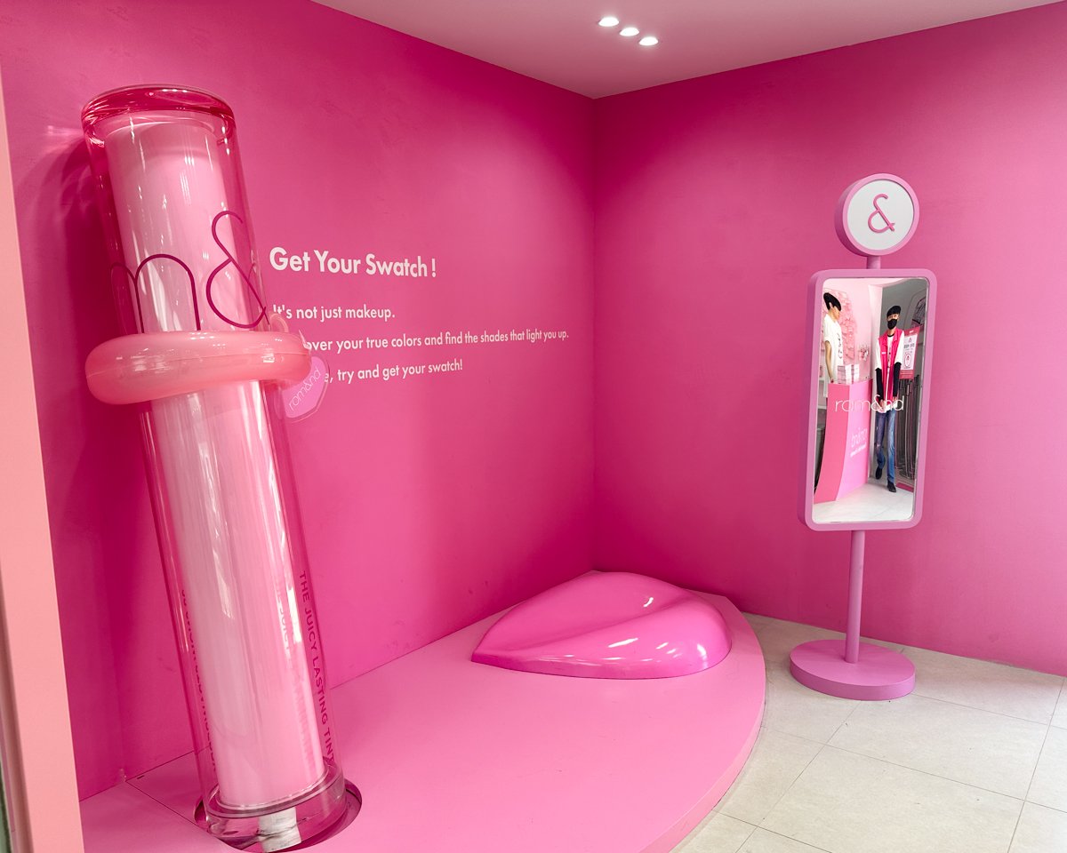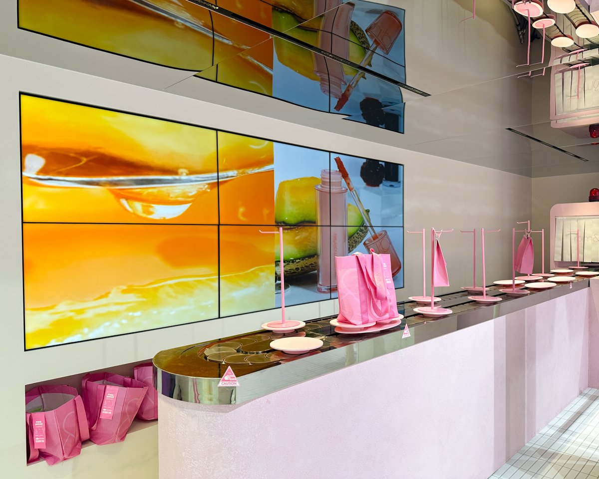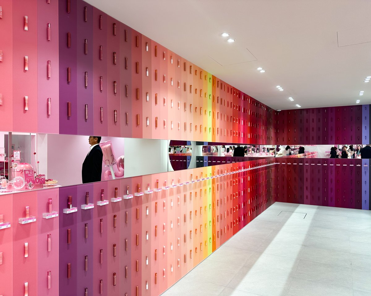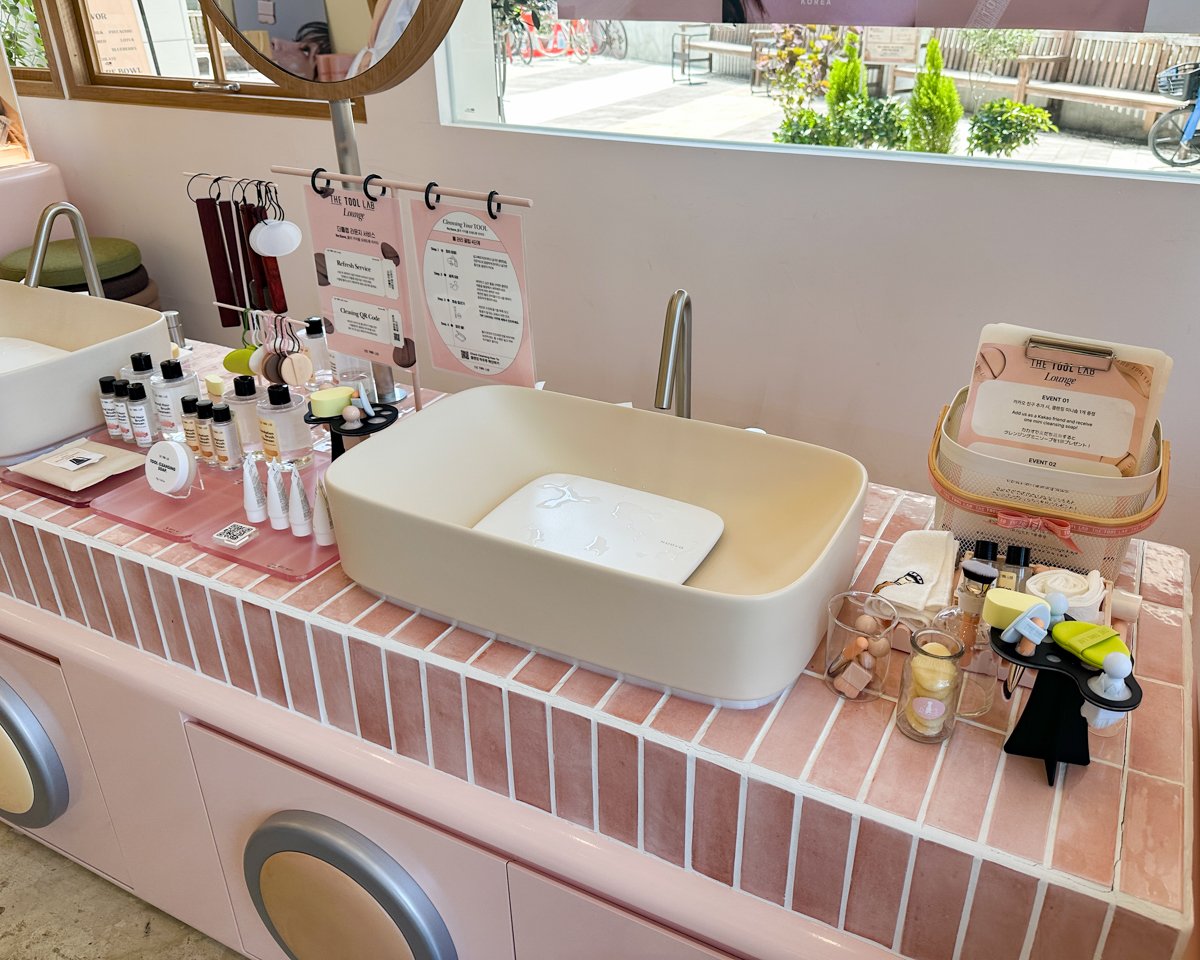 アモーレ聖水から10分弱で、2025年5月にできたばかりの「ロムアンド(rom&nd)」初のフラッグシップストア「ピンクオフィス」に到着。店舗前のキッチンカーが目印!200種類以上のロムアンド製品が揃えられ、日本未上陸のアイテムも多く、どこよりも早く自由に試すことができます。専門スタッフによるパーソナルカラーに合わせたコスメ選びや、リップ作り体験といった独自コンテンツを用意。