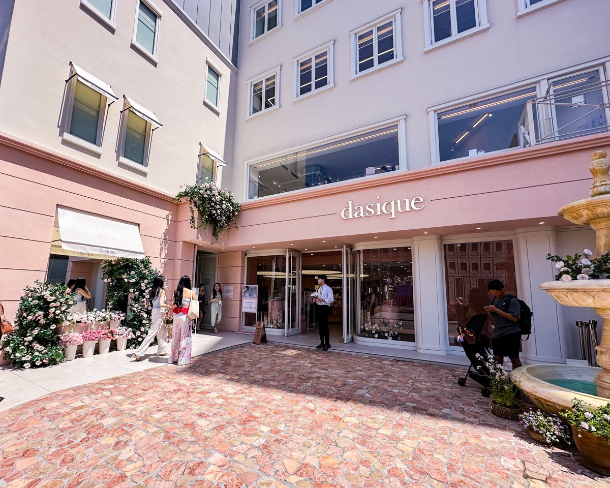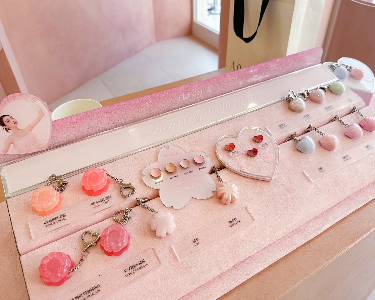 「デイジーク(dasique)」の旗艦店は3階建てでカフェを併設。「Blooming your own beauty ~ 自分だけの美しさを咲かせる」というブランドコンセプトを反映させた、ロマンチックなピンクで統一された乙女心をくすぐるような空間です。ここでしか購入できないハート型のチーク「スフレカラーパット」をはじめ、9色を選べるDIYアイシャドウパレット「シャドウ パレット DIY」など、店舗だからこそのアイテムがずらり。購入特典のキーチャームコスメも好きなデザインが選べます。