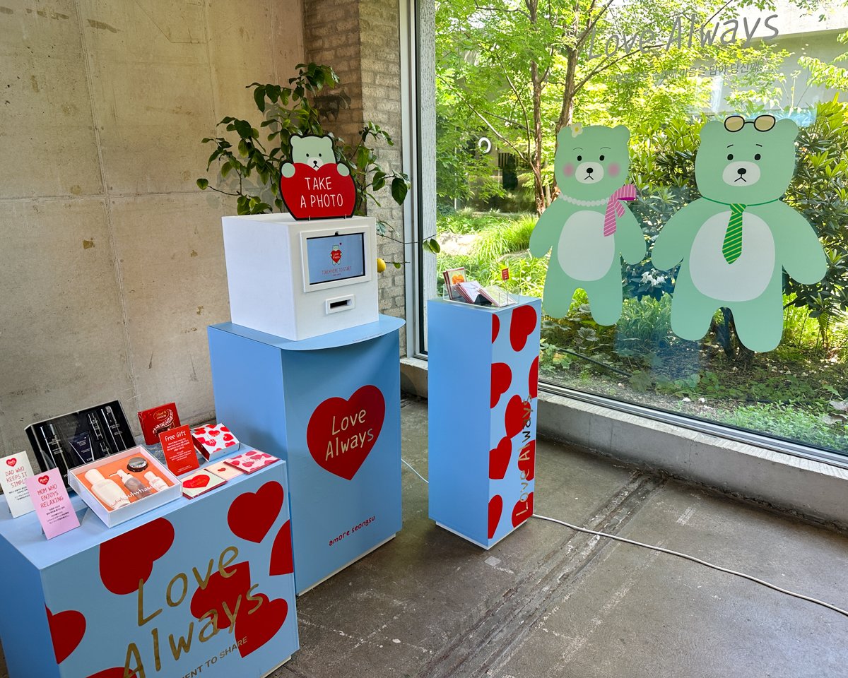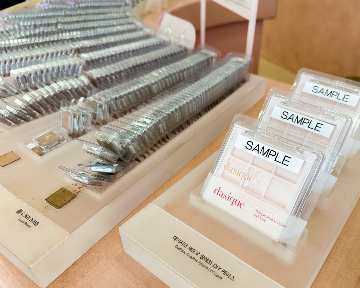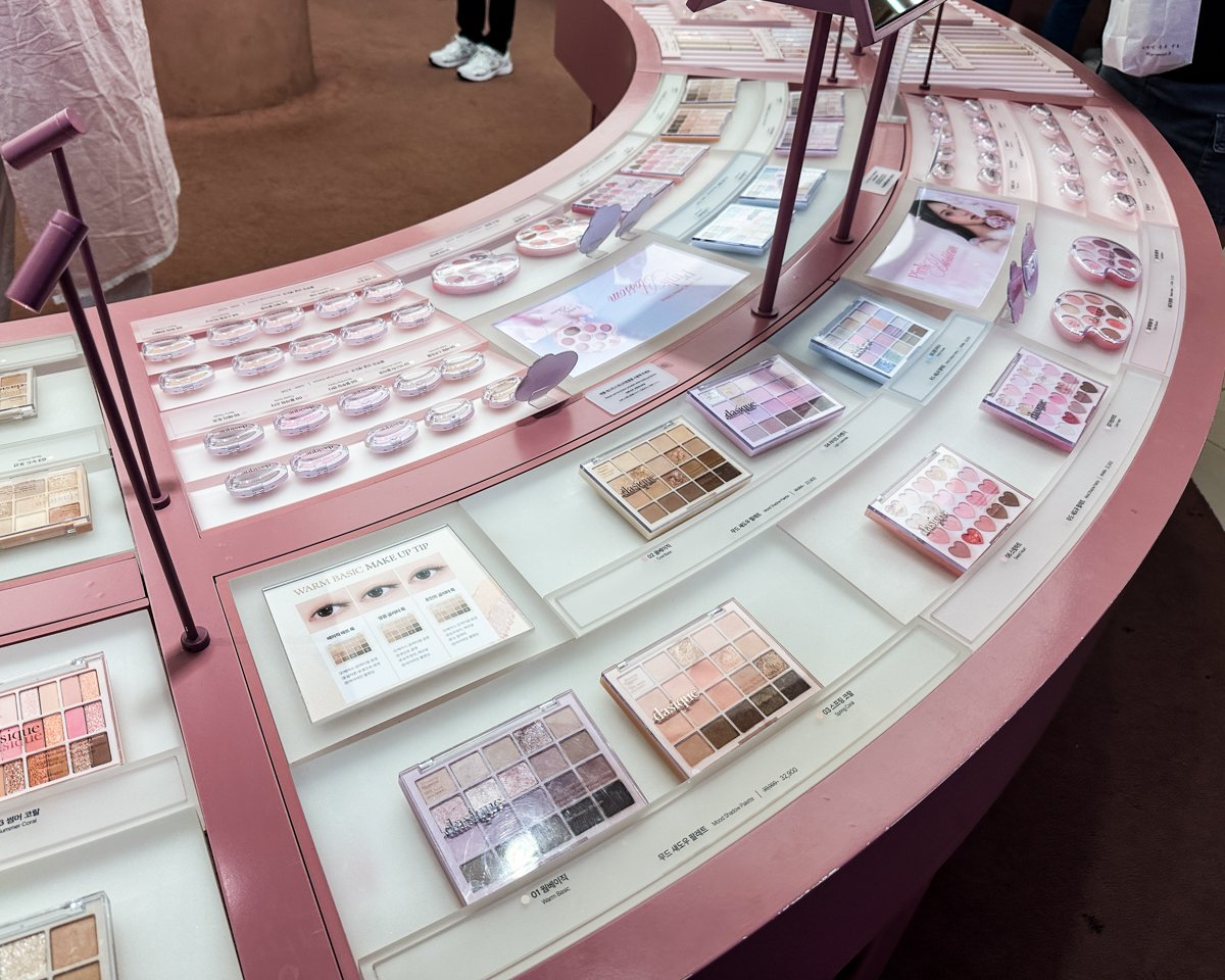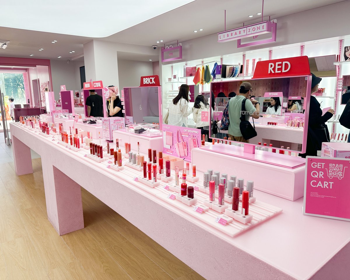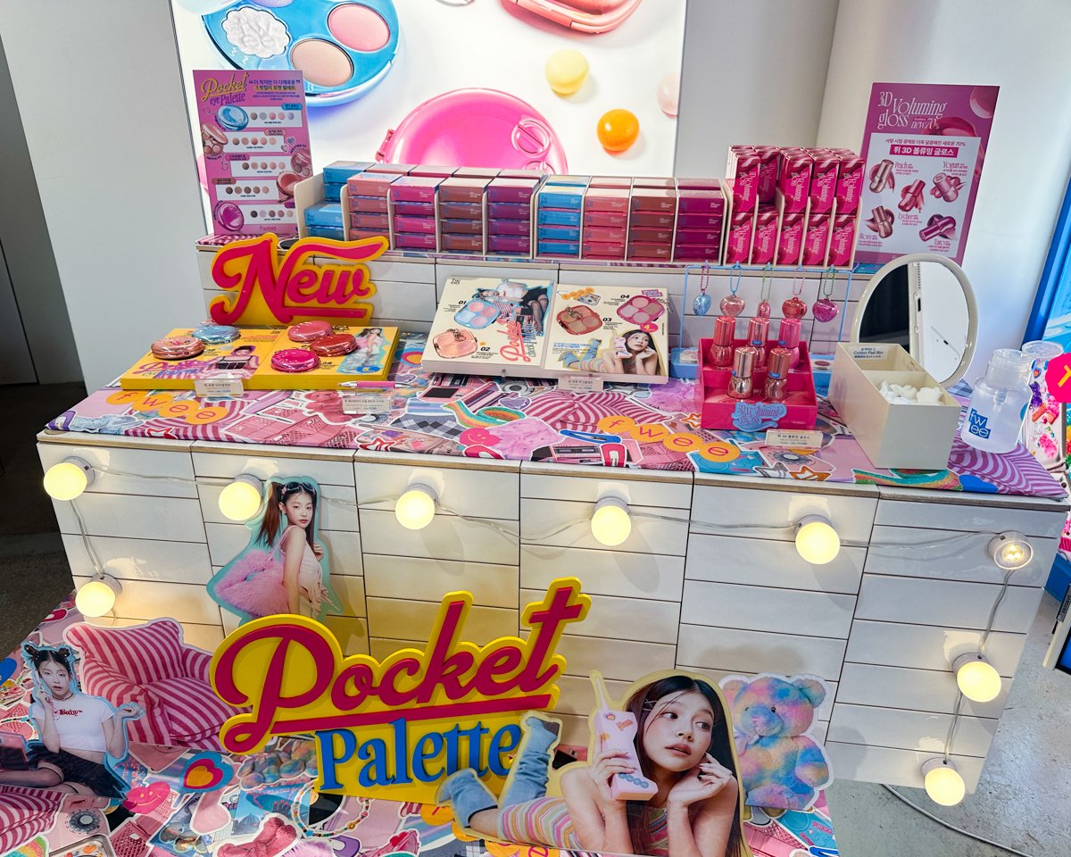 広々とした店内には、SNSでバズった「リップアンドチーク ブラーリープリンポット」や「3Dボリューミンググロス」のほか、キーチャーム付きの「ポケットアイパレット」や「ポケットチークパレット」など、全商品をフルラインナップで展開。購入者特典も多様なので、つい色々なアイテムを買い集めたくなります。