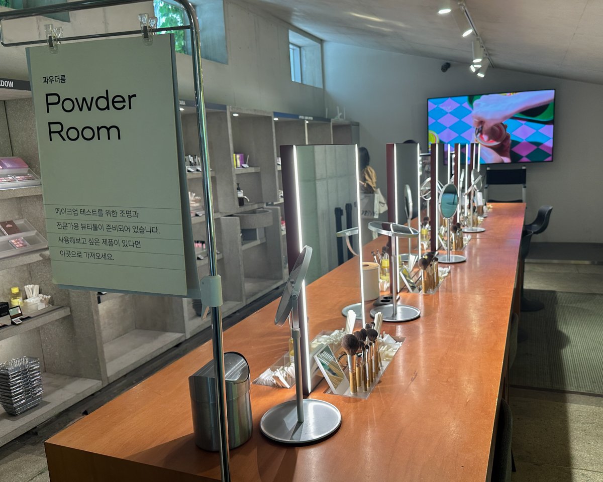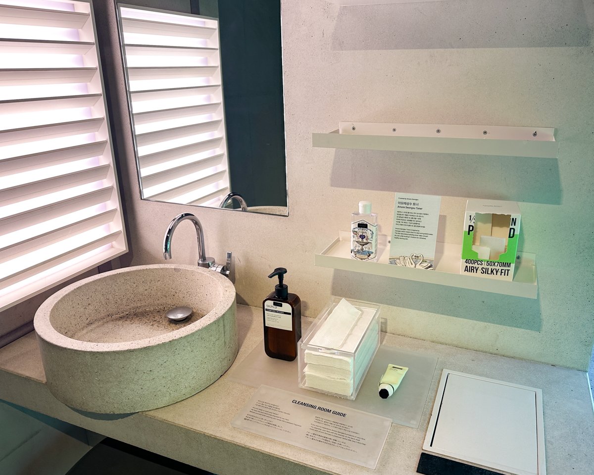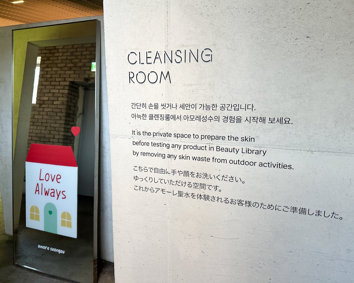 クレンジングルームを完備し、さまざまなブランドのクレンジング・洗顔を顔や手元で試すことができます。広々としたメイクルームでアモーレ系列のブランドから好きなものが使えるので、クレンジング・スキンケア・メイクまで、この店舗で体験可能。