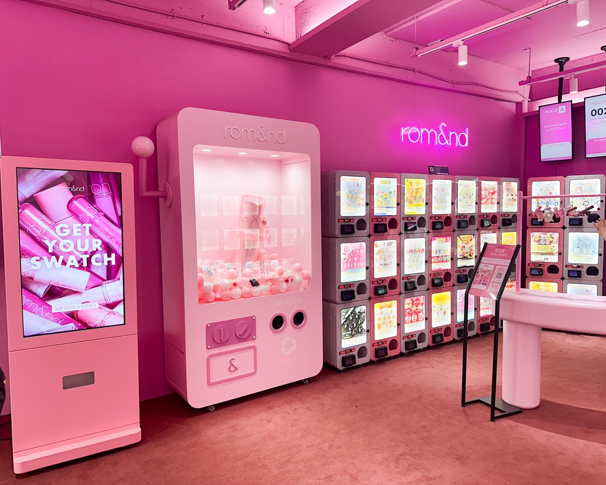 至る所にフォトスポットがあり、“リップウォール”など映える写真が撮れること間違いなしです。店内の奥にはガチャガチャコーナーを展開。日本のキャラクターや、ロムアンドのキャラクターのキーホルダー、ミニコスメなどをゲットできます。