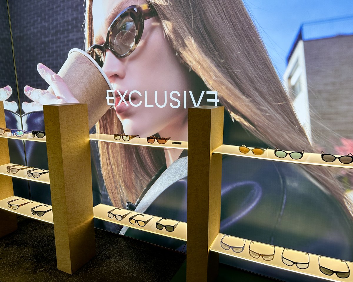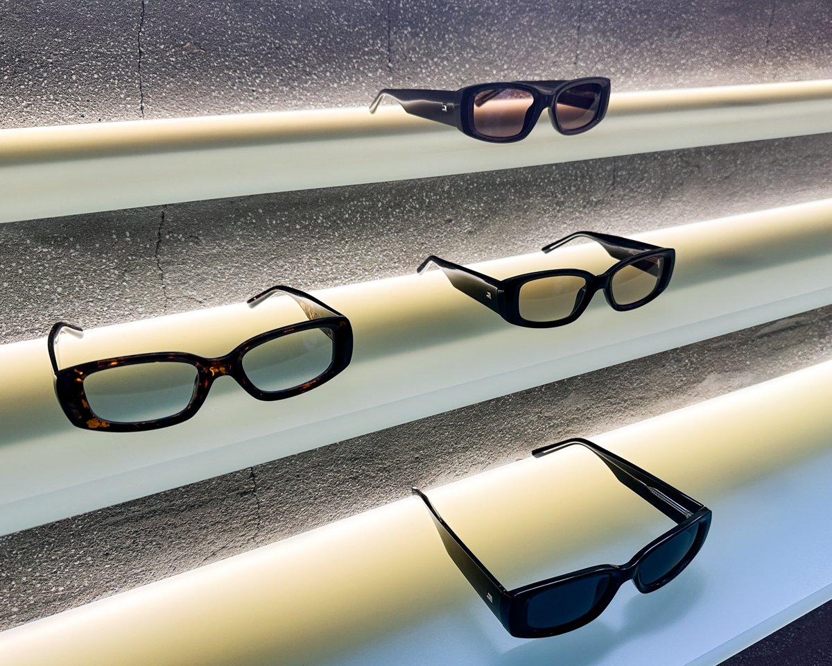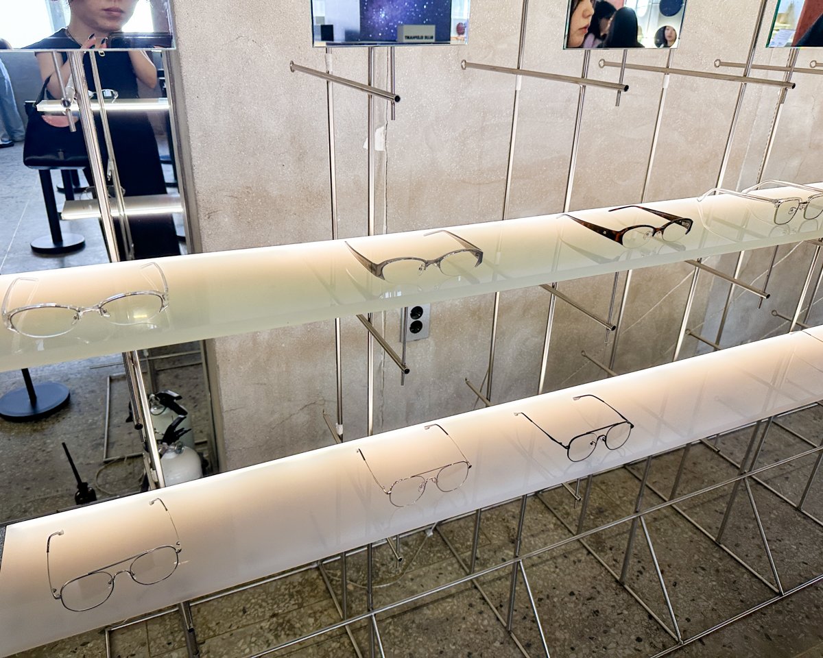 店内はコンクリートを基調としたソリッドなデザインで、コンセプチュアルなオブジェも。リムレス型やキャットアイ型、オーバル型などのサングラスや、メタルフレームのアイウェアといったトレンドのアイウェアが多数。購入希望のモデルの品番をスマートフォンなどで撮影し、レジで提示して購入できるため、言語に不安がある人でもスムーズに買い物ができます。