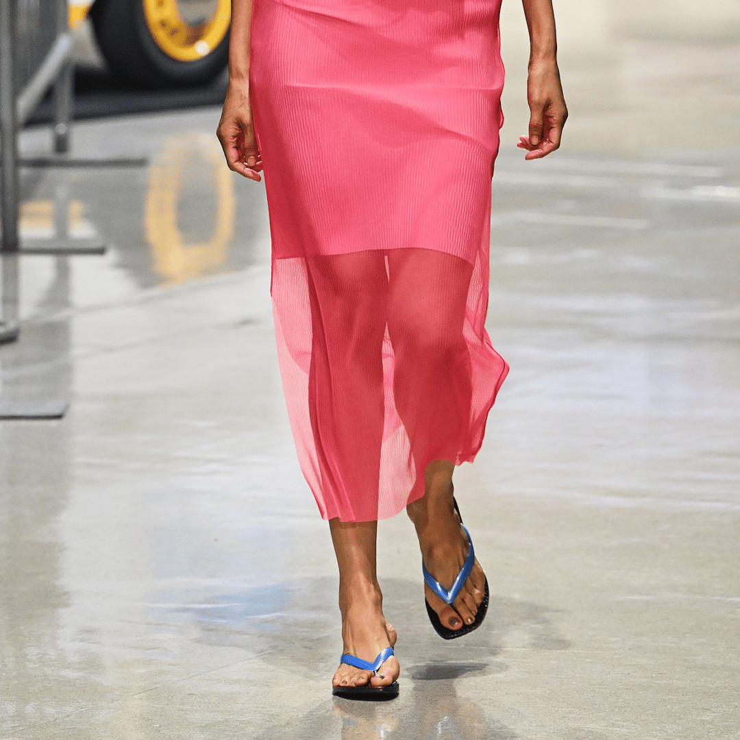 ビーチサンダルを履いている7人のモデルにフットネイルを施しました。スタイリングとのバランスをとりながら、目立ちすぎずアクセントになるようワンカラーを基本とし、着用している服の色みを拾ってカラーをセレクトしています。仕上がりはマットをベースにしていますが、シースルーの衣装を着ている数人にはラメを取り入れるなどで調整しています。