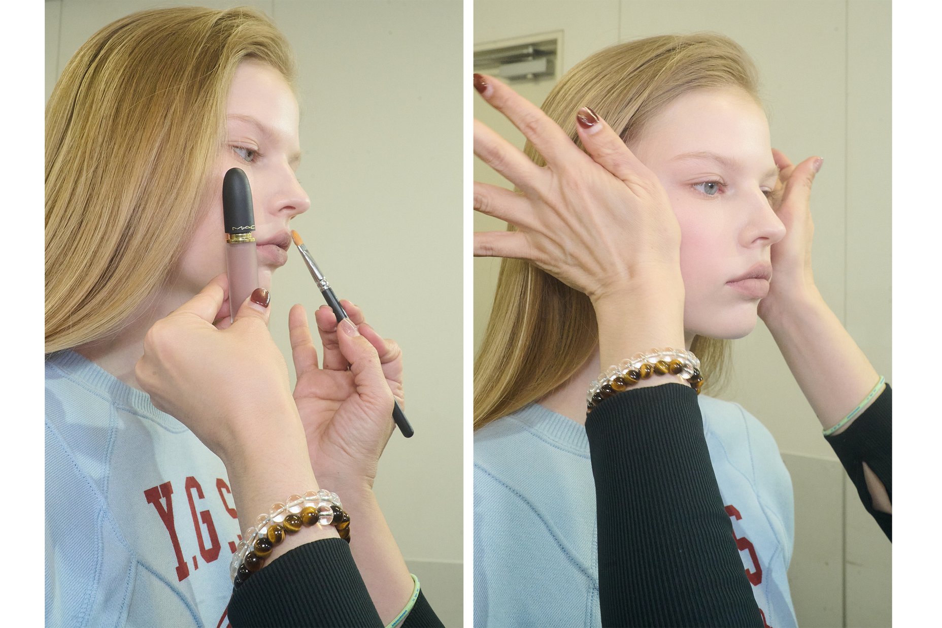「M•A•C パウダー キス リップ + チーク ムース」です。カラーバリエーションが豊富ですが、中でもニュートラルな色をメインでリップとチークに使用しました。例えば「950 イッツパーソナル」。少量を手のひらの下半分になじませ、頬を優しく包み込むようにのせます。ツヤでもマットでもないという使用感が肌の質感にフィットする。短い時間で美しく仕上がるというところも使いやすいですね。