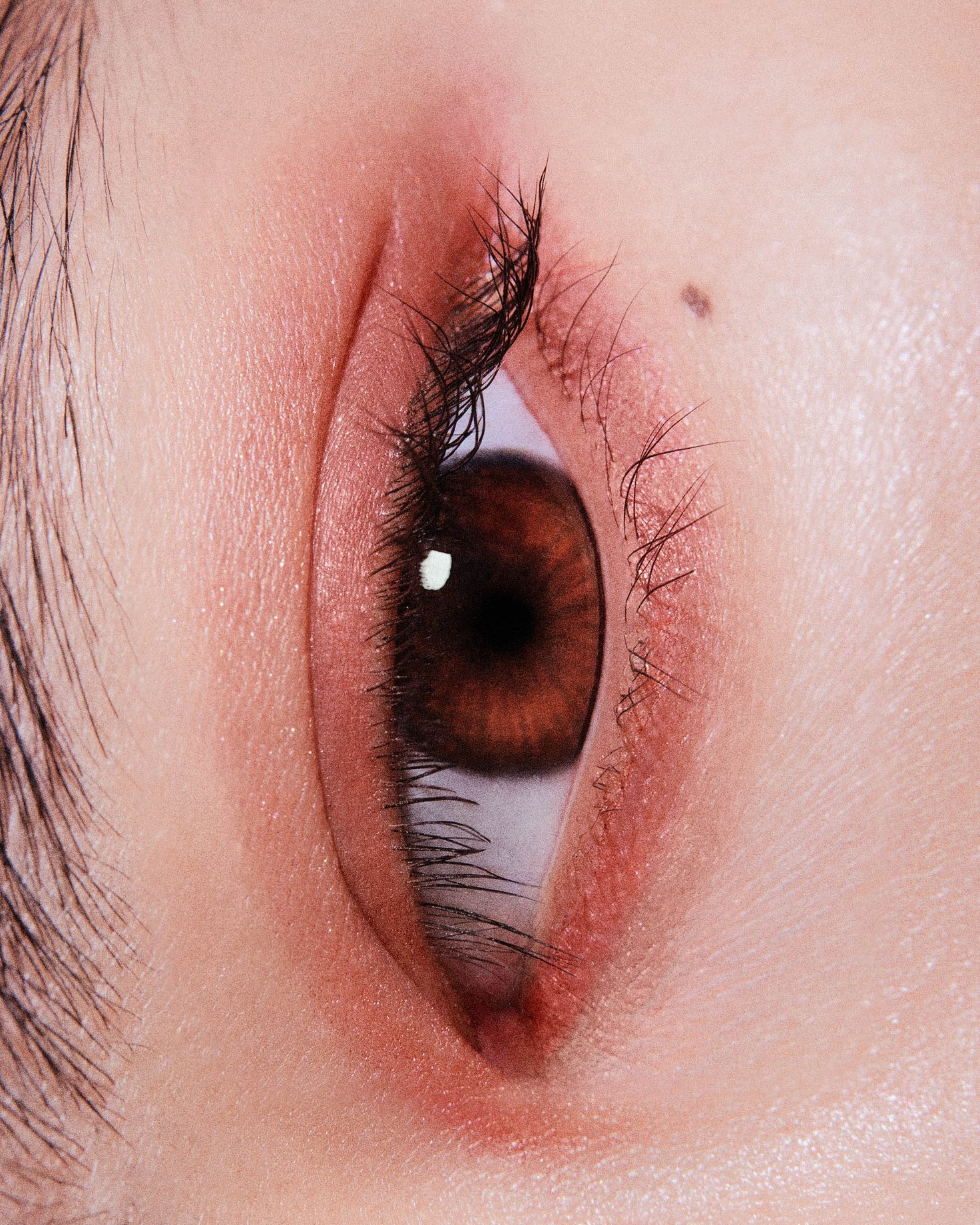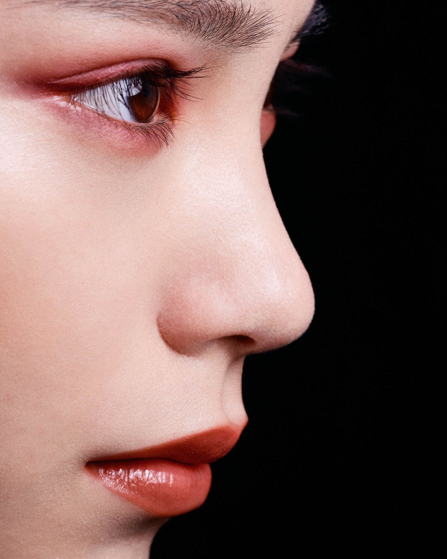 レッドのアイシャドウといえば、目の形や塗り方によって腫れぼったくも見えがちだが、「896 モノグラム・ルージュ」のレッドは透明感のあるグレイッシュなニュアンスを含むため、膨張しにくく、肌色も選ばない。じんわりとした血色が宿り、チークレスであっても顔全体の印象がトーンアップ。締め色なしで、不思議とメリハリのある顔立ちに。