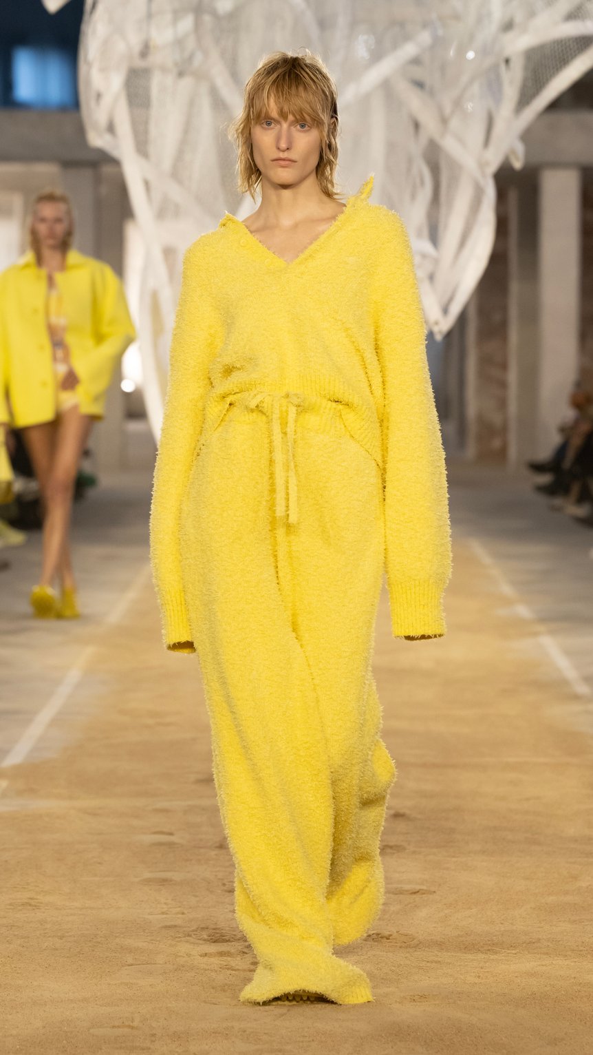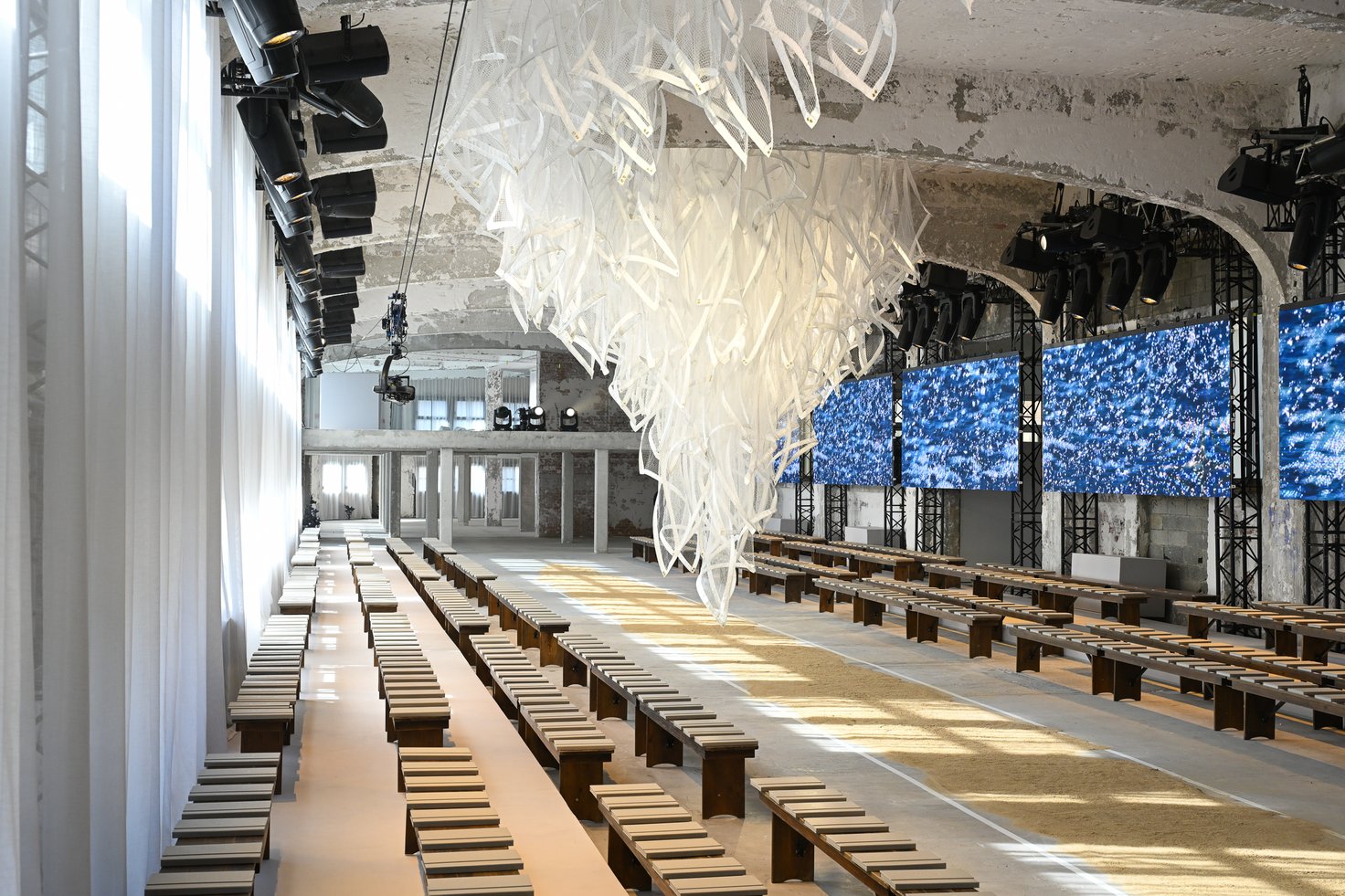 会場となったのは、ラコステのショーを最後に取り壊されるパリ10区に位置する旧ベルジェール・トルデーヌ電話交換所(Le central téléphonique Bergère)。コレクションにインスピレーションを与えた1920年代の建物内には、波の映像と音が流され、ランウェイには砂が敷かれた。会場中央には、英アーティストのスージー・マクマレー(Susie MacMurray)によるテニスネットで作った巨大アート作品が設置された。