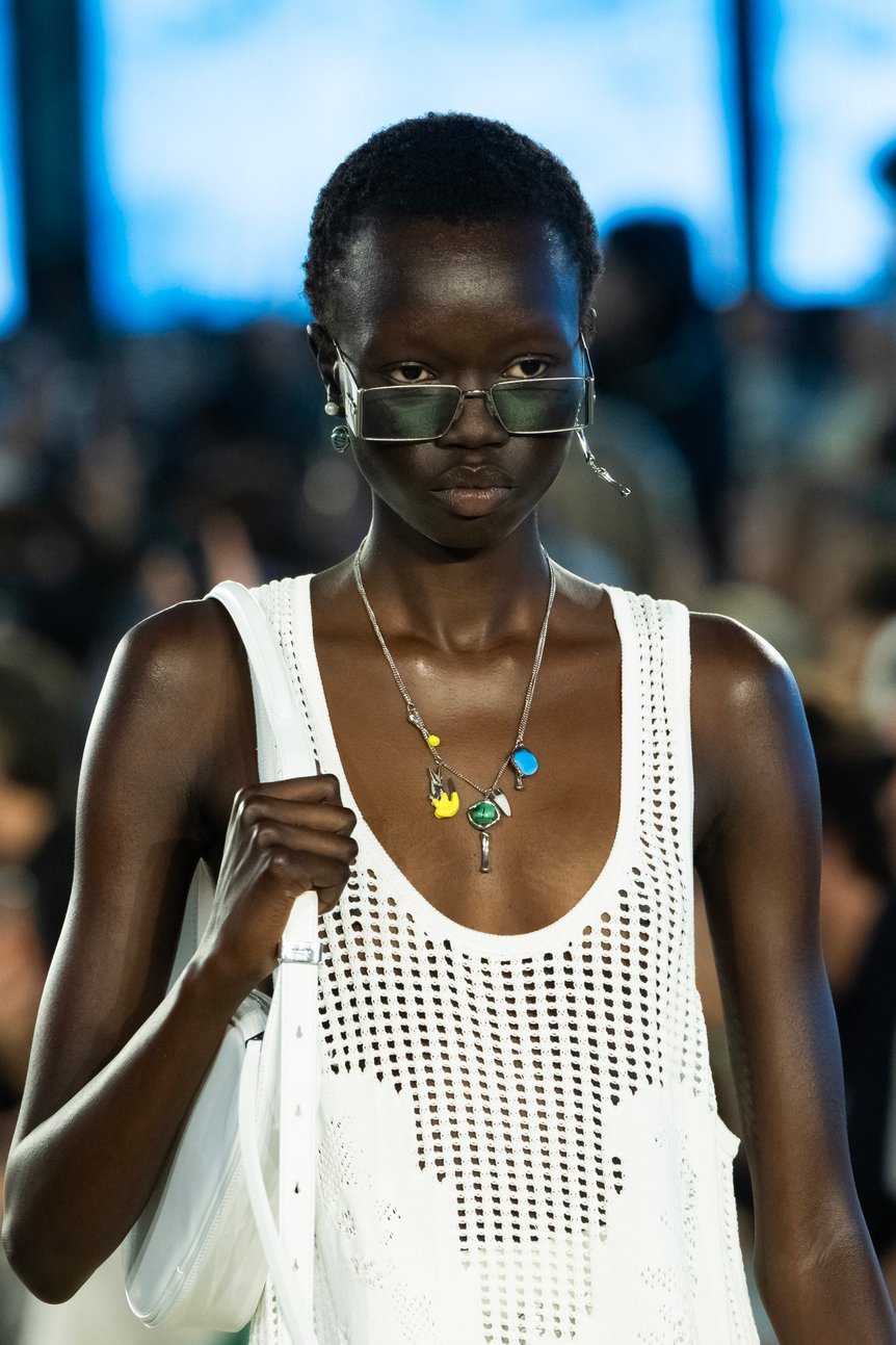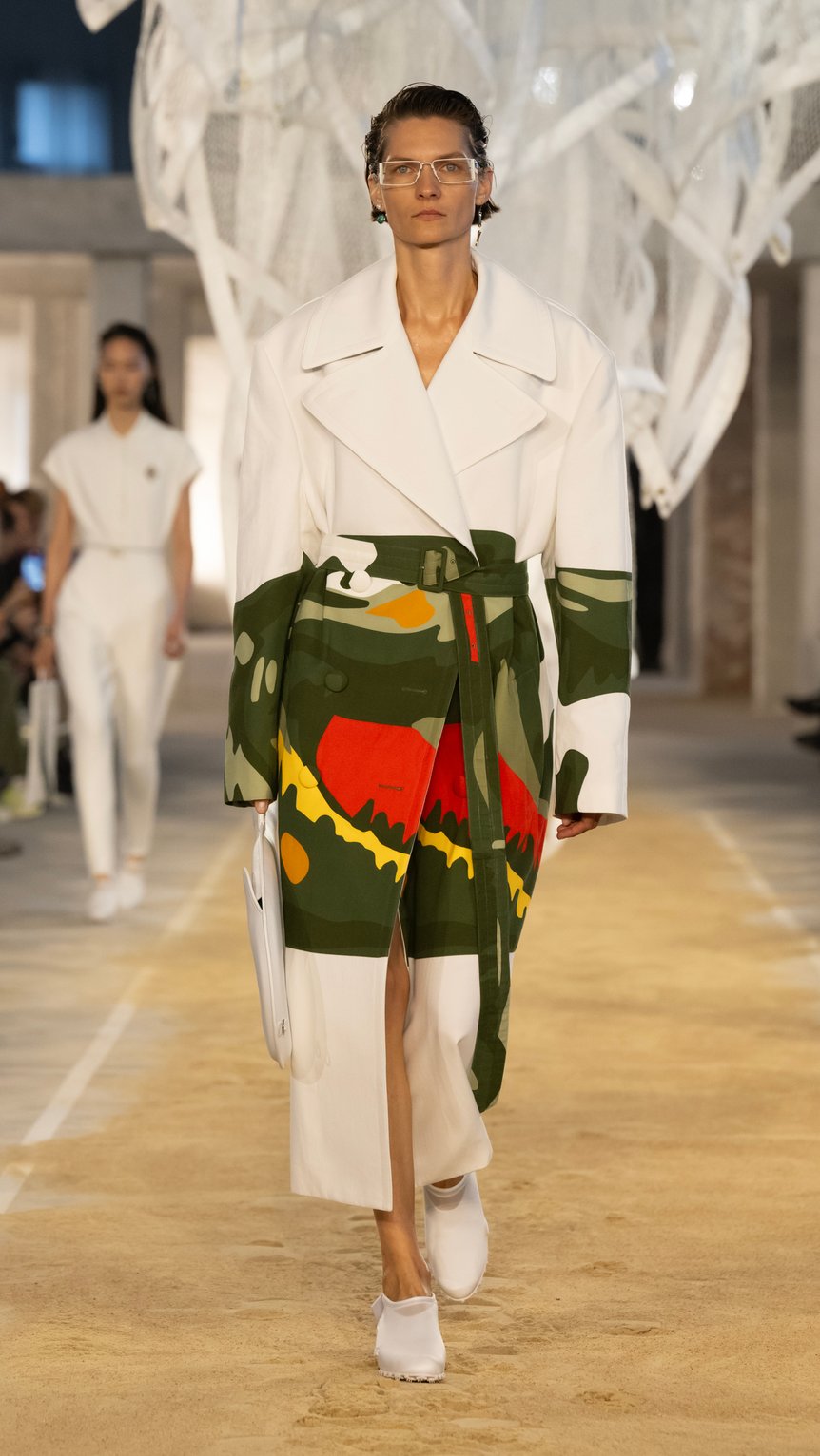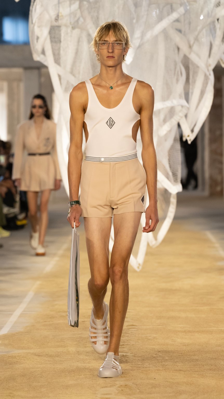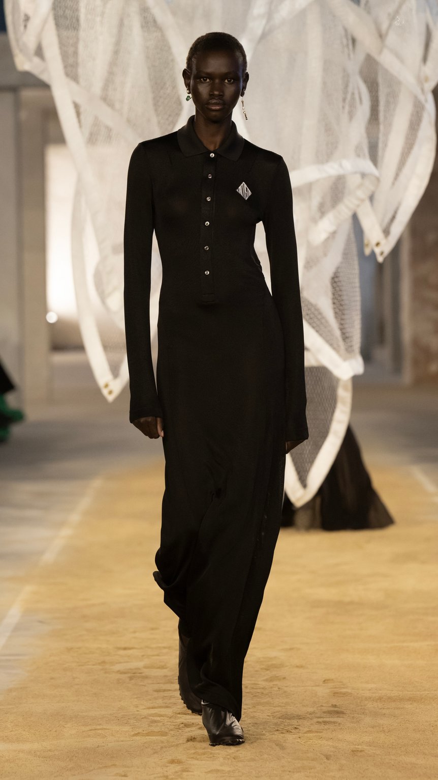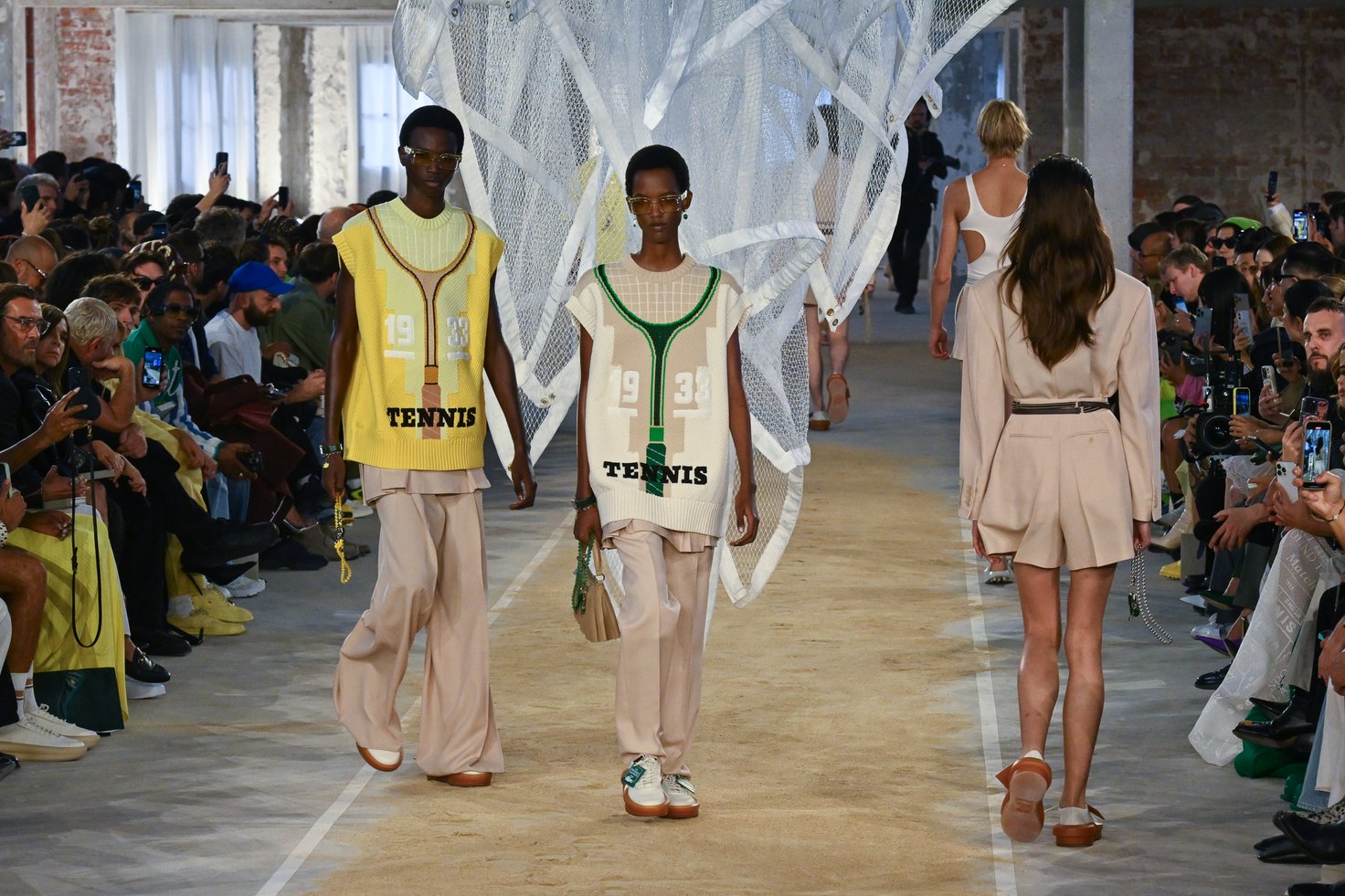 コレクションでは、フォーマルとカジュアル、スポーツとレジャーのバランスを取った多機能なワードローブを多数展開。クレーコートから海辺へ、さらに夏のパーティーへと流れるようにルックが披露された。ディテールでは、ルネの親友でテニスプレイヤーのスザンヌ・ランラン(Suzanne Lenglen)に敬意を表したプリーツに加え、カットアウトやランジェリーデザインが多く見られ、ラコステの1920〜30年代のロンパース型水着やビーチウェアを引用したアイテムや、Vネックのデコルテが印象的なドレスやポロシャツがアクセントとなっている。コロトロスはブランドの原点に立ち返り、「ネオテニススタイル」を目指したといい、象徴的なポロシャツは、Tシャツやイブニングドレス、テニススカートへと進化。アーティストのロベール・ジョルジュによるラコステのワニをデフォルメしたプリントが、コートやシャツなどに散りばめられた。