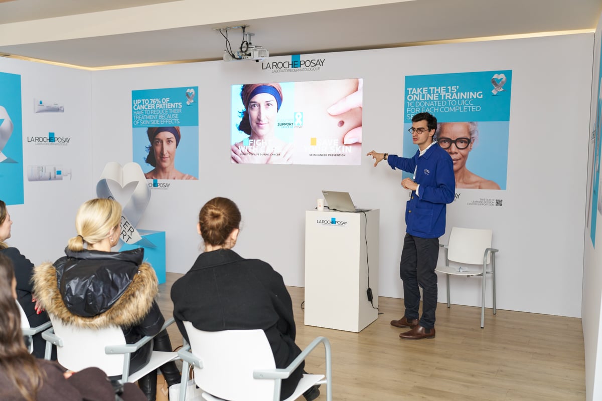 ターマルセンターでは、ブランドが提供しているプログラムについてもレクチャーも受けました。抗がん剤治療で毛が抜けたり、肌トーンが変化した人などに向けてメイクアップをレクチャーするプログラムも提供しています。また、皮膚がん患者の支援・啓蒙を目指し「Cancer Support」も実施。米国がん協会と共同で治療中のスキンケアメソッドの策定し、小児がん患者の治療のための支援などを行っています。オンラインサイトには、4つのチャプター、計15分の学習コンテンツを閲覧すると、1ユーロがUICC(国際対がん連合)または地元の支援団体に寄付されるページも。ちょっとした行動で支援につなげることができます。