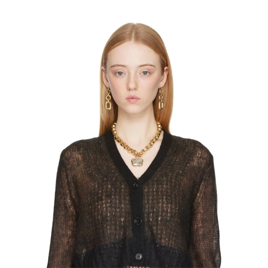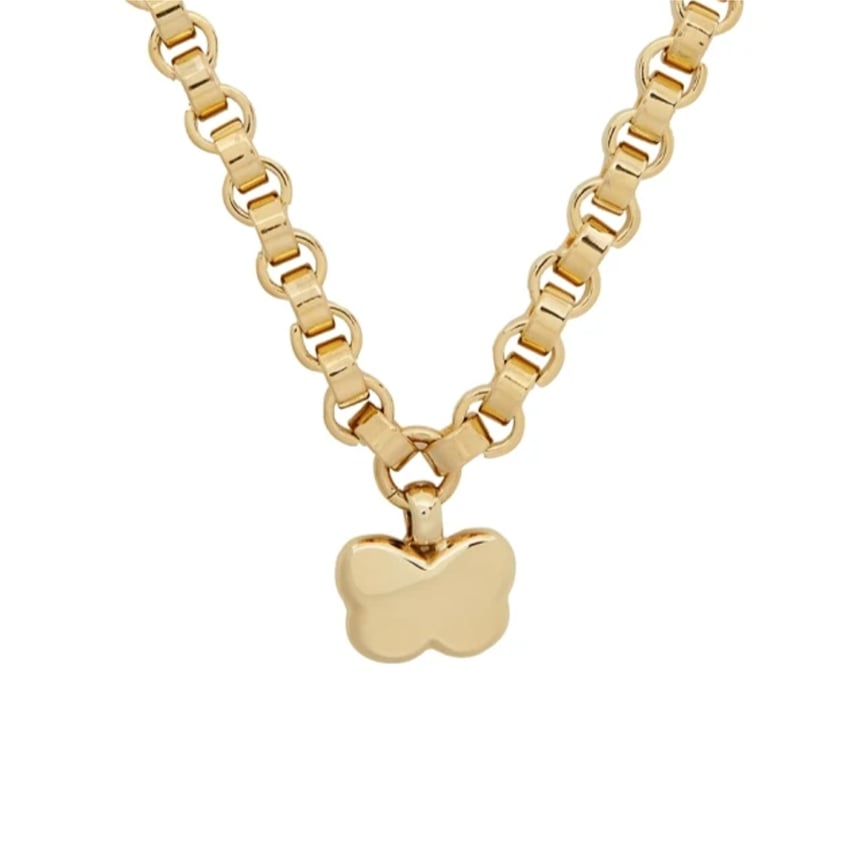 太めのチェーンにクラフト感溢れる蝶々を思わせるペンダントトップを組み合わせた、ボリュームのあるネックレスです。