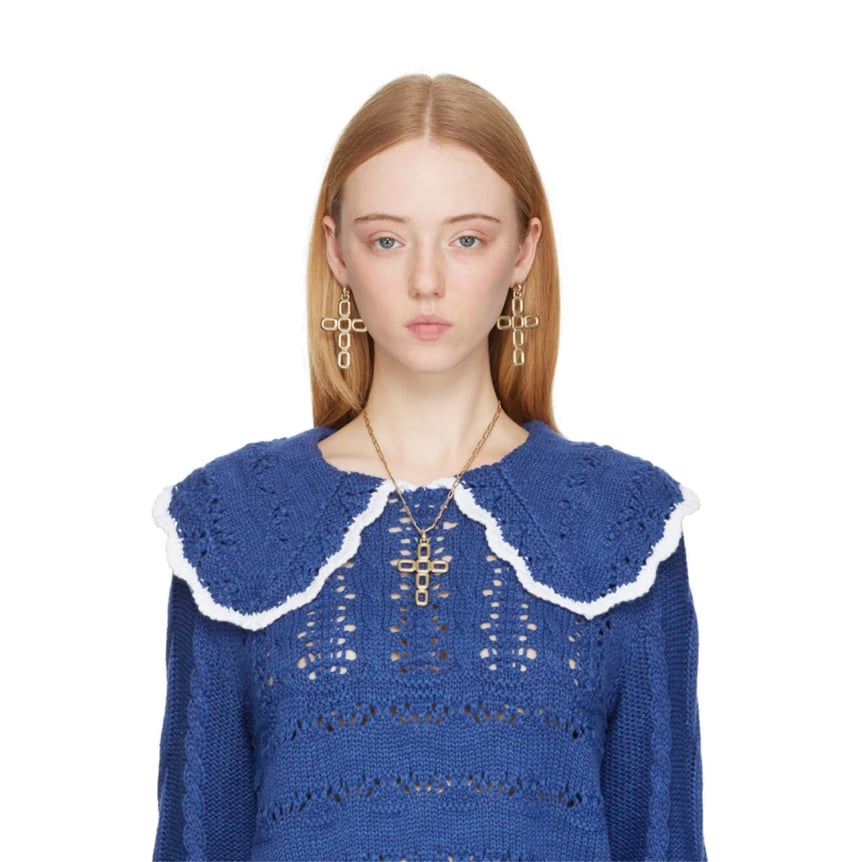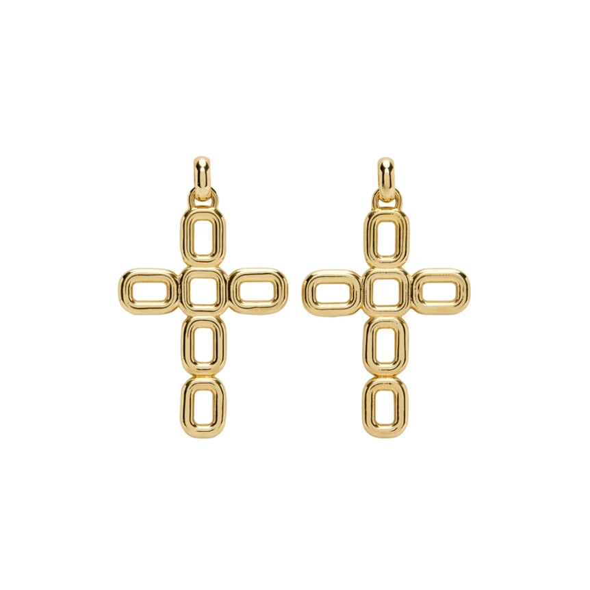 チェーンのパーツを組み合わせた、クロスモチーフのピアス。周りの視線を奪う、6.5cm×5cmの大振りデザインです。
