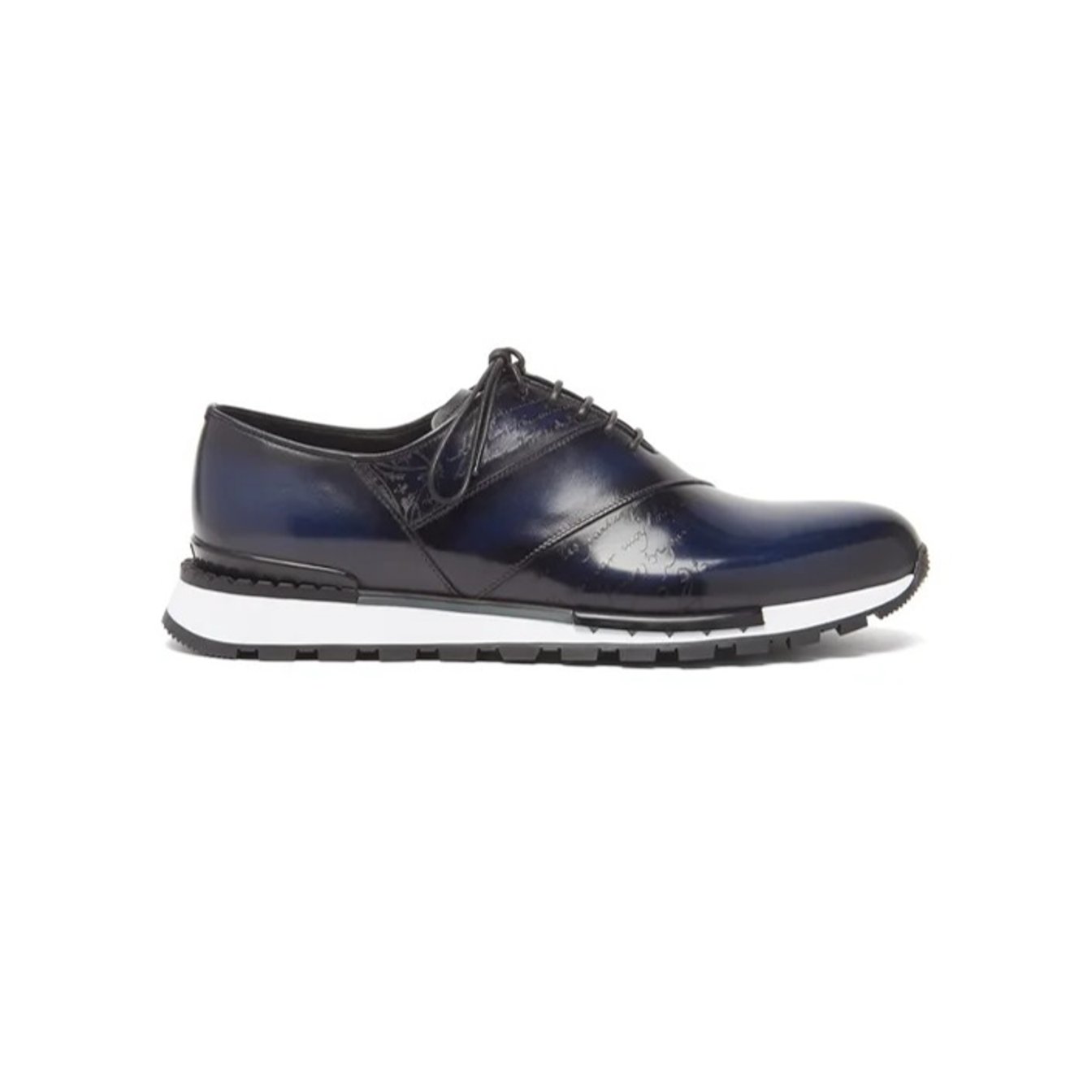 最後にご紹介するのは、「ベルルッティ(Berluti)」のアイコン スクリットが描かれた、幻想的な深いブルーのヴェネチアレザーが艶めく一足。凛と結ばれたシューレースとパネルステッチの完成度は、職人の息吹を感じるドレスシューズそのもの。エレガントなレザーシューズの魅力と、スニーカーの軽快な履き心地を両立した無二の輝きを放つアイテムです。