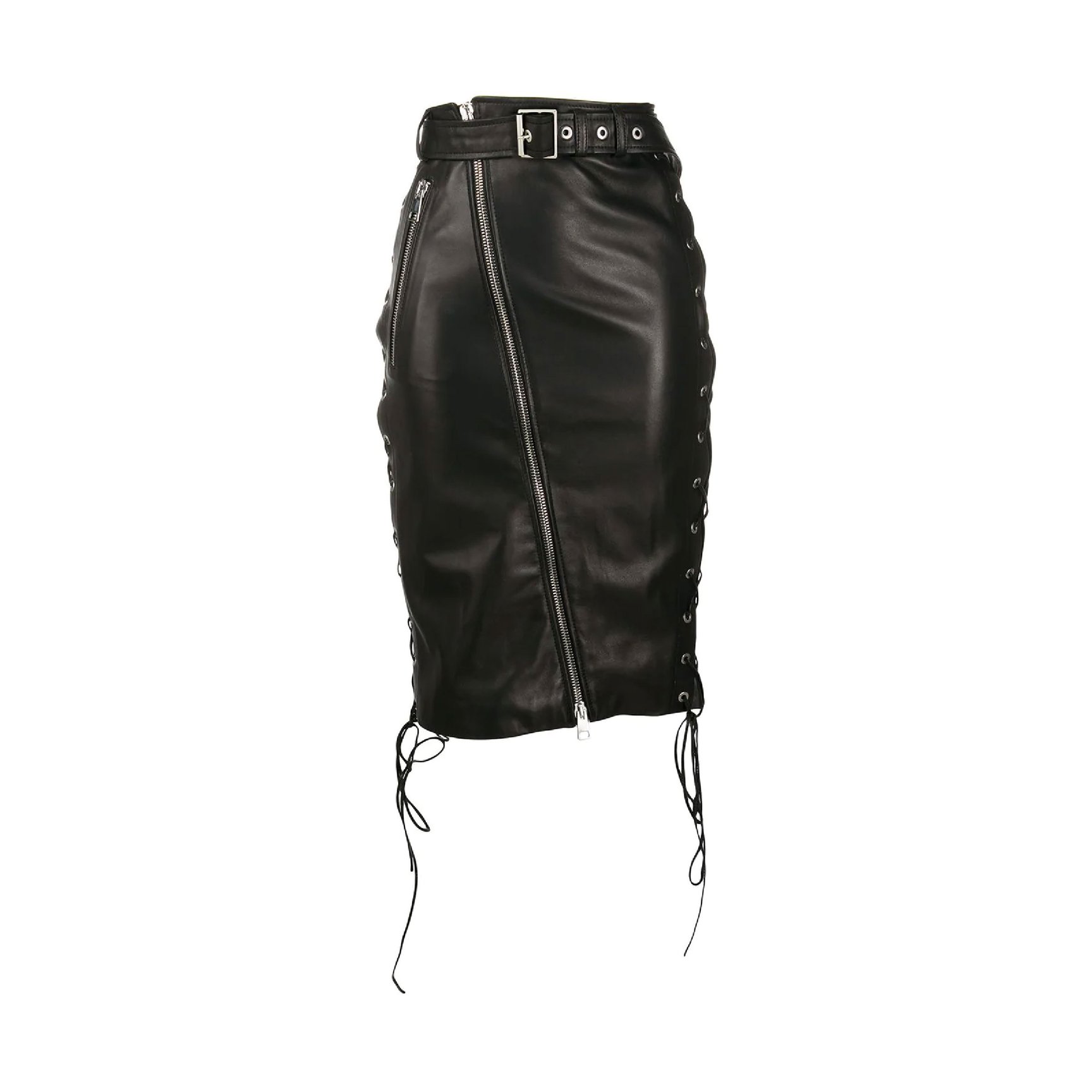 「マノーニ(Manokhi)」のレザースカートは、本格的なレザー100%。シルバートーンの金具がレザージャケット風、サイドの編み上げがロックかつセクシーな印象を与えます。タイトなので、Tシャツと合わせてもグッド。