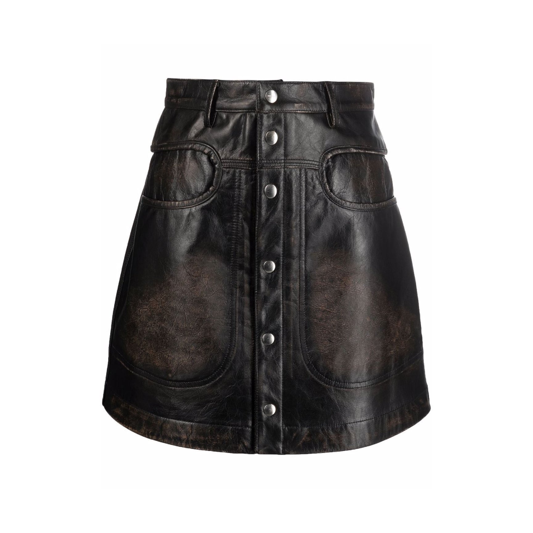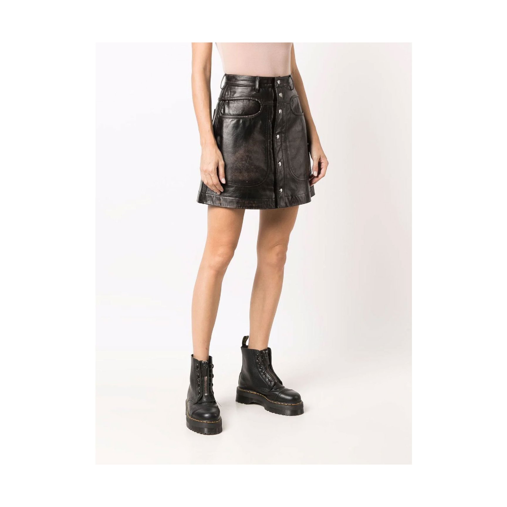 カーフレザー100%、シワ加工の施された重厚感ある「ディーゼル(DIESEL)」のレザースカート。フロントのシルバーボタンがワンポイントで、レザージャケットと合わせてセットアップ風に着こなすのも◎。