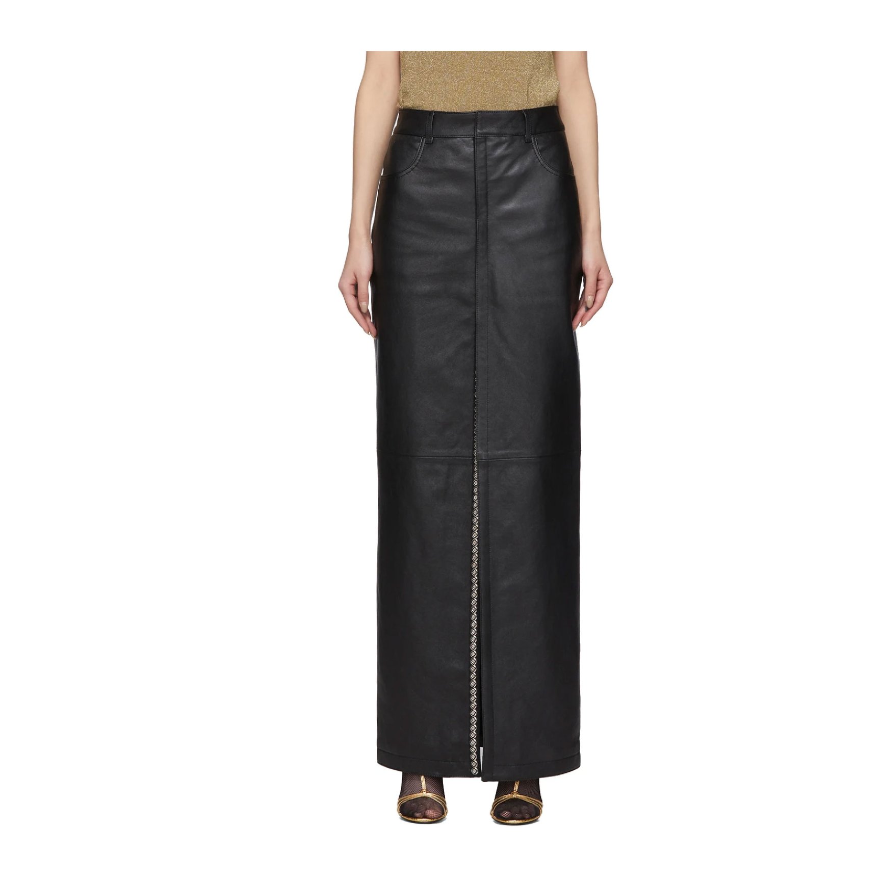 ロング丈でストレートなシルエットが美しいレザースカートは「サンローラン(SAINT LAURENT)」のもの。フロントには大胆なカットが入っており、ハイブランドらしいデザイン性の高さと美しいシルエットがポイント。一見シンプルながらも、歩くと大胆なカットが出現するデザイン性はさすがのハイブランドです。