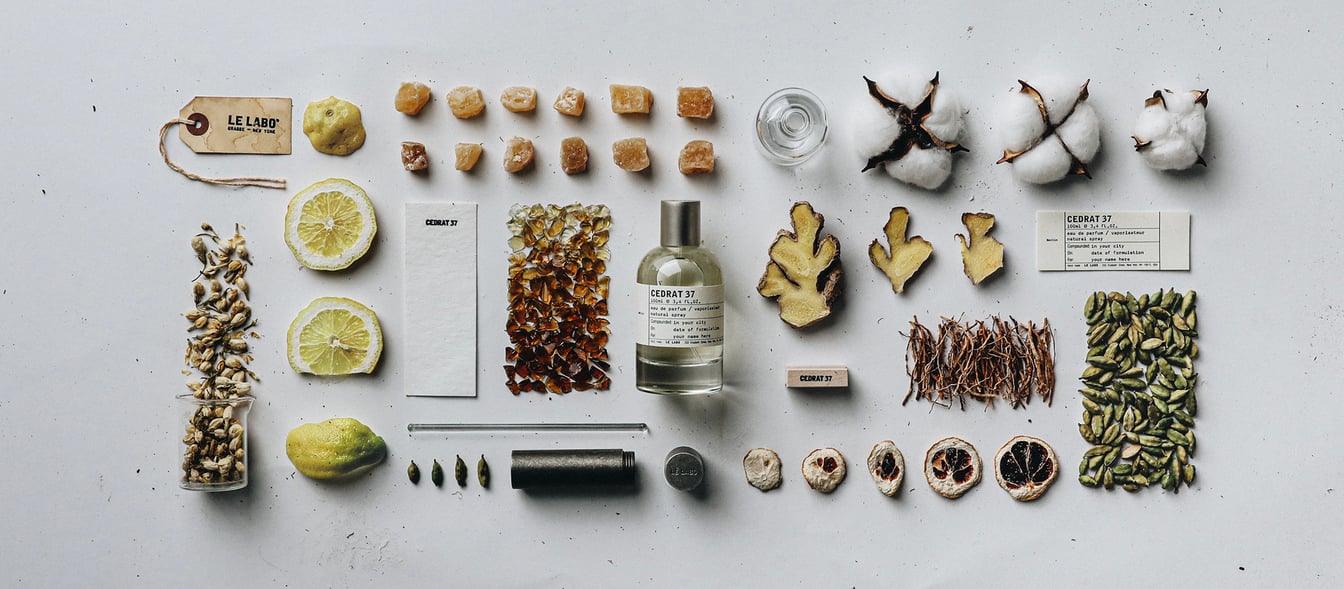 ル ラボでは、香水の都と言われる南フランス・グラース産の上質な原料を多く使用しています。フレグランスはすべて「英字+数字」の名前がつけられていますが、これらは香りに使っているメインの原料(英字)と、香りに使用した原料の数(数字)に由来しているんだとか。例えば、ル ラボのアイコニックな香り「サンタル 33(SANTAL 33)」は、サンダルウッドをメインに33の原料から成る香り、なんていう具合に。