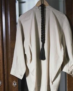シャツとパンツは、どこかルームウェアのようなリラックス感を湛えている。特にパンツは、ウエストに寄せたギャザーが印象的で、ぱっと見にはドローストリングのイージーパンツのように映る。だが実際は、細かく刻まれたタックが正確に取られており、その縫製にはドレスパンツに通じる繊細さがある。シャツの素材感にも艶があり、安易なカジュアルとは一線を画す佇まいだ。