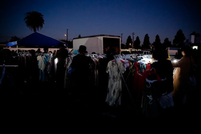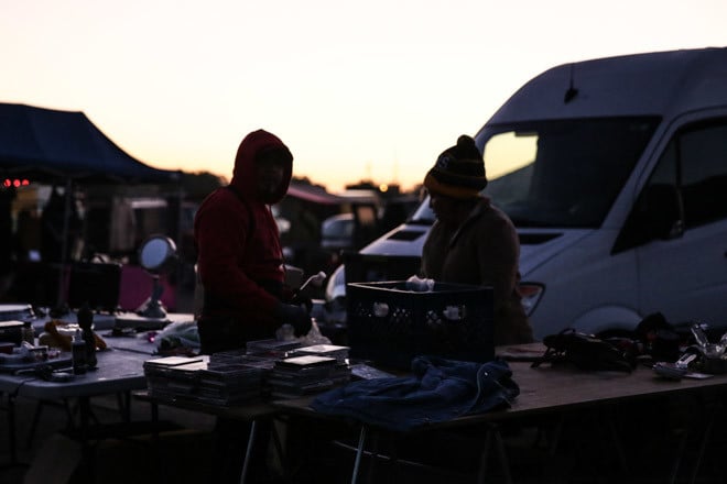 日本では信じられませんが、早朝5時には出展者とバイヤーがフリマに集まっています。この時間はアーリーやバイヤータイムと呼ばれており、割増料金を払って入場します。非常に暗いため、ほとんどの人が懐中電灯を持ってアイテムを品定め。