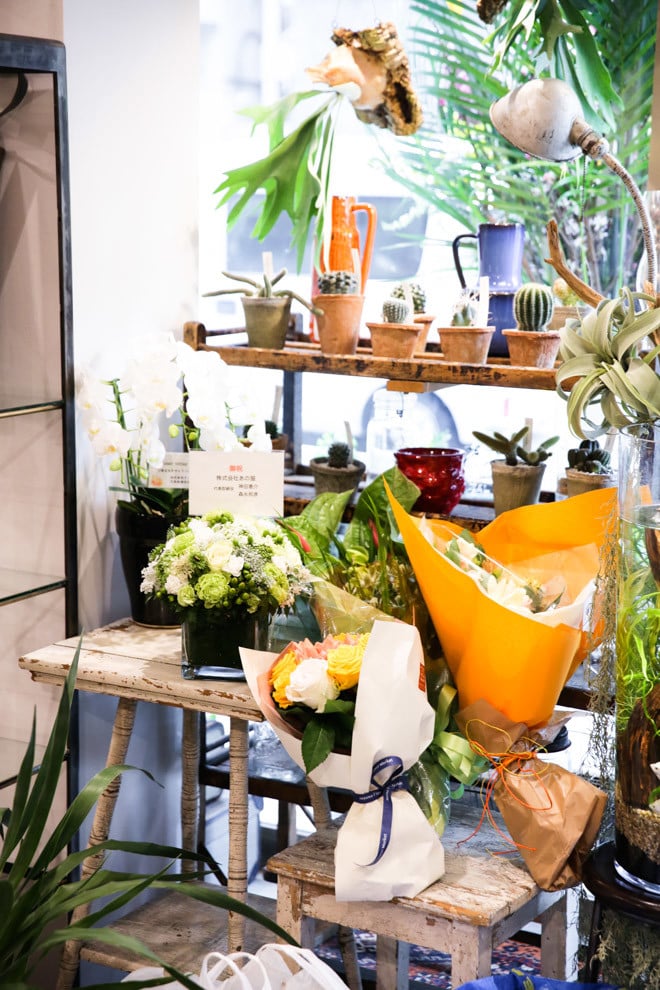 お祝いの花がたくさん届いていていい香り。花束はドライフラワーにすることもあるそう。