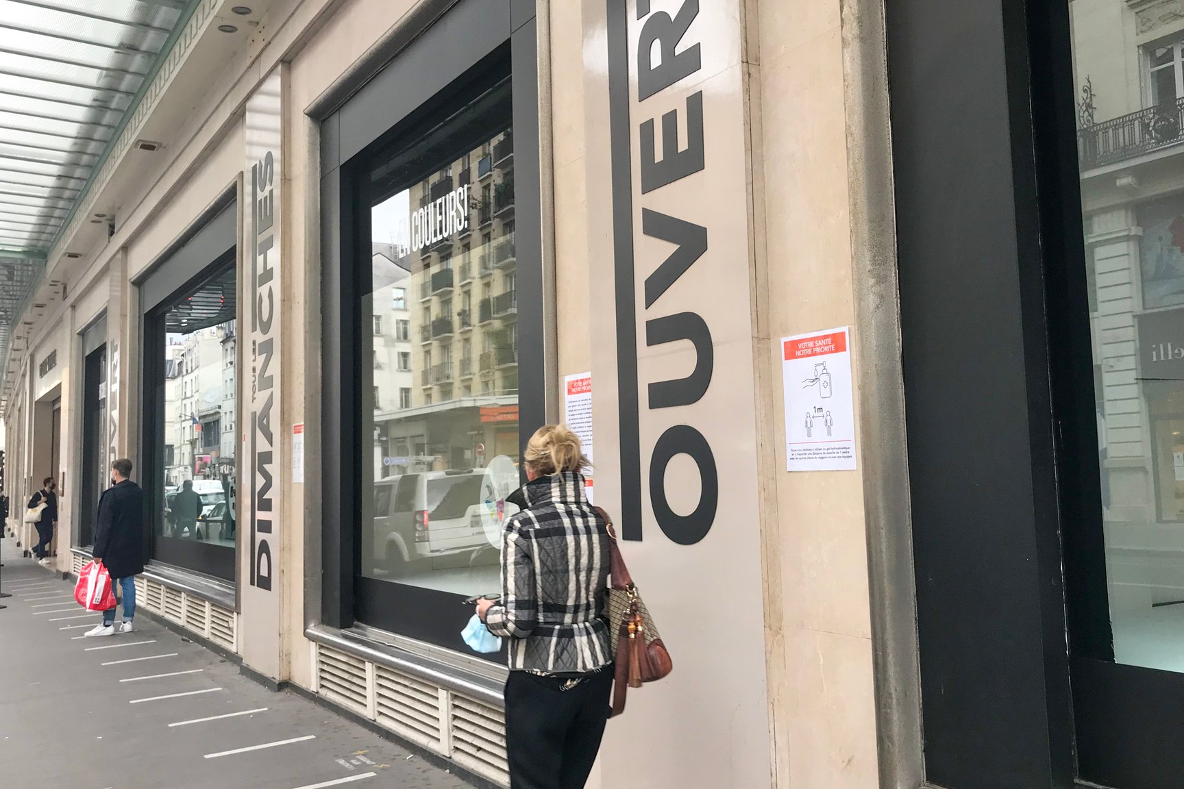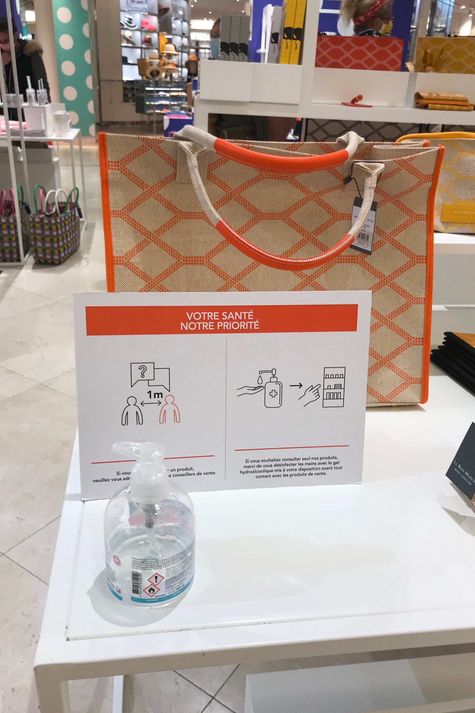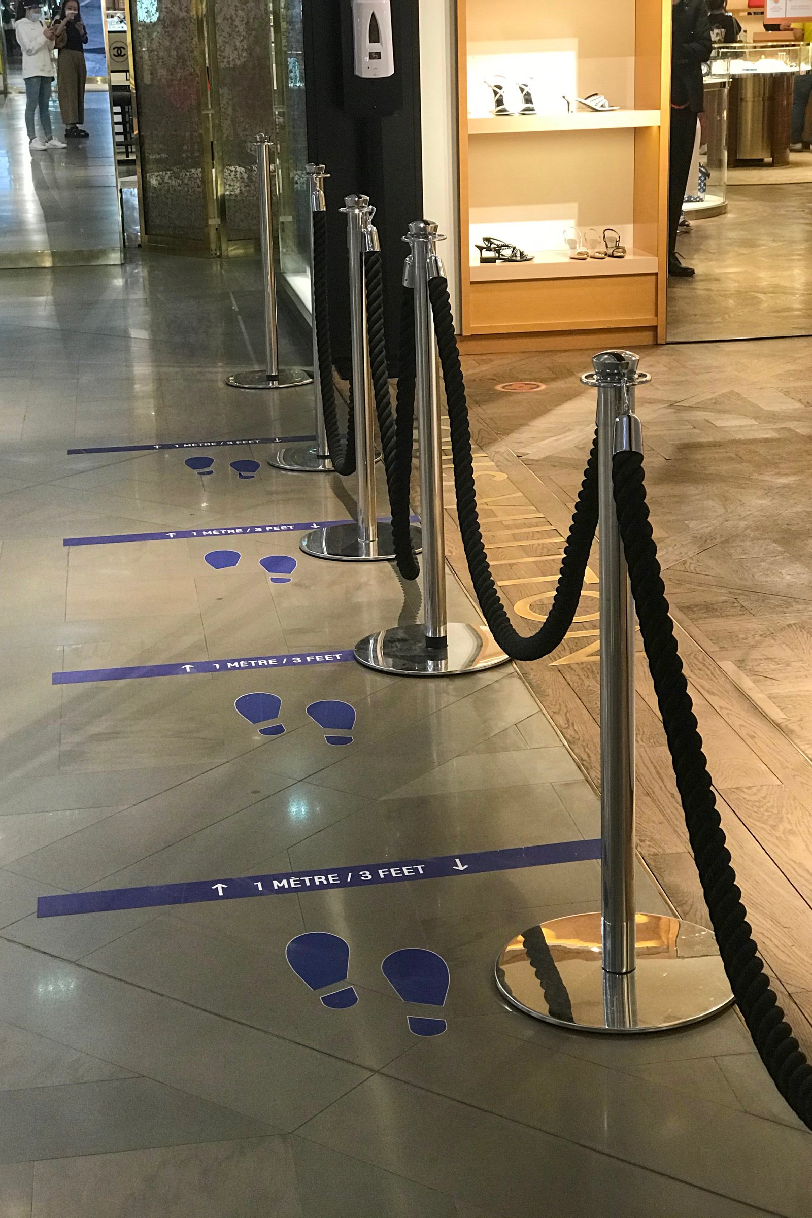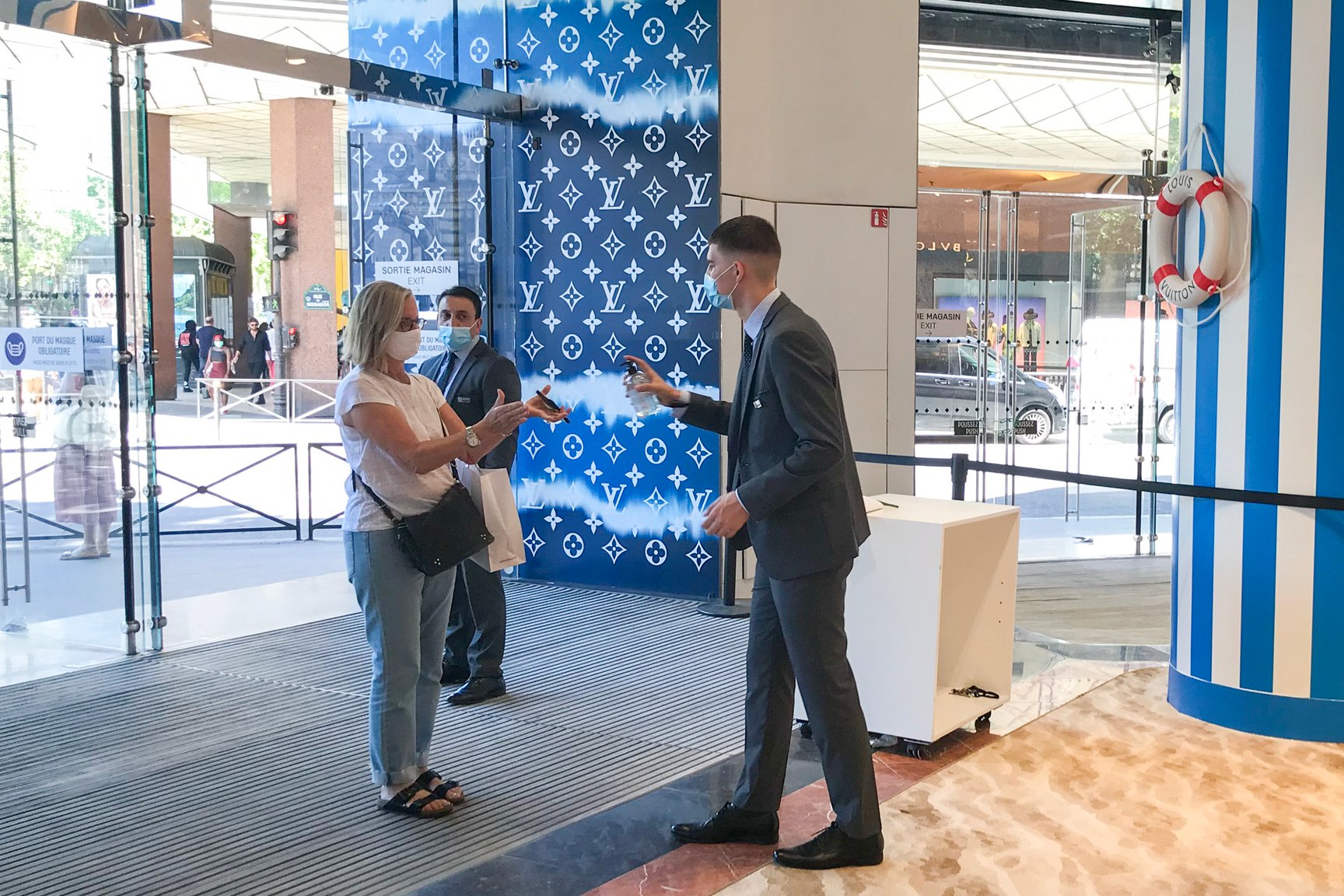 ラファイエットのエントランス。セキュリティが消毒用ジェルを持ち、来店客を迎える。