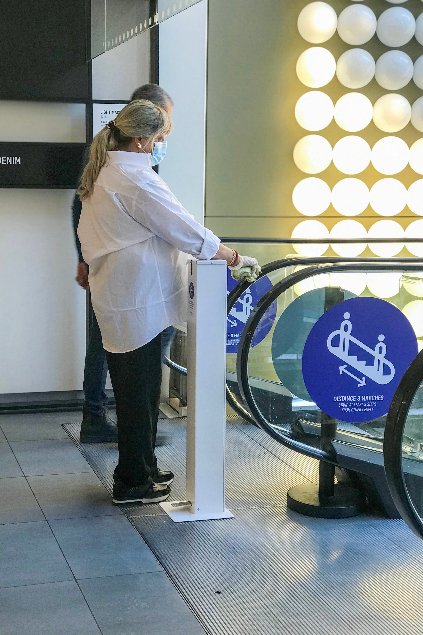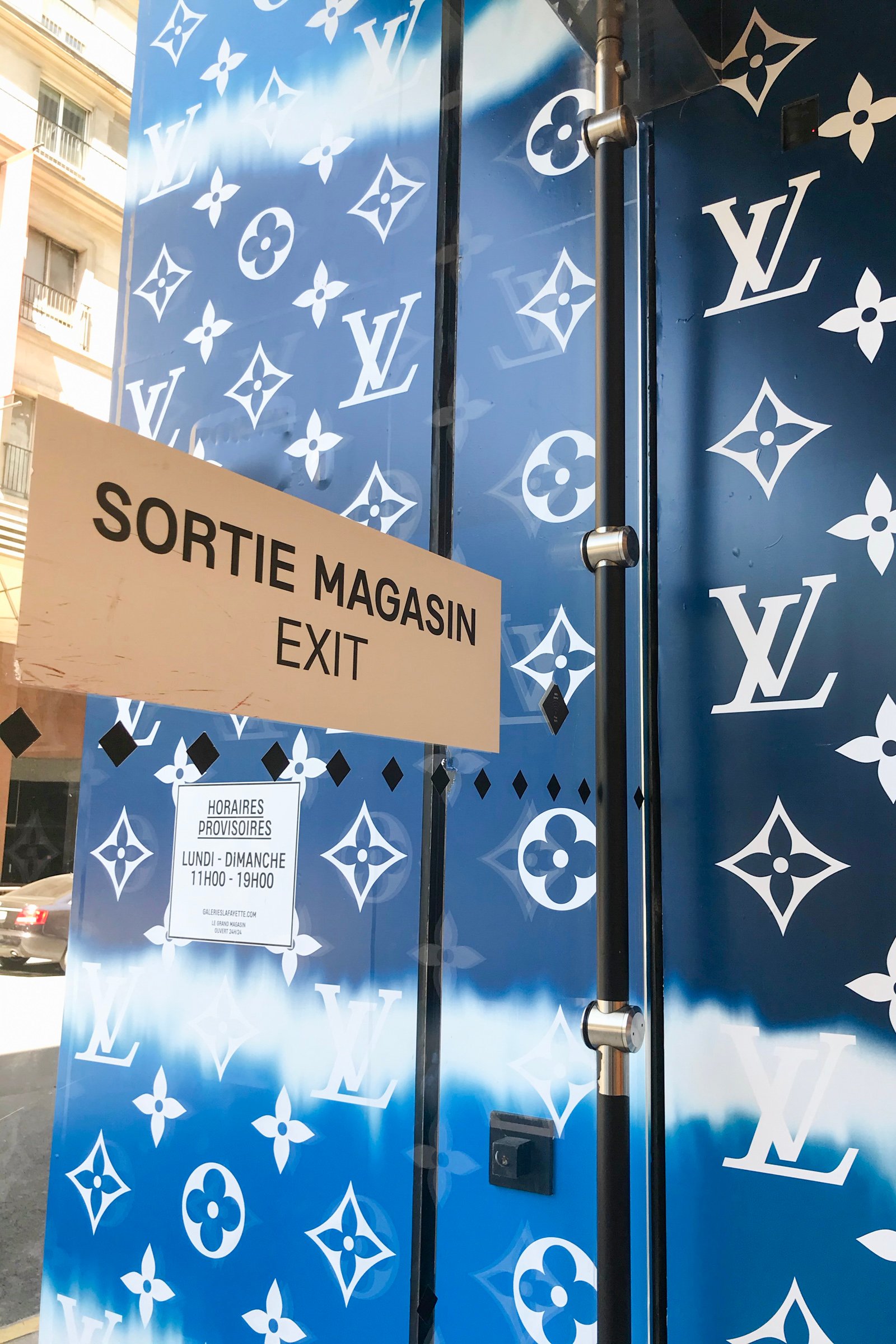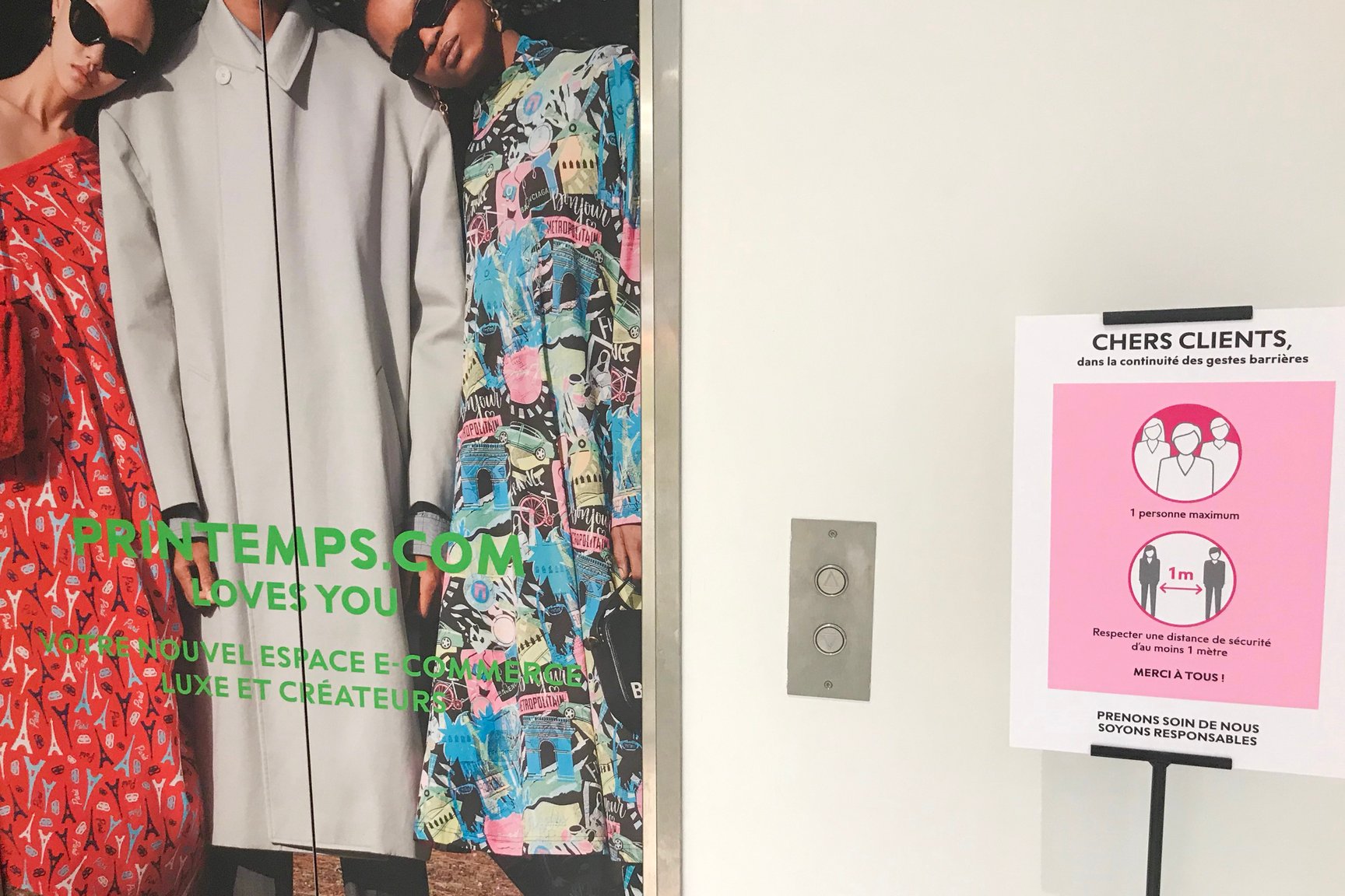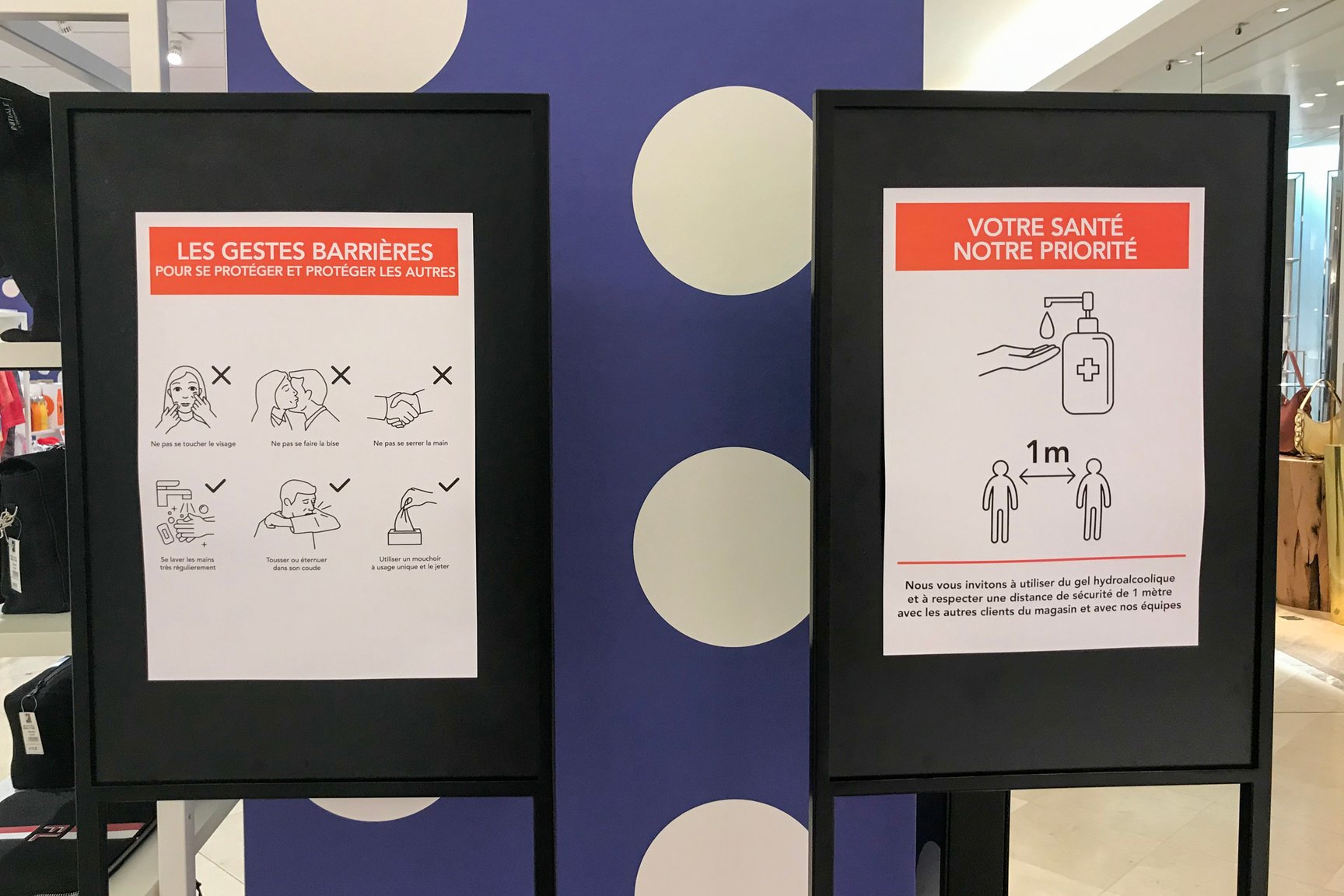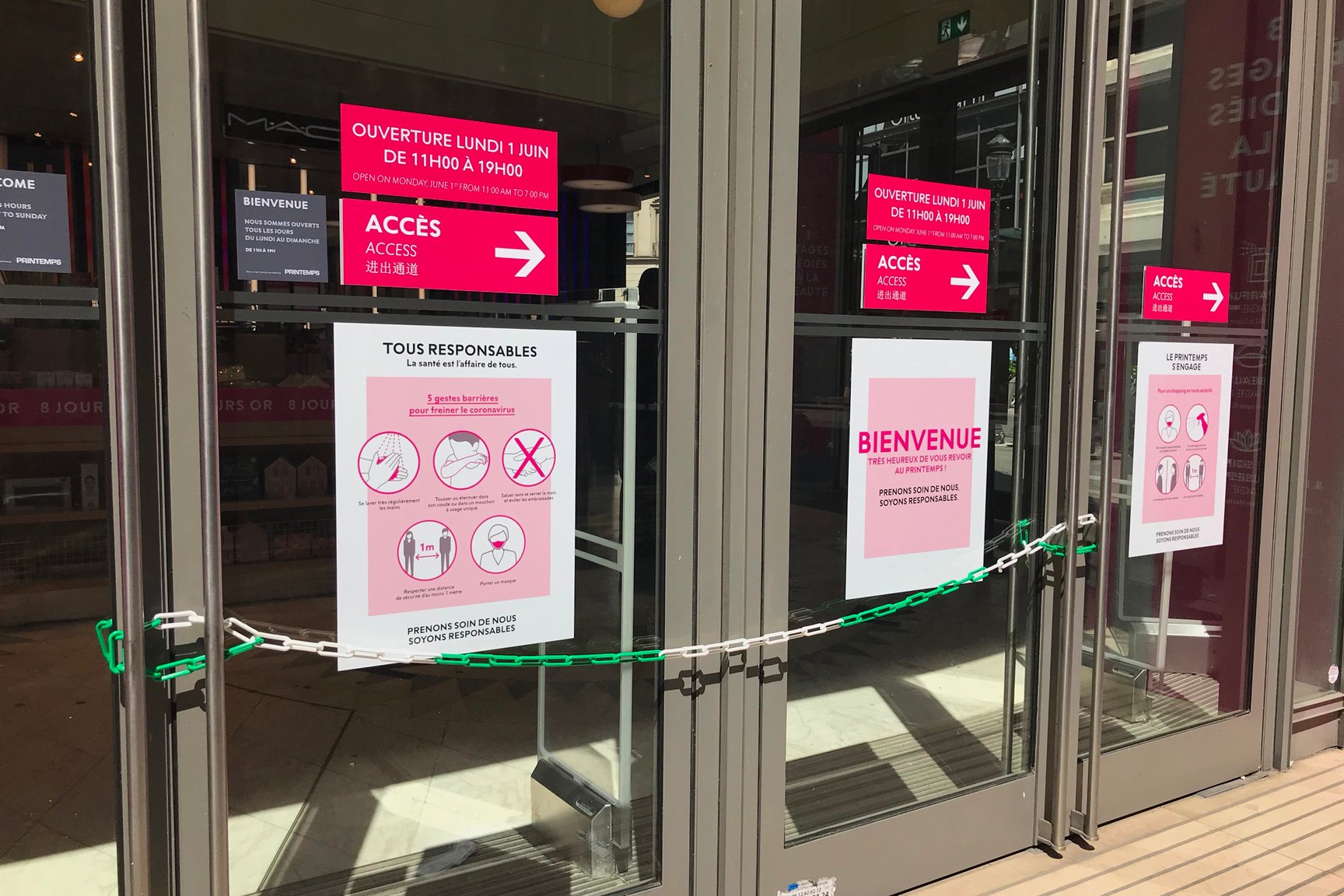ラファイエットのエントランス。セキュリティが消毒用ジェルを持ち、来店客を迎える。