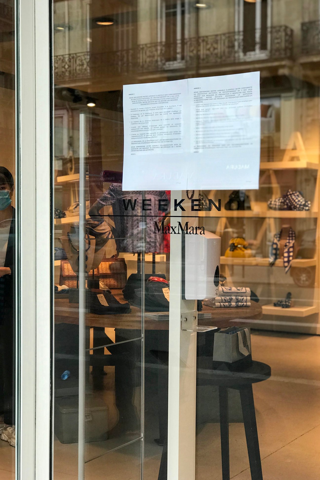 MAX MARAの路面店。ジェル、注意喚起の掲示、店員のマスク着用はデパートや大手チェーンと同じだが、店舗面積や入退出路が限られるため出入り口は共通。
