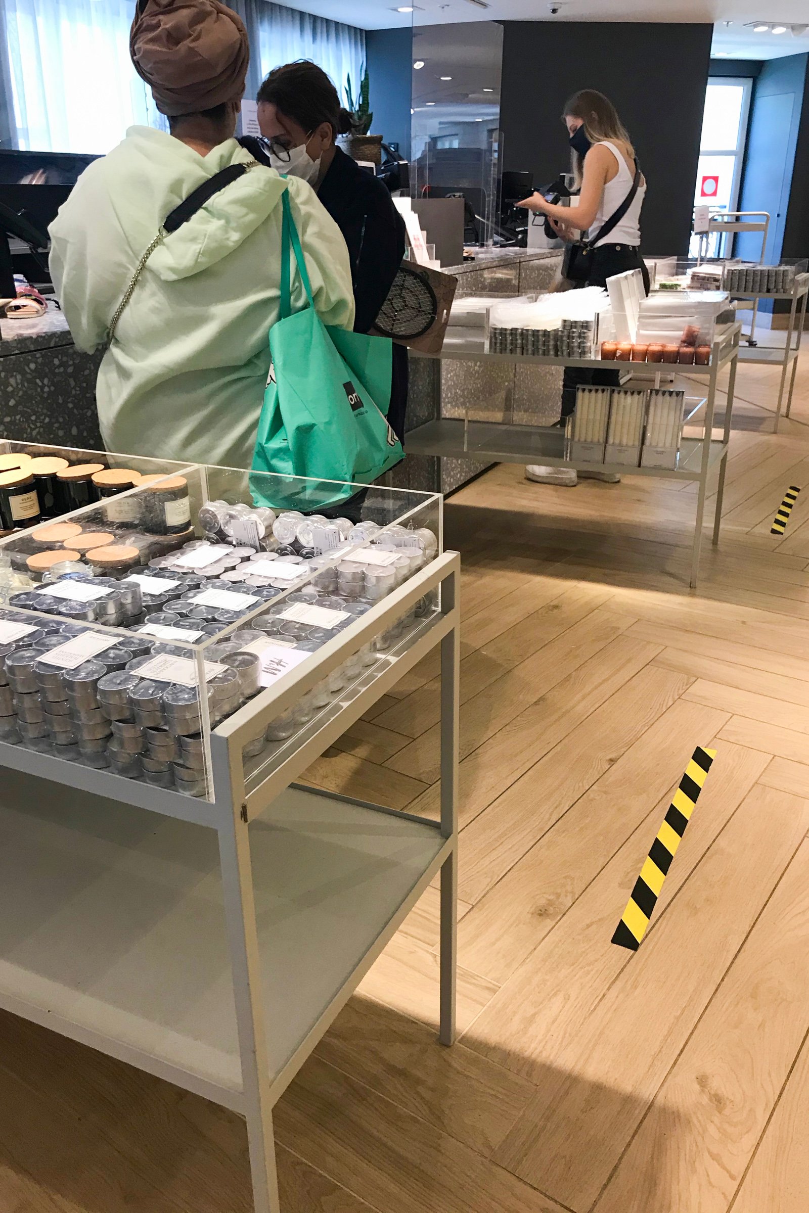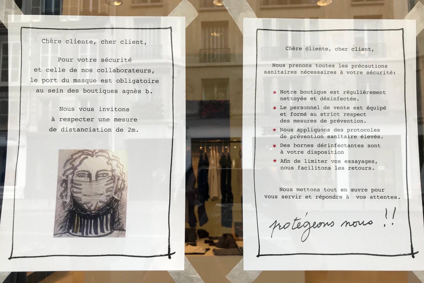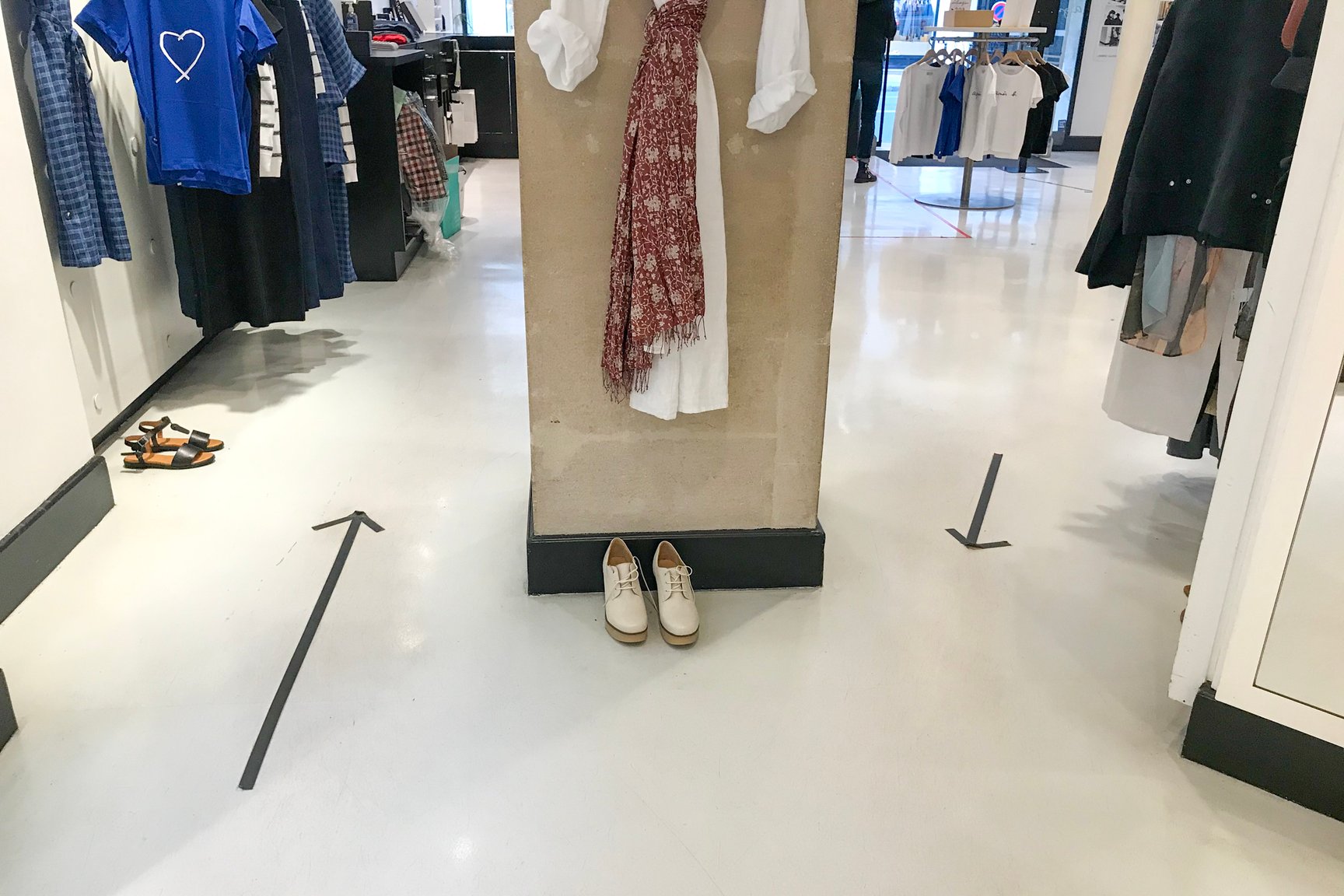 MAX MARAの路面店。ジェル、注意喚起の掲示、店員のマスク着用はデパートや大手チェーンと同じだが、店舗面積や入退出路が限られるため出入り口は共通。