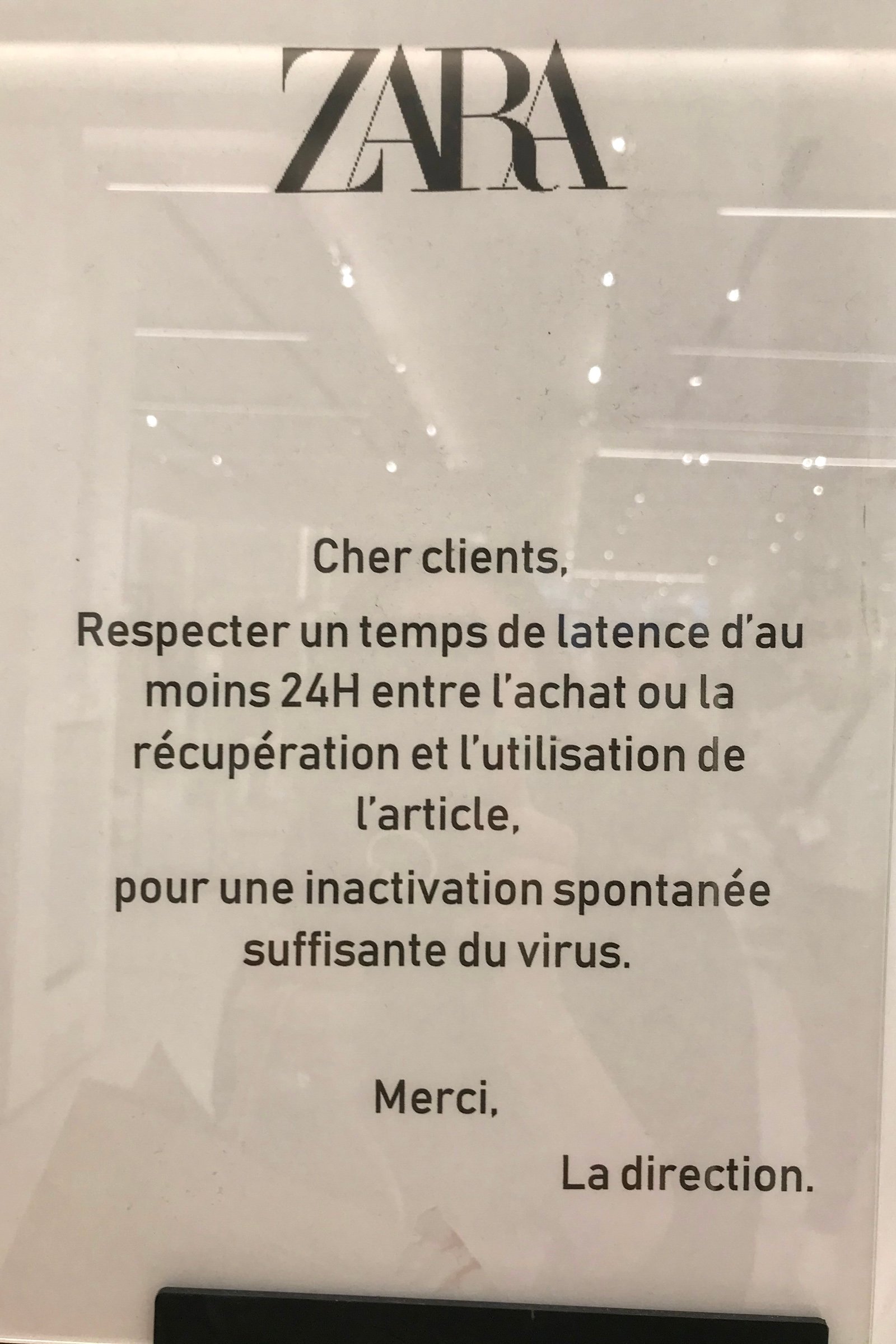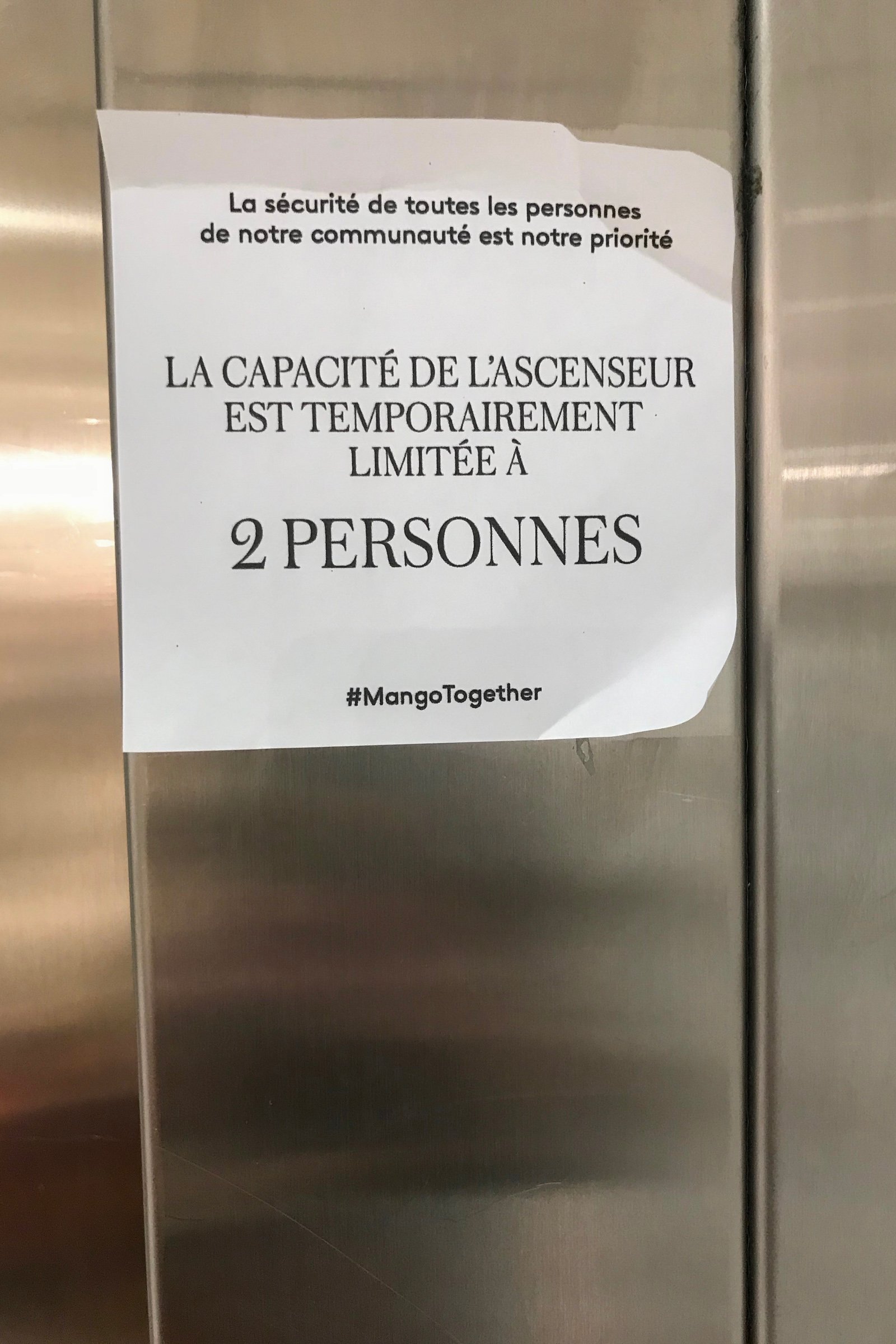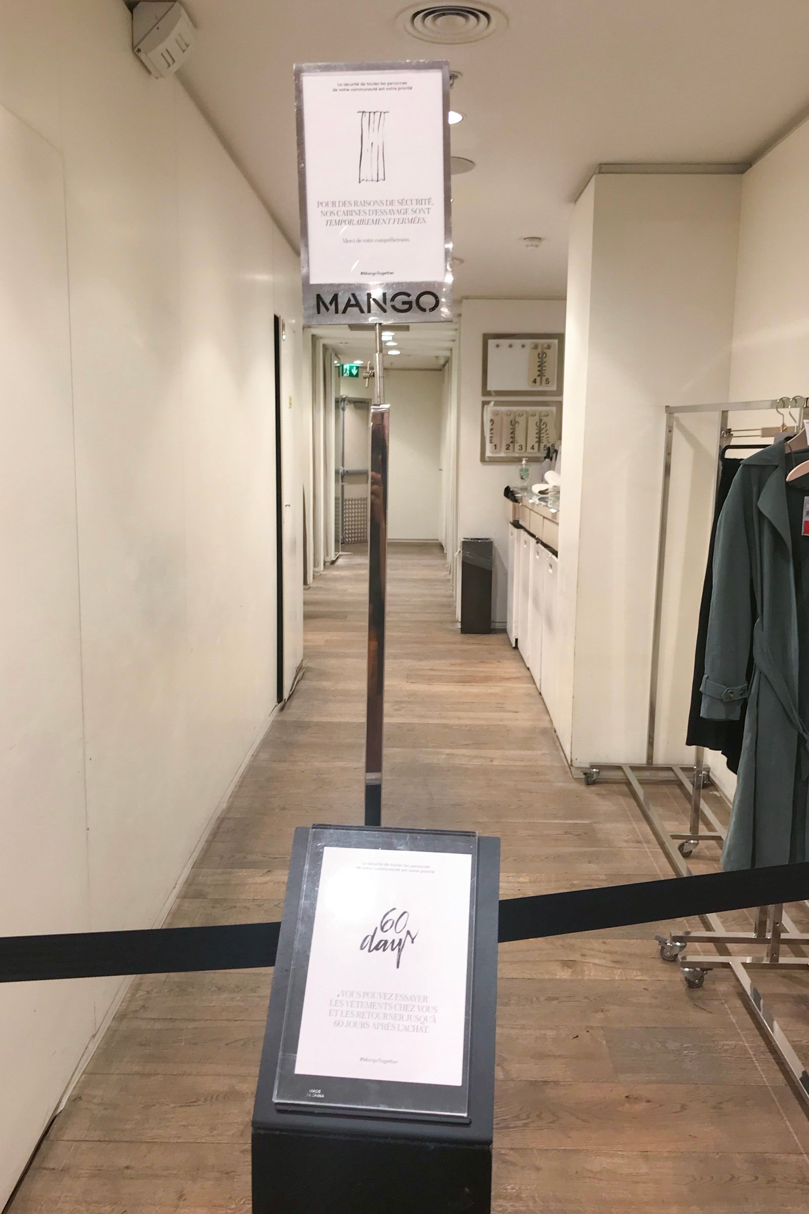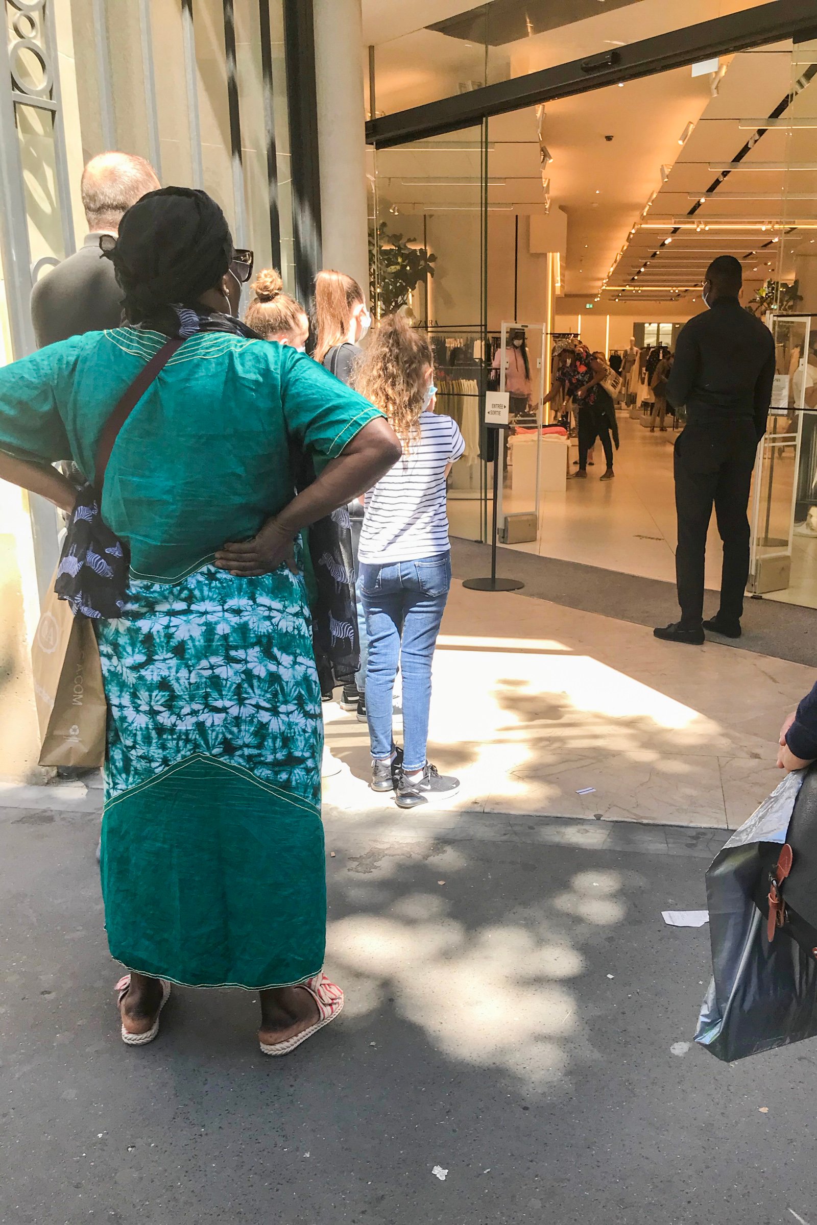 MAX MARAの路面店。ジェル、注意喚起の掲示、店員のマスク着用はデパートや大手チェーンと同じだが、店舗面積や入退出路が限られるため出入り口は共通。