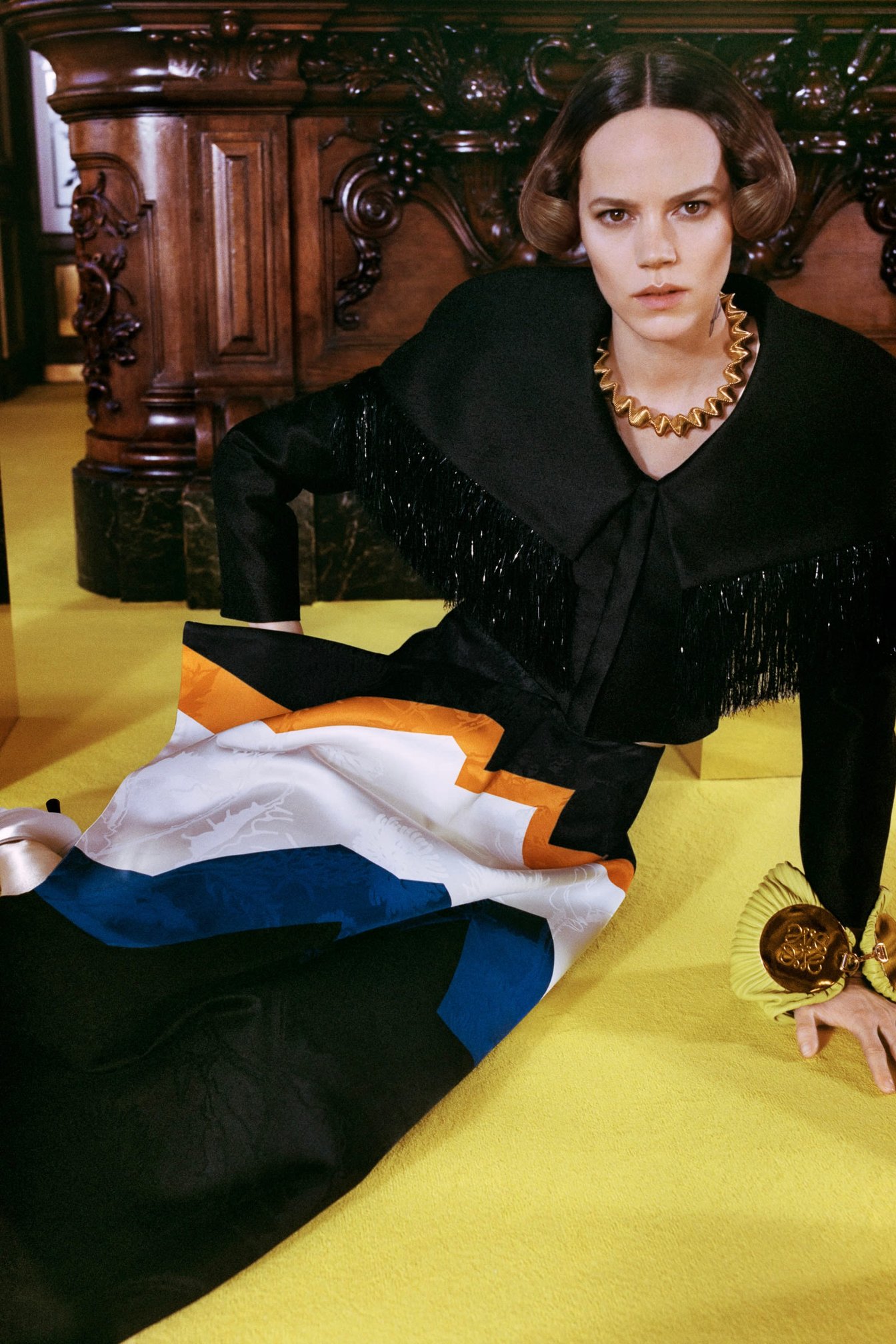 ブルーやピンク、イエローの斑がカラフルなパッチワークジャケットは、今コレクションの中で色の主張が最も強いピースだ。肩をすっぽり覆うフリンジ付きのボレロに合わせたのは、ギザギザのカラーパネルが目を引く立体的なアシンメトリースカート。