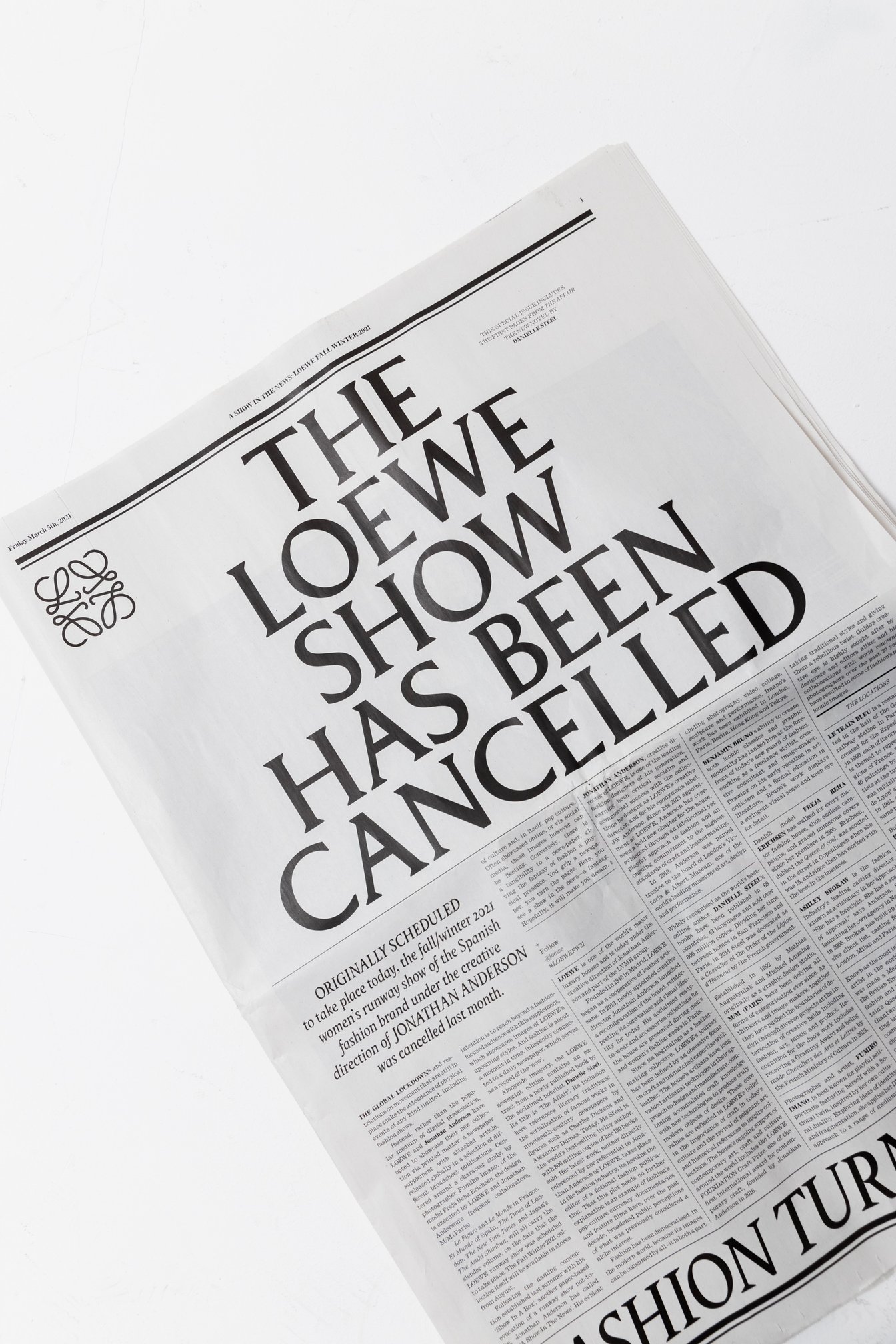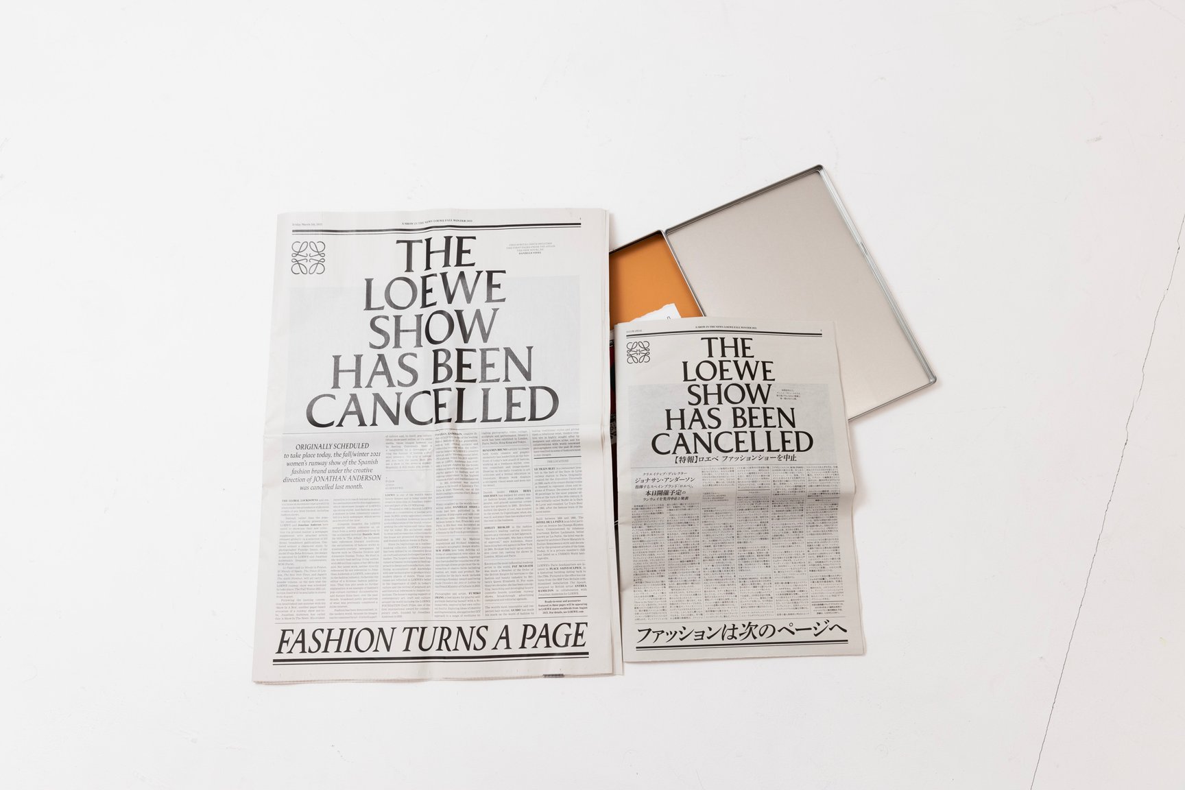 【特報】ロエベ ファッションショーを中止ーー(THE LOEWE SHOW HAS BEEN CANCELLED)。「ロエベ(LOEWE)」2021-21年秋冬コレクション発表日の3月5日、編集部にはこのキャッチーなヘッドラインが大きく印字された新聞が届いた。
