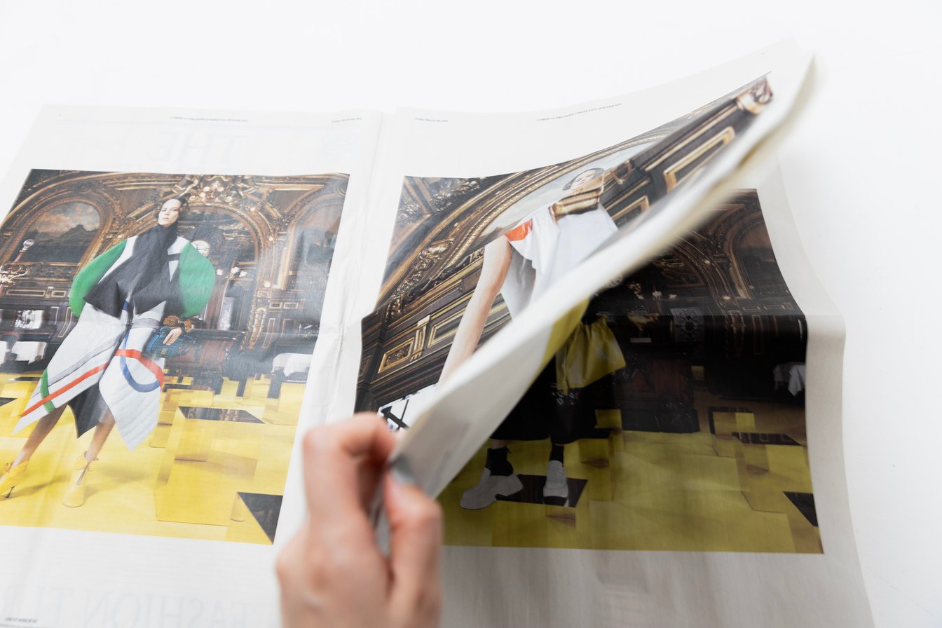 「Show in the News(ニュースの中のショー)」と名付けられたこの発表形式。新聞は別冊として、フランスの「ル・フィガロ」や「ル・モンド」、スペインの「エル・ムンド」、ロンドンの「ザ・タイムズ」、アメリカの「ニューヨーク・タイムズ」など名だたる世界の新聞社のほか、日本では「朝日新聞」の朝刊に挟み込まれ、同時多発的にそれぞれの読者へ届けられた。読者の属性上、ファッションはもとよりロエベというブランドを知らない層も少なからず一定数はいるはず。この一連のプロジェクトは「『今』の記録としての機能を担う日刊紙という物質性な存在感を与えることで、人々が新聞を手に取り、ページをめくりニュースの中のファッションを知る」という考えのもと、ジョナサンが試みた大規模な実験のようにも見える。新聞の一面はロエベを知らない人にもわかるように、コレクションについて、ブランドの成り立ちやジョナサン・アンダーソンについて、ルックが撮影された場所やスタイリスト、フォトグラファーなどの情報が事細かく記載され、とてもインフォマティブな作りになっている。
