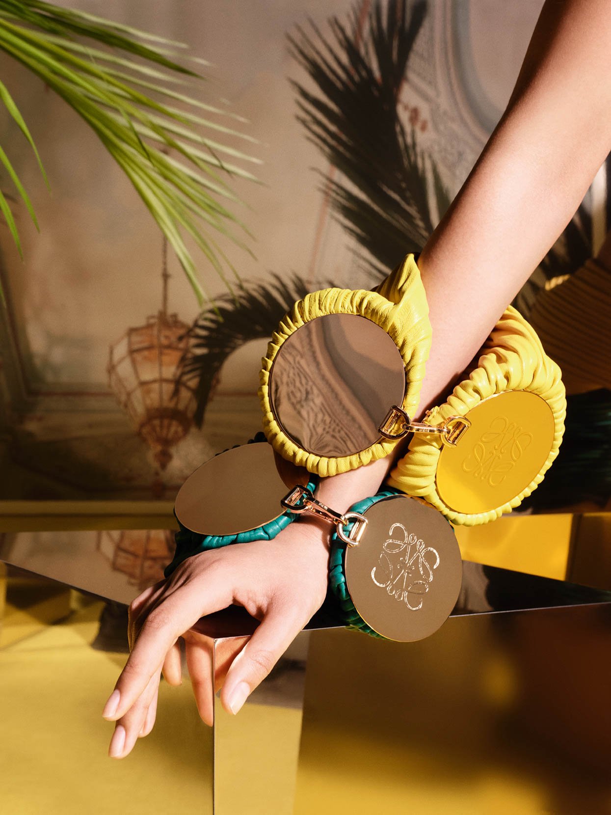 円形のスターリングシルバー製のパーツとレザーを組み合わせた大ぶりのアクセサリーは「ブレスレットバッグ」。手首にボリューミーなアクセントを与え、バッグとの合わせ技は手元への視線を一気に引き寄せるほどのインパクトを放っていた。