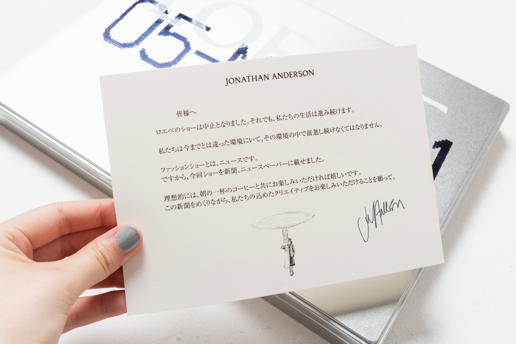 同封されたジョナサンからの手紙には、「理想的には、朝の一杯のコーヒーと共にお楽しみいただければ」の一文が。新聞を読むという多くの人のモーニングルーティンにコレクション発表を絡めたことは、「ファッションはニュースである」というジョナサンの持論と、ファッションをシリアスに捉え過ぎず、ある種楽観的なマインドで楽しんでほしいというジョナサンからのメッセージにも思えてくる。今回のユニークな発表形式について、紙面では下記のように説明している。