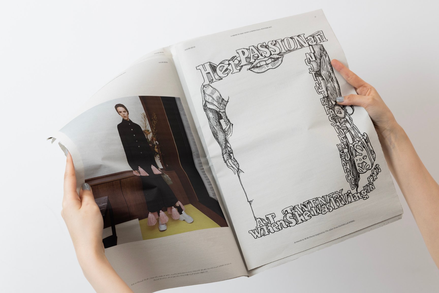 ファッションは文化の一部であり、それ自体がポップカルチャーでもある。 多くの場合オンラインやソーシャルメディア上で示されるそれらのイメージは、しかしながら儚いものでもある。それとは逆に、手で触れる新聞の物質性は、ファッションのファンタジーに物理的な存在感を与えるだろう。あなたは新聞を手に取り、ページをめくる。ここであなたが目にするのはニュースの中のファッションであり、ひとつのファンタジー。願わくば、これがあなたに夢見る時をもたらさんことを。