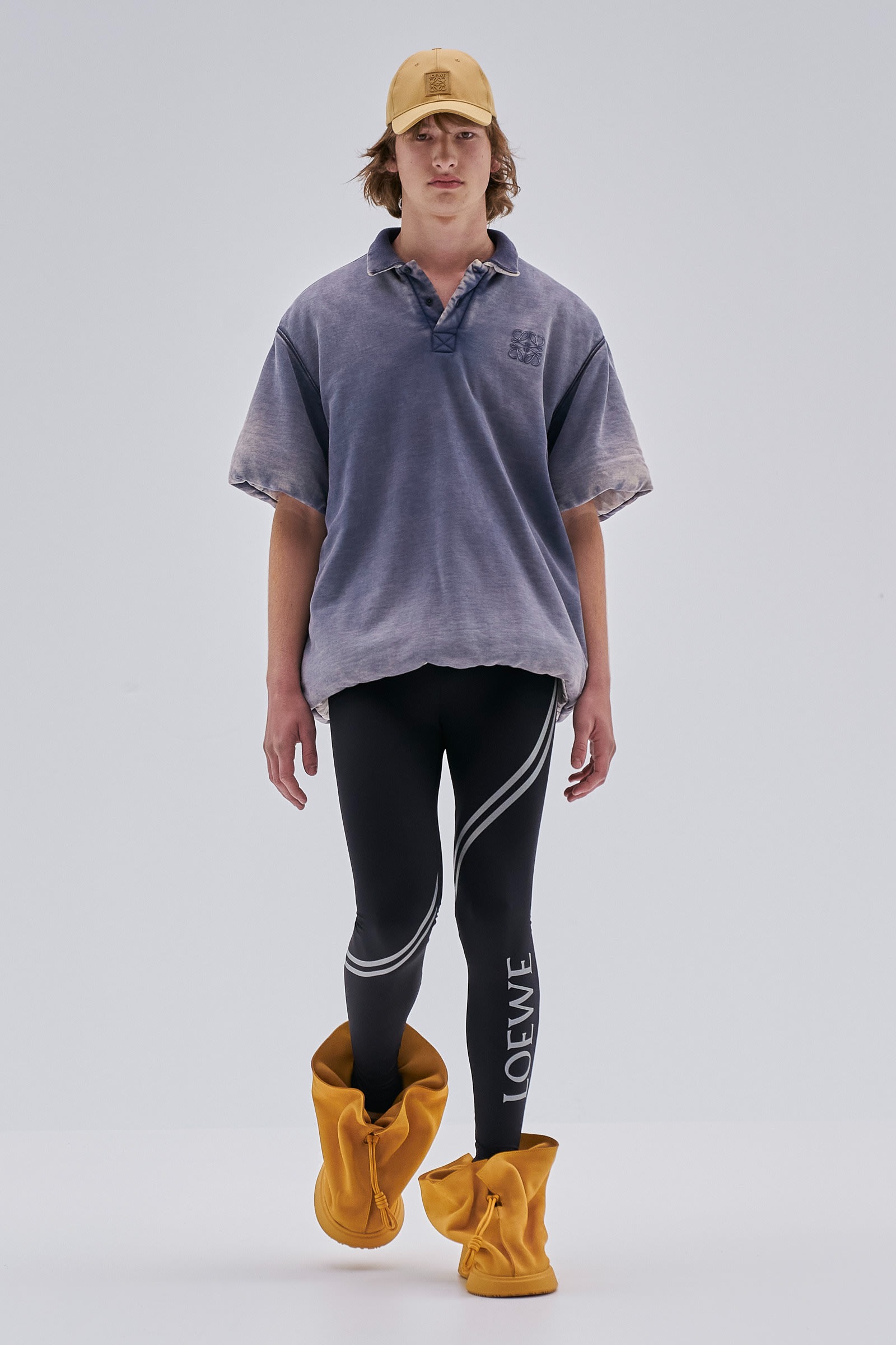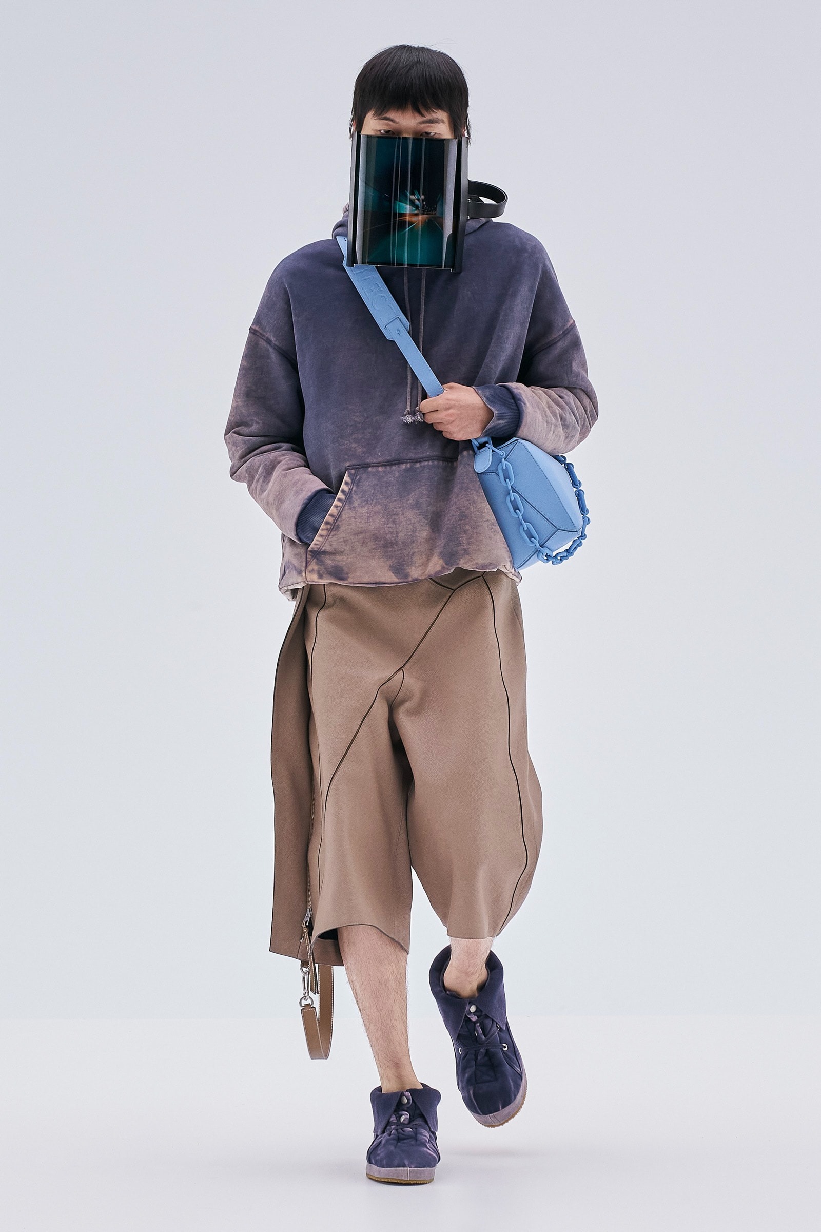 ウェアでは膨張したようなパファーパーカやロングコート、ジャケット、スニーカーが登場。身体に沿うレギンスと合わせて対照的なレイヤードとなっている。経年変化したような褪せた色合いとクタッと感のあるコットンシャツや、シワ加工で縮んだジャケットやシャツ、パンツなどのルックのほか、アイコンバッグ「パズル」を解体したようなデザインの膝下のハーフパンツ、「フラメンコ」バッグのディテールを取り入れたシューズもユニークだ。