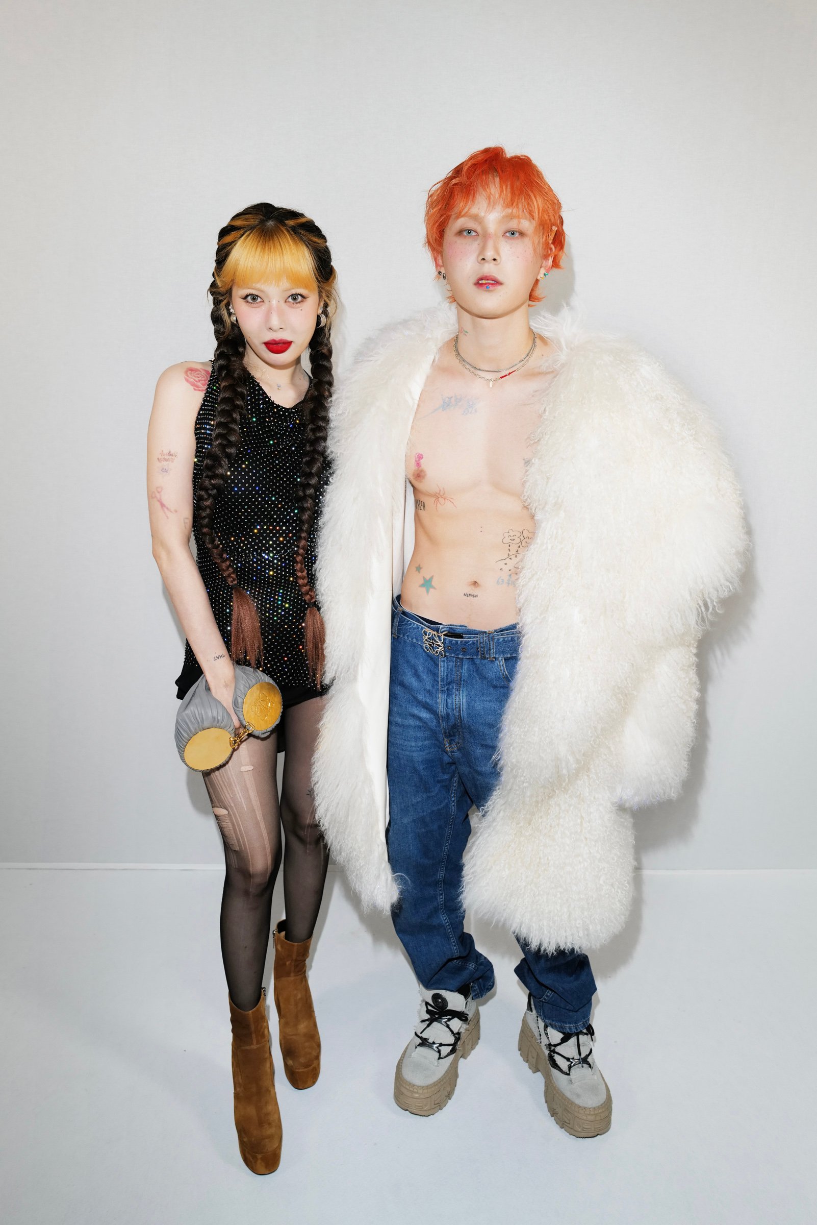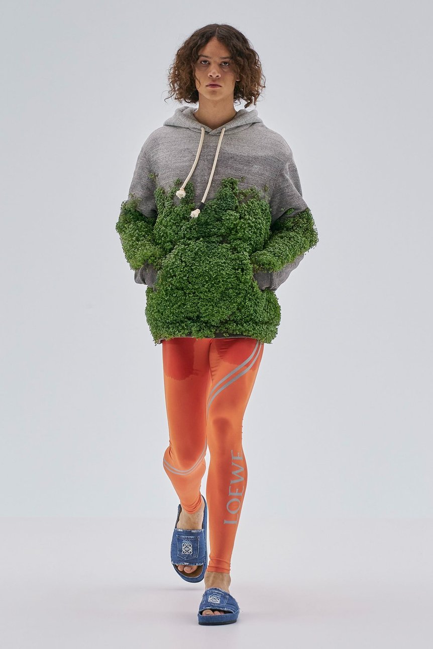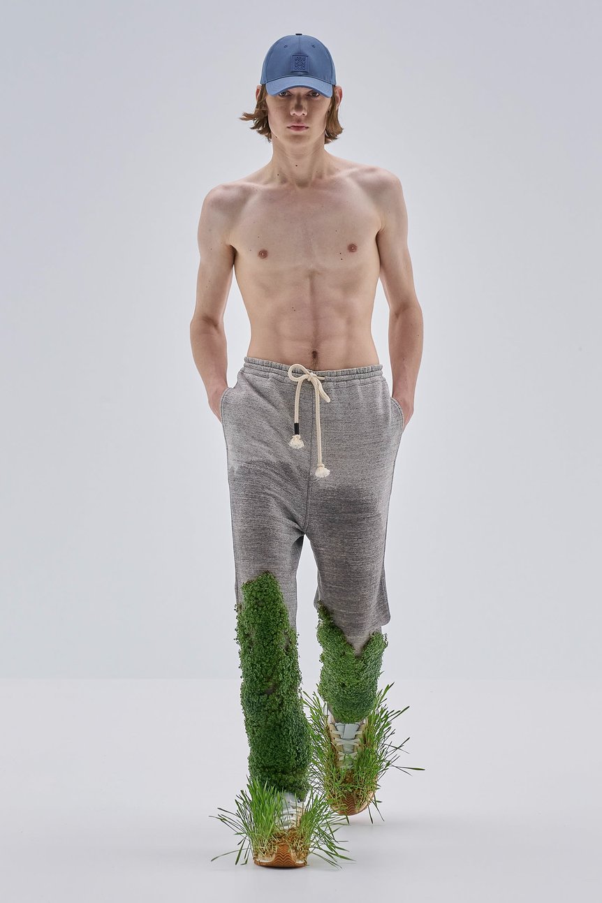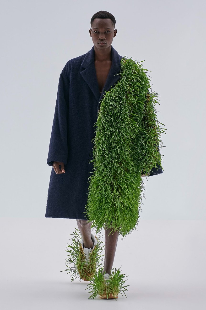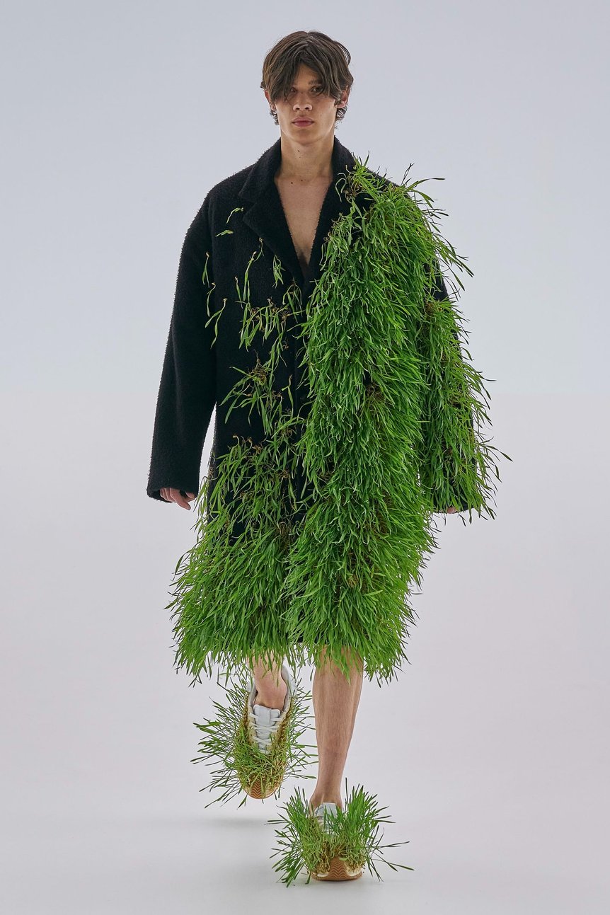 服やスニーカーから草が生えたボタニカルなアイテムは、デザイナー パウラ・ウラルギ・エスカローナ(Paula Ulargui Escalona)とのコラボレーションによるもの。これらのアイテムは、パリ郊外の施設で20日ほどかけて育成させたという。定期的な水やりやメンテナンスが必要で、スウェットのフーディーやパンツには "水やり"をし、湿った痕跡が。一見、緑のフェザーの装飾にも見えるコートやデニムの装飾もよく見ると種から発芽し、"緑化"している。