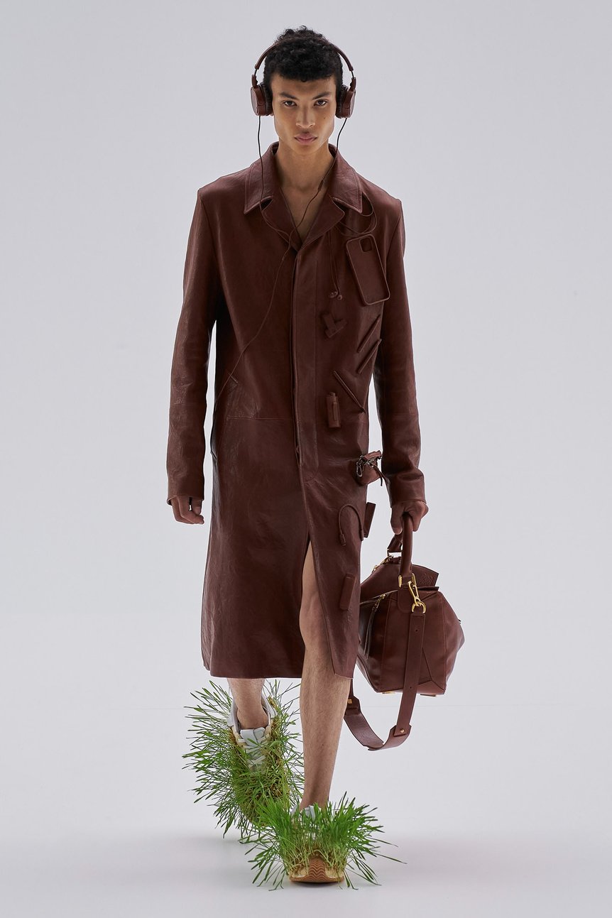 真っ白で無機質、傾斜したランウェイはまるでラボラトリーのよう。ショーで披露されたのは、そんな実験的なアプローチの数々だった。ファーストルックで登場したロングのレザーコートの半面に取り付けられているのは、普段私たちのデスクに散らばっていそうなケーブルやUSB、スマホケース、イヤフォンやブラシといったメイク道具など。現代人の生活においてなくてはならない細々としたモノがコートと同色に染められ、並べられている。足元のスニーカーからは見た通り、"草"が生えており、冒頭から強烈なインパクトを放つ。