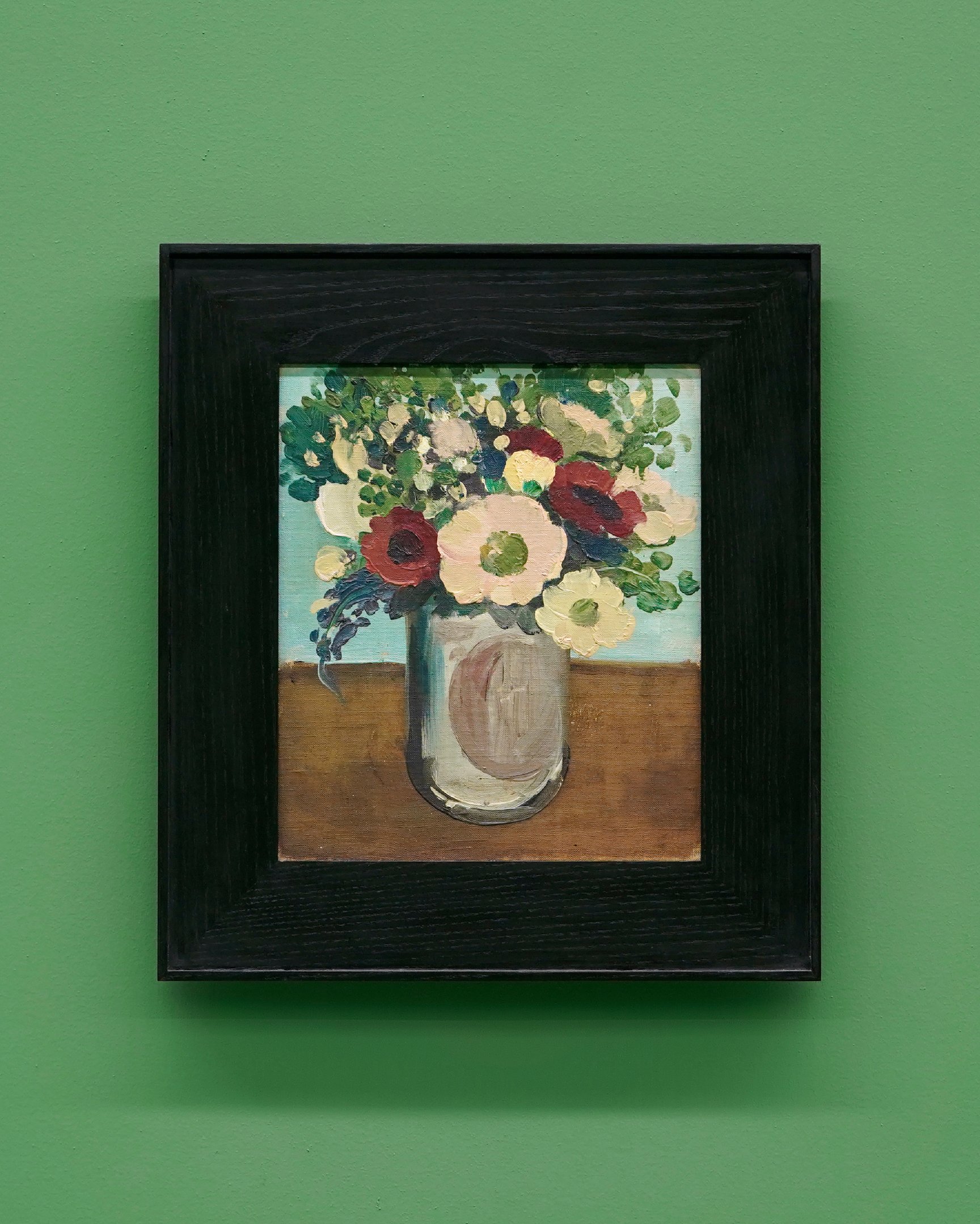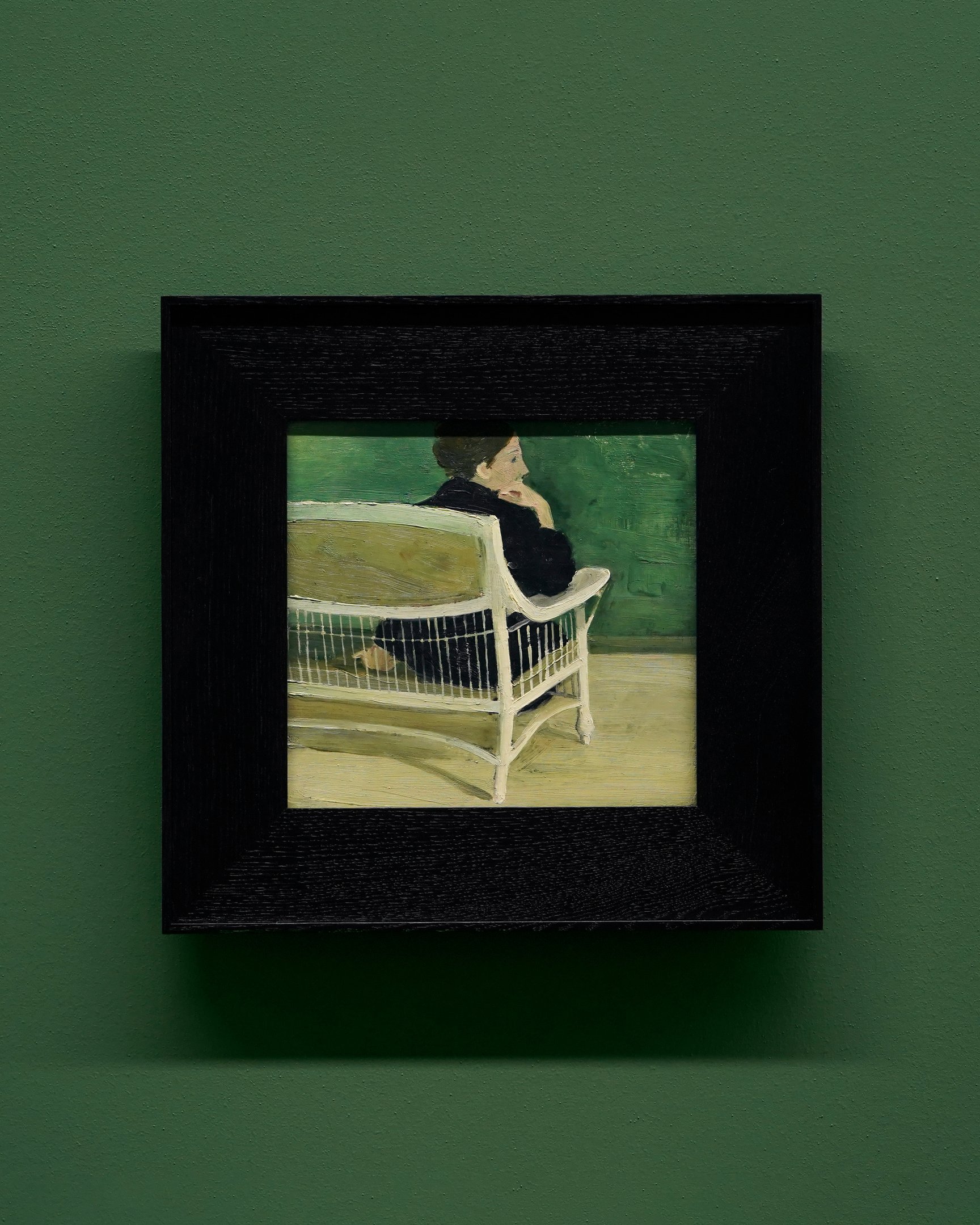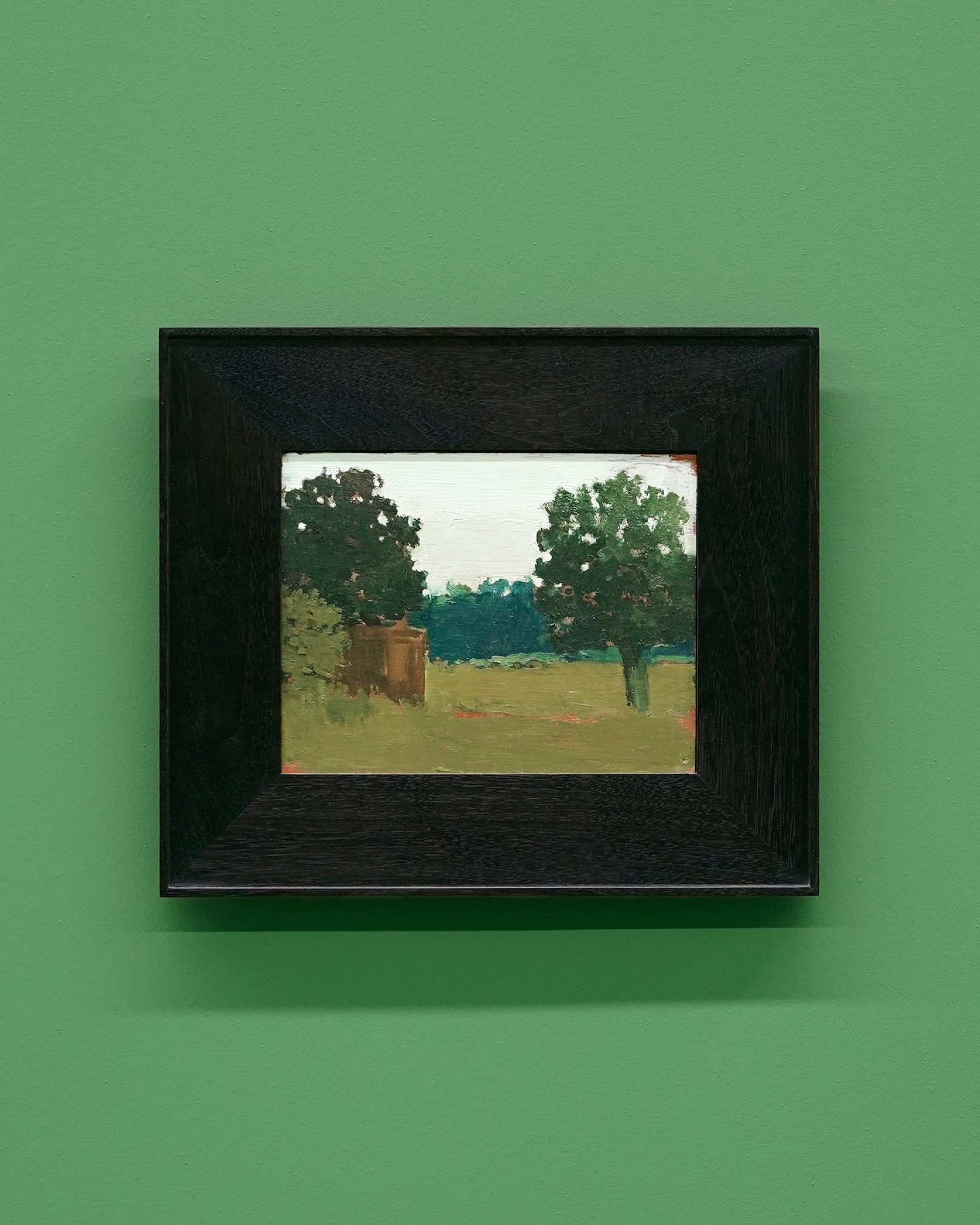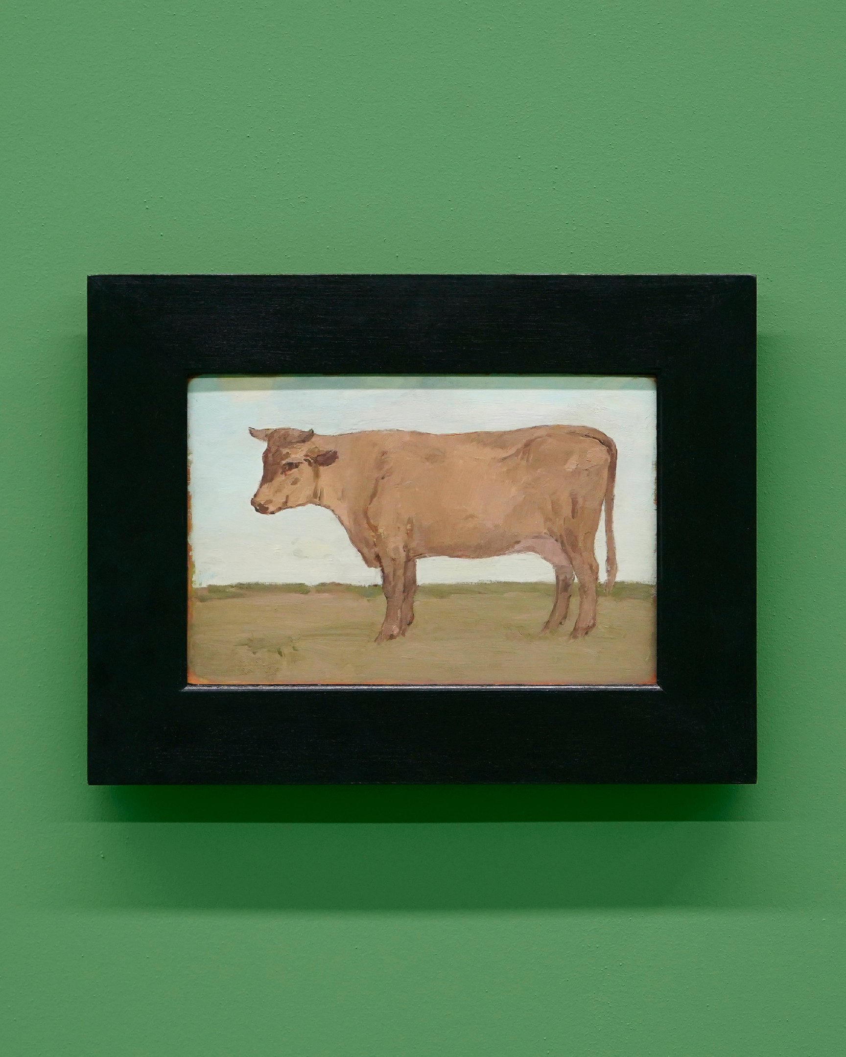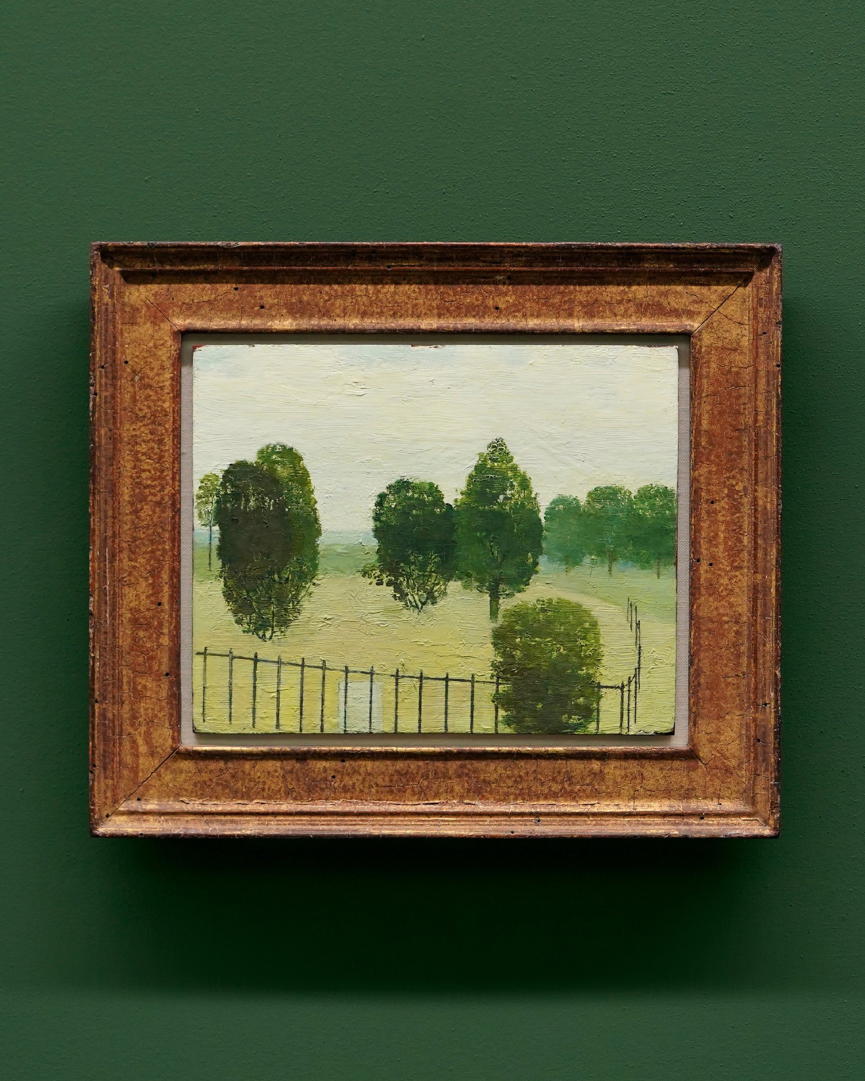 今回の「ロエベ」の会場は、パリの東方にあるヴァンセンヌ城。城内にはフラワーパターンの特設テントが建てられ、内部にはアートフェアの一角のような緑色の“ギャラリー”が作り上げられた。そこに展示されているのは、田園風景や花、牛、犬などといった控えめな題材を小さなサイズで描いたアメリカの画家、アルバート・ヨーク(Albert York)のペインティング作品18点だ。城という富める貴族の館や煌びやかなファッションの世界とは対照的なこれらの慎ましい絵画は、何を仄めかしているのだろう?