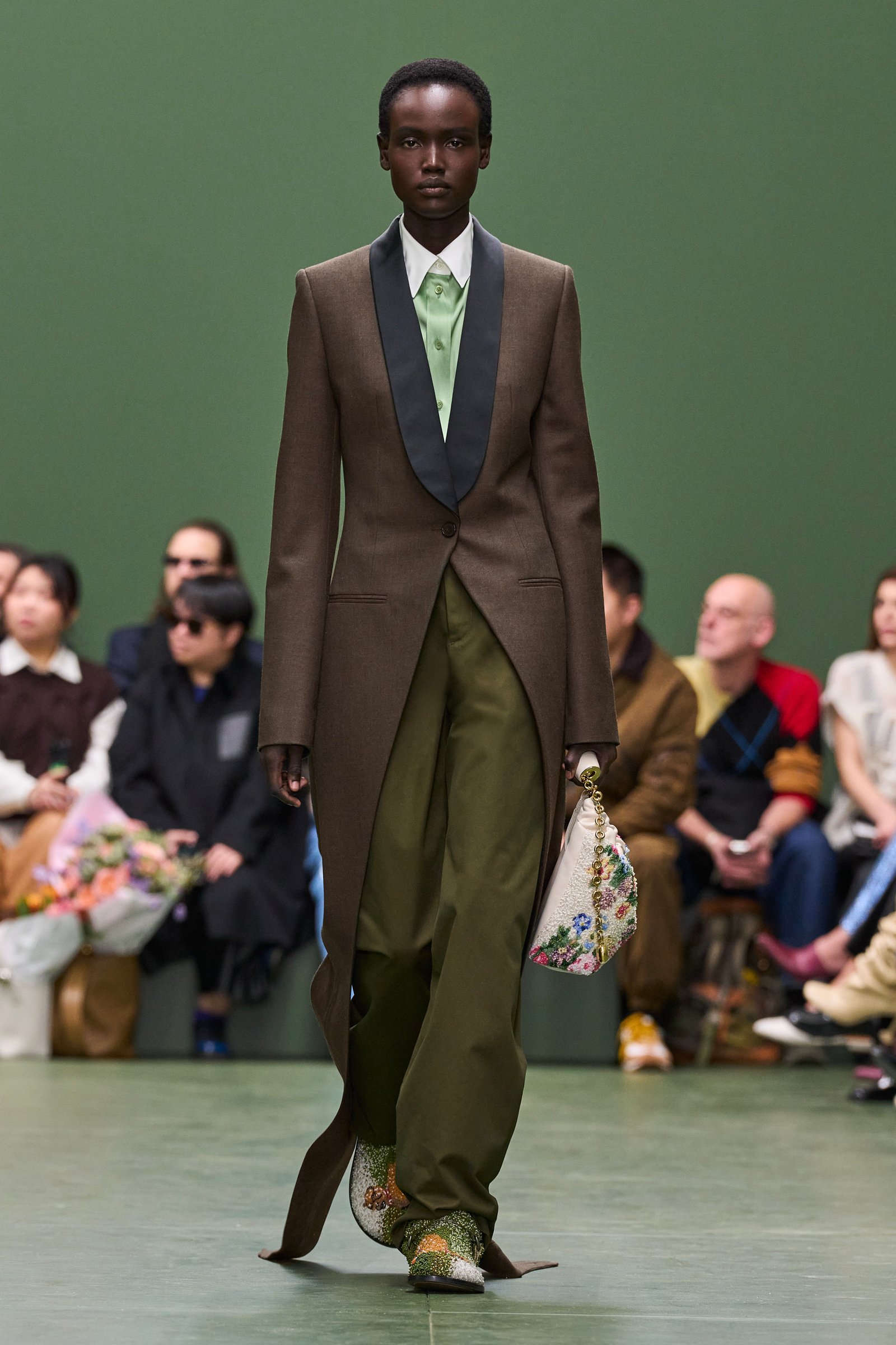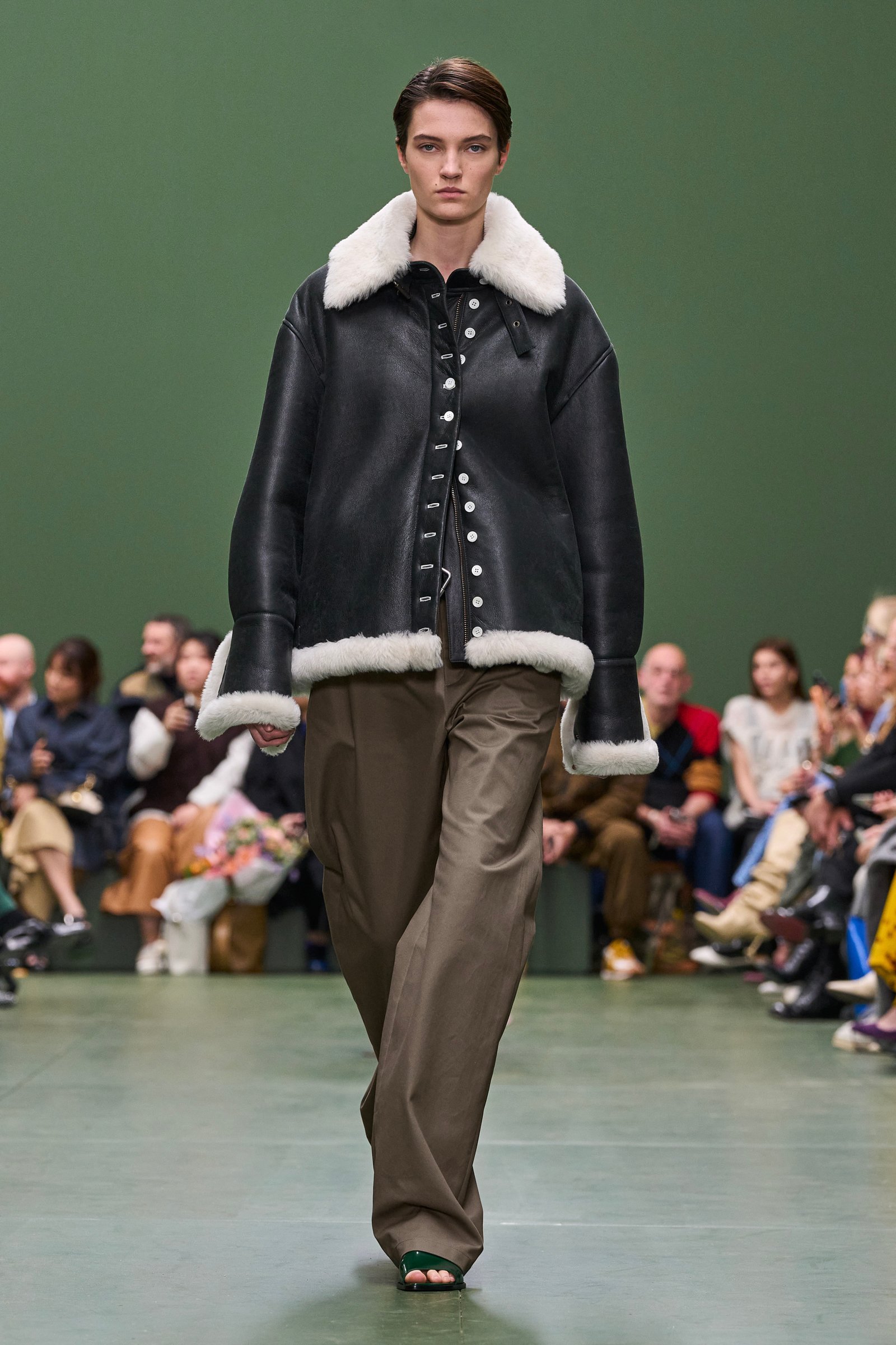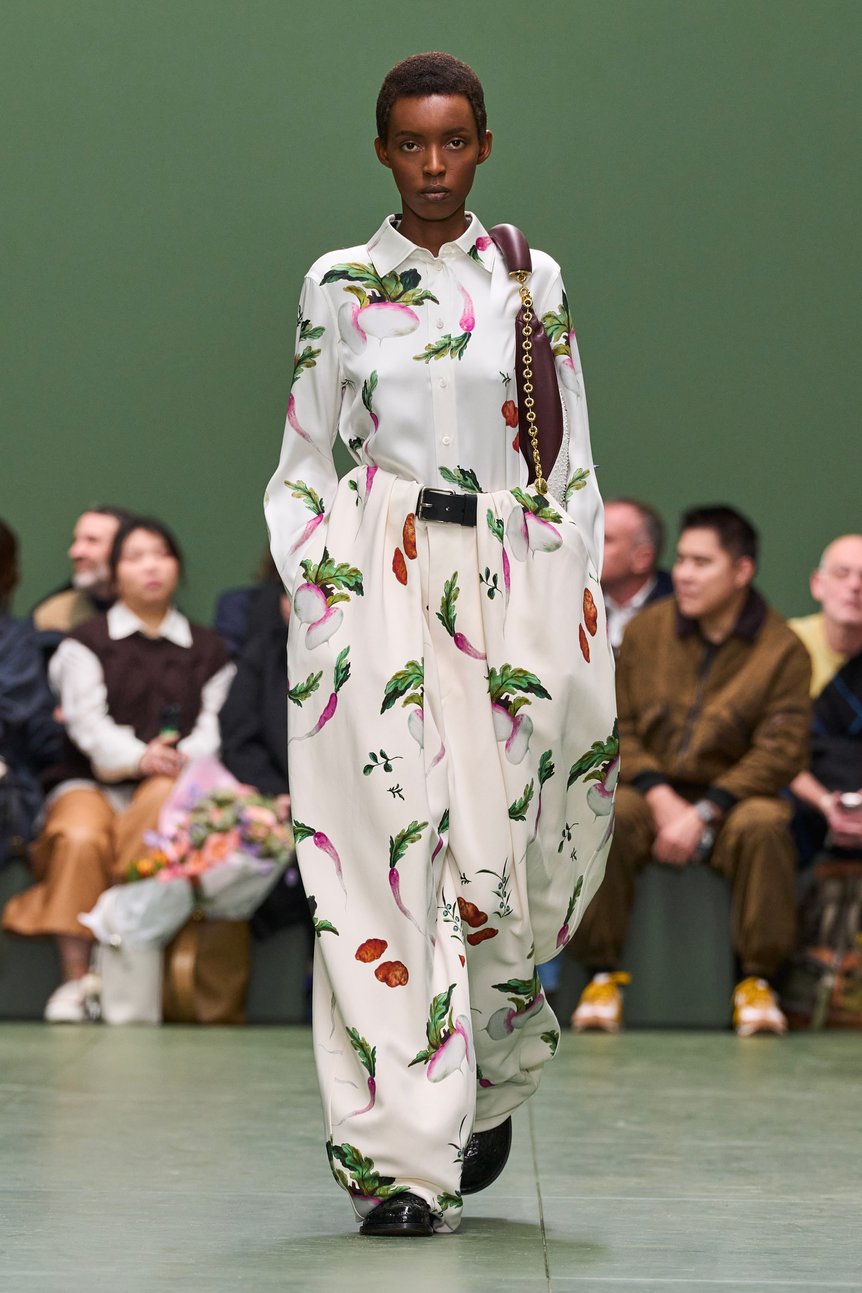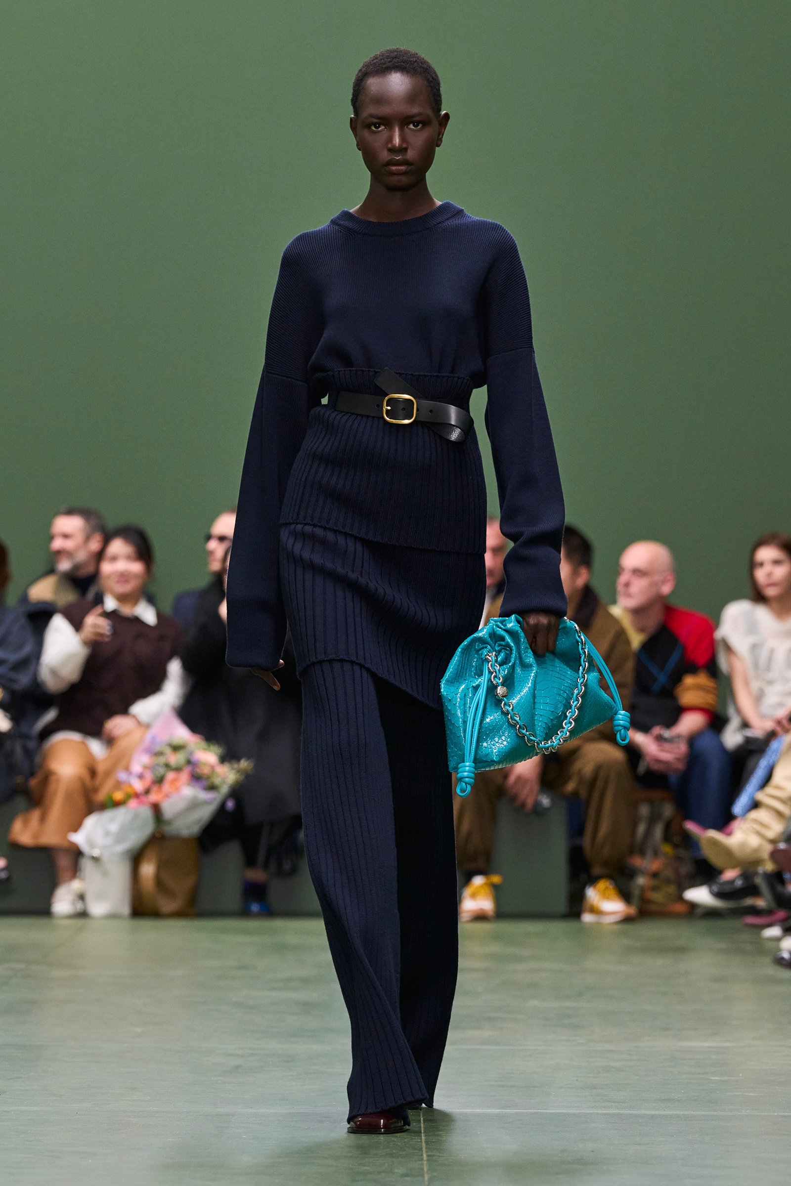 示唆に富んだハイパー・コンセプチュアルなコレクションは、「ロエべ」のコレクションの中でも最もクラフトに富んだコレクションのひとつとされ、クチュール的な技巧が際立っているのは確かだ。しかし、シャープなテーラード、バルーンパンツ、ベルトのアクセント、丸いシルエットのレザーブルゾンなど、プレーンなルックも負けずと力強い。ウェア、バッグ、アクセサリーの全てが、ただ単純に、洗練された魅力を備えていたことは特筆すべきポイントだろう。