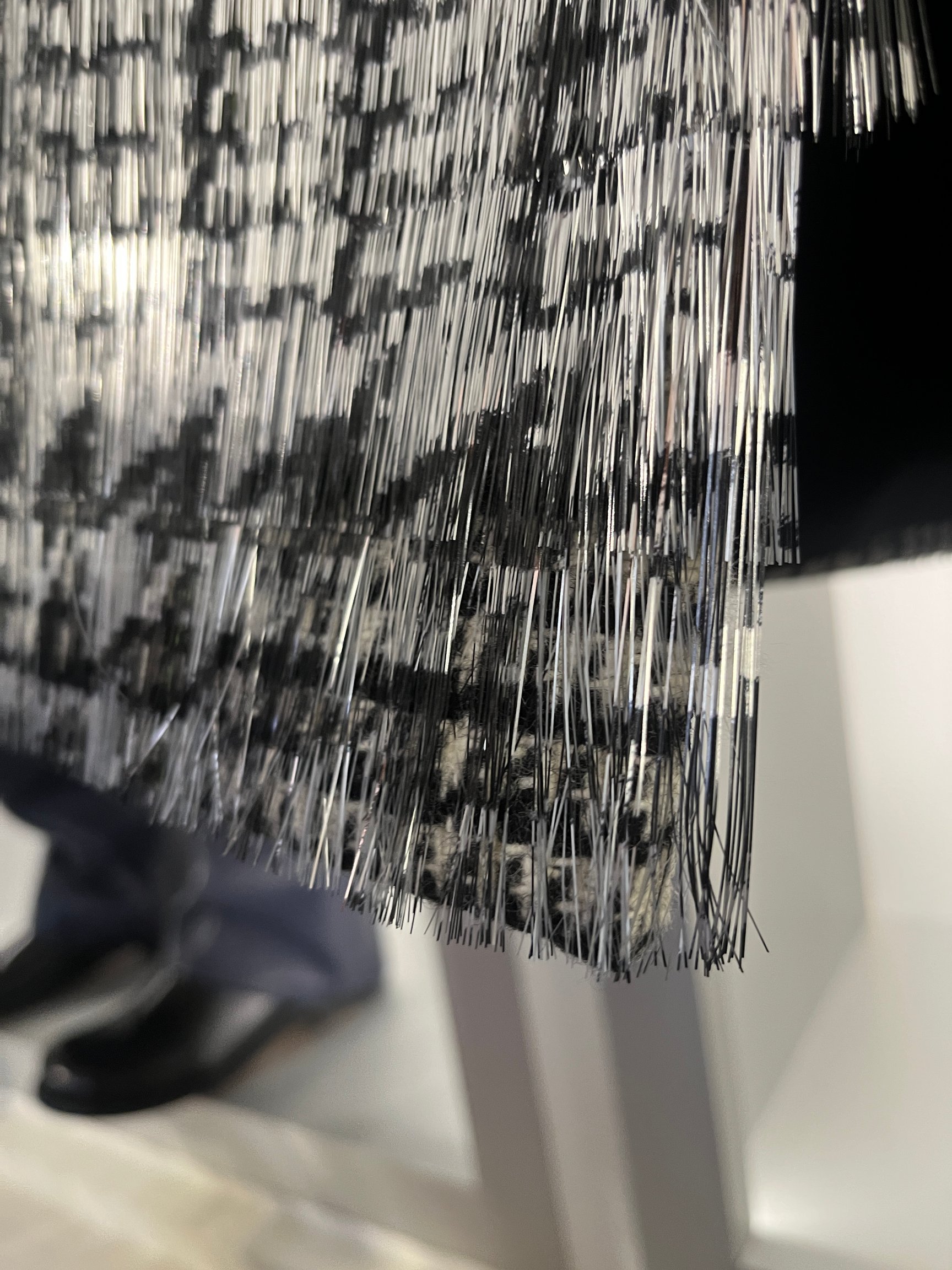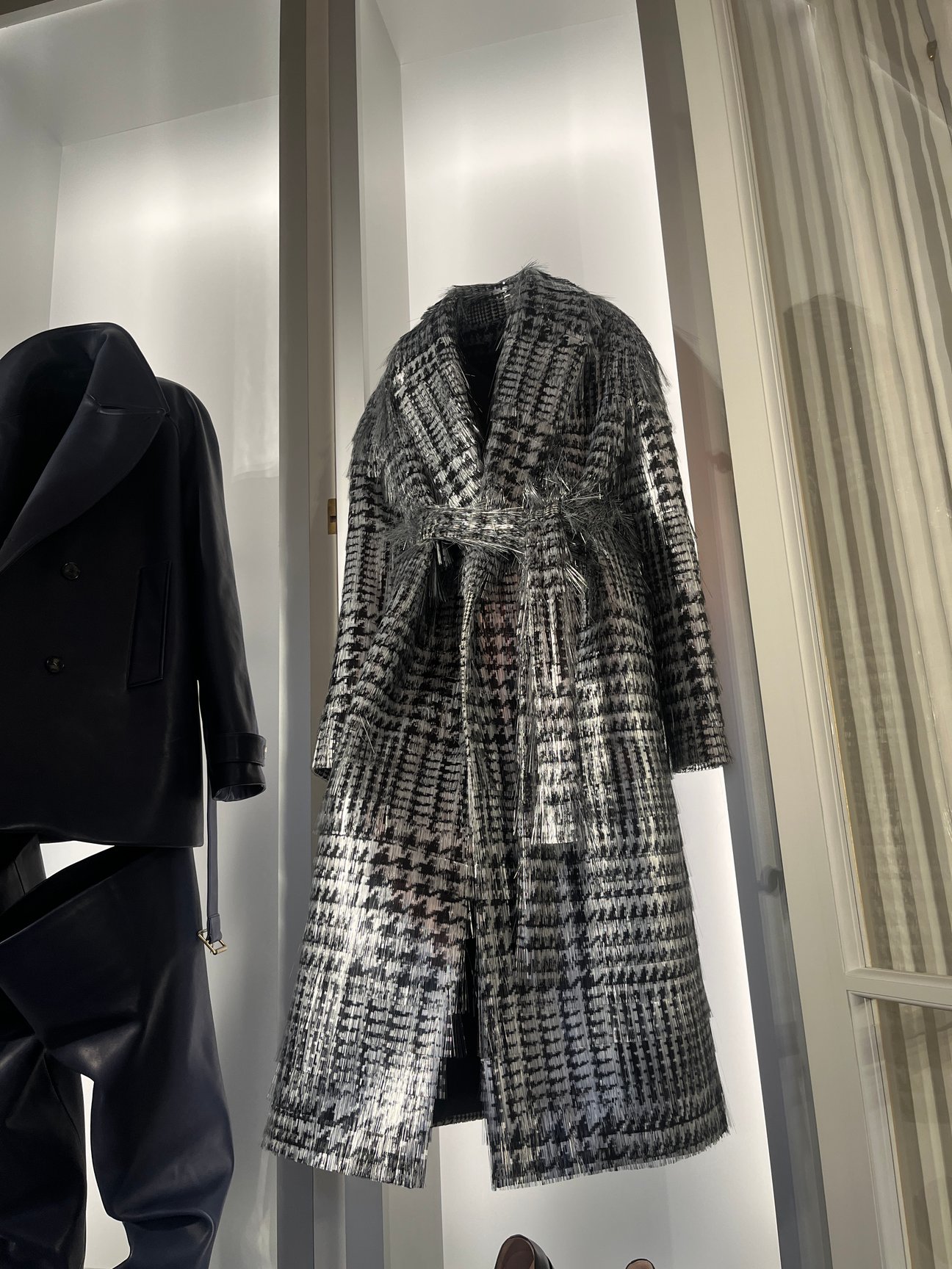 もちろん、ロエベらしいクラフトマンシップの探求は今季も継続。ビーズ付きオーガンザの糸を職人が一本一本撚り合わせたシースルードレスや、プリンスオブウェールズチェックのウール地に細かく割いたアルミニウムを重ね、その上から同じ柄をプリントする精巧な技法も披露された。