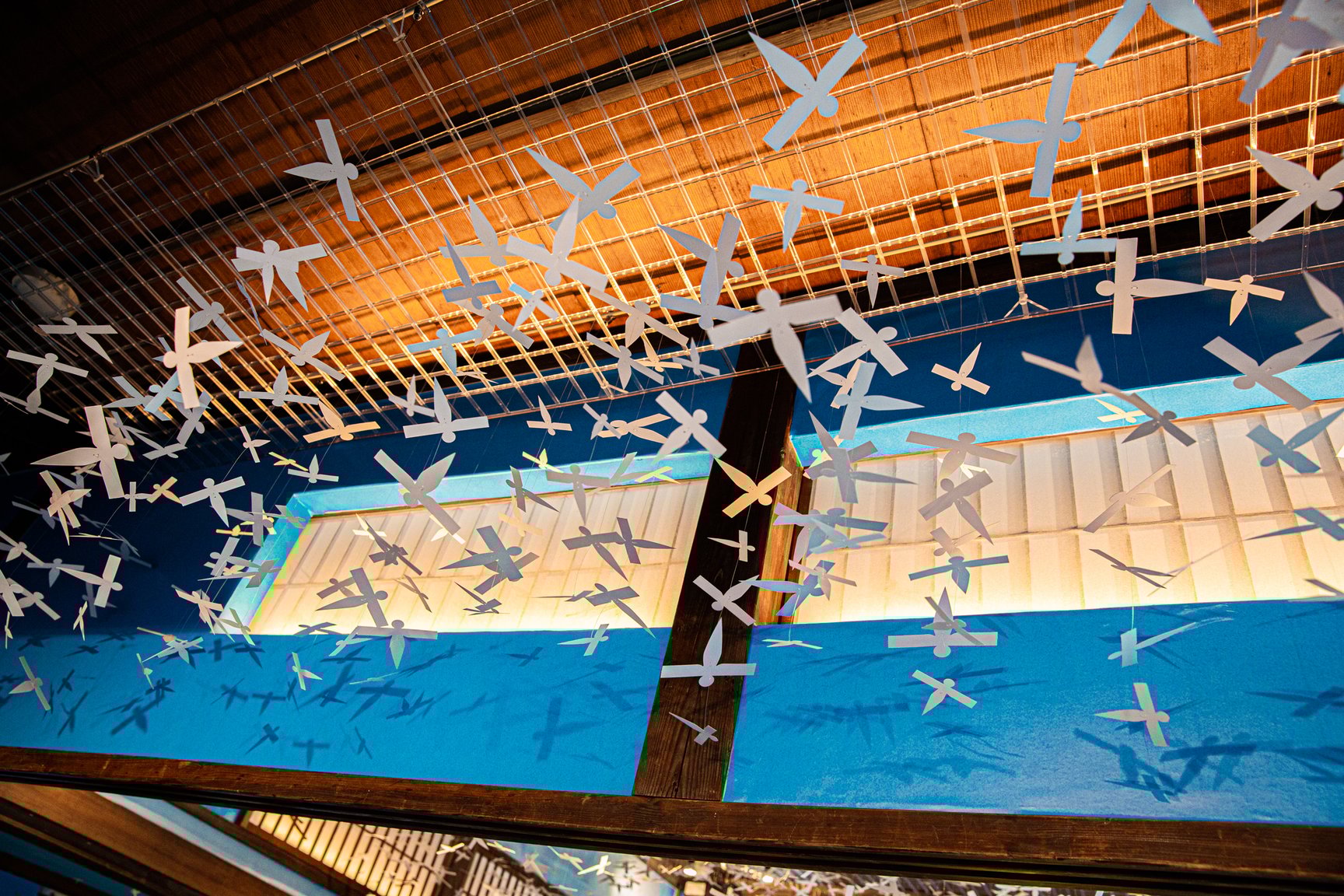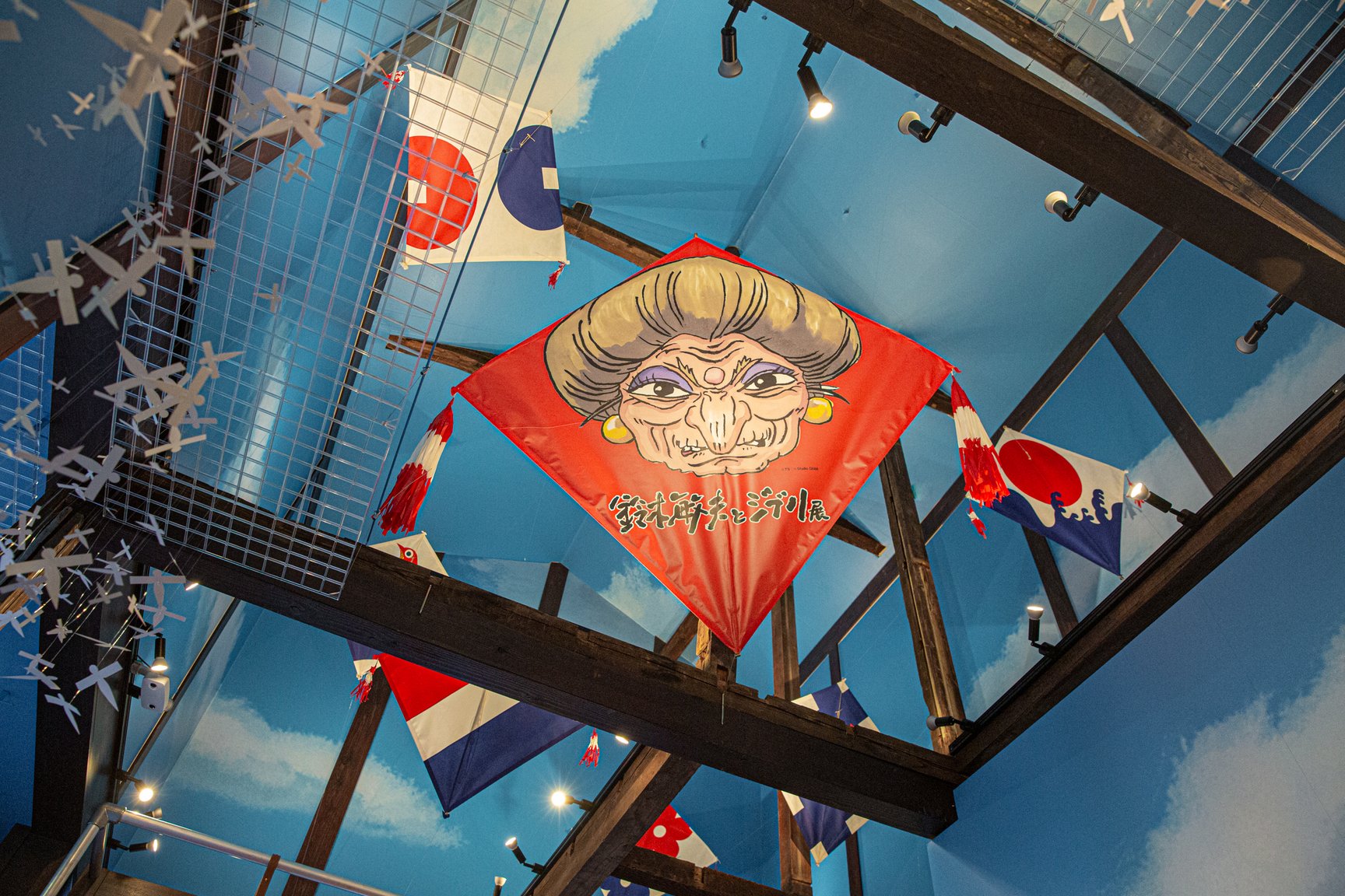 無数のヒトガタが天井を舞い、橋の向こう側には怪しげな湯屋。竜の姿で青空を飛ぶハクや、海原電鉄のシーンを再現したスポットも。神様たちが描かれた提灯、凧、書といった、スタジオジブリ所蔵の美術作品にも注目です。
