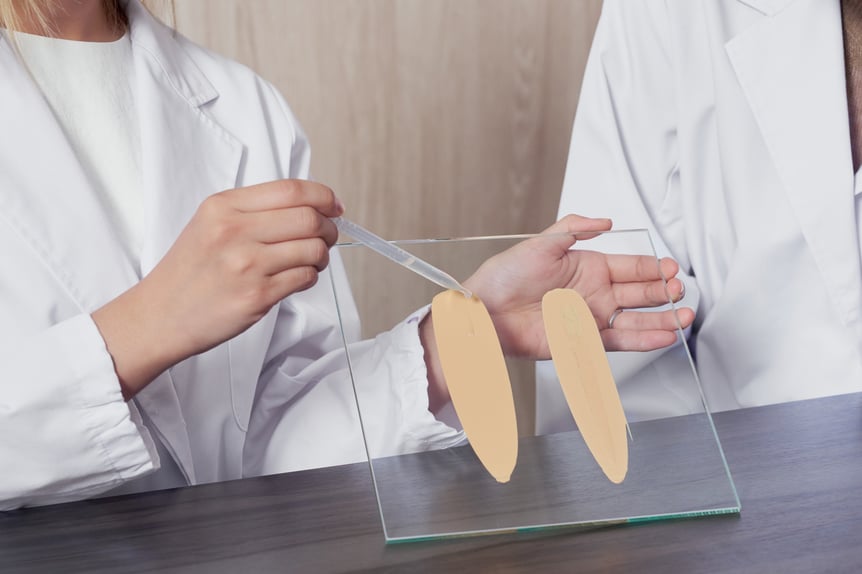 続いて訪れたのは、ファンデーションを開発している部門。日本のロレアル研究所が開発した「フレッシュメイクアップキーパー(FMK)」は、環境変化によるメイク崩れを防ぎ、ファンデーションの美しい仕上がりを長時間キープするテクノロジーです。特に、高い湿度やマスク着用でファンデーションがヨレやすい状況でも、その影響を受けにくい処方となっています。ガラス板に塗ったファンデーションに擬似的に汗や皮脂を垂らし、そのメイク崩れの状態を確認します。