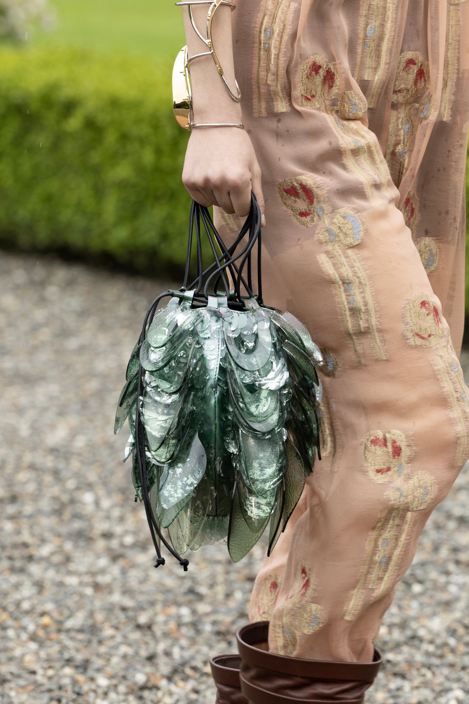 ステンドグラスや壁紙、カーテン風のテキスタイルは、クラシカルな建築物のマテリアルを想起させる。また貝殻風の刺繍は、ボッロメオ宮殿の地下にあるグロッタ(貝殻や石で埋め尽くされた洞窟)のよう。構築的なジャケットに用いたガルーシャ(エイ革)、イカリ型のボタン、貝殻型のバッグなど、海の要素も取り入れられている。