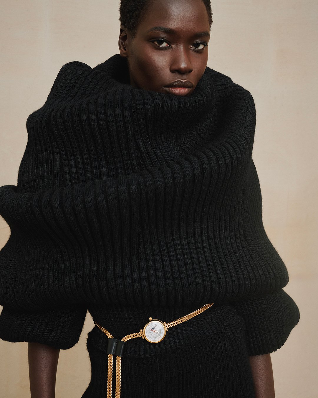 ラストルックを飾ったチェーンベルトには、歴史あるタイムピース「LV I」が飾られていた、これは1988年にイタリア人デザイナーのガエ・アウレンティによってデザインされたメゾン初の腕時計で、鉄道の線路を模した文字盤が特徴となっている。