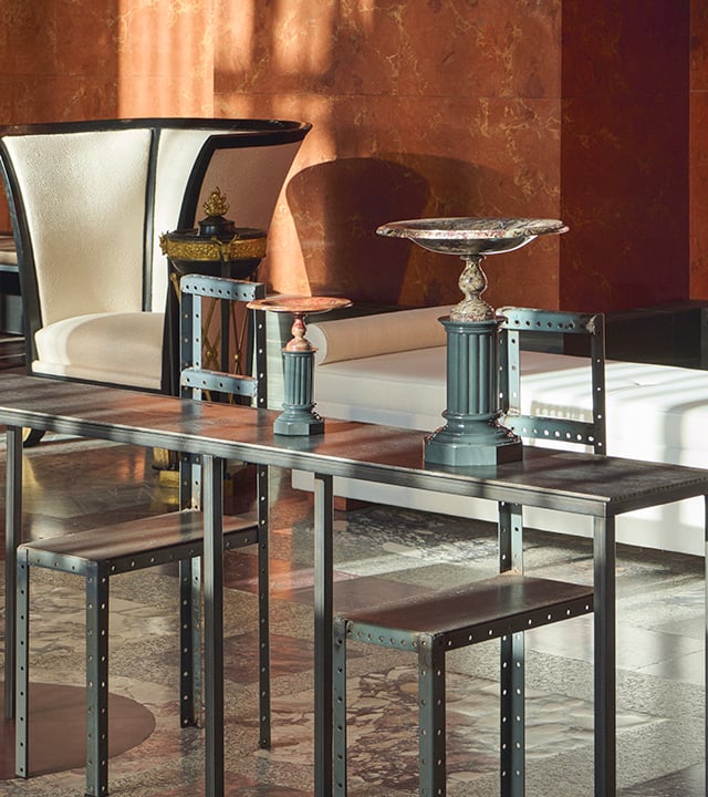 ビーズのフリンジなど繊細な刺繍がふんだんに施され、クラシカルなレリーフや、タペストリーから着想された色柄など、コントラストが効いた多様なスタイルがインテリアに調和する。